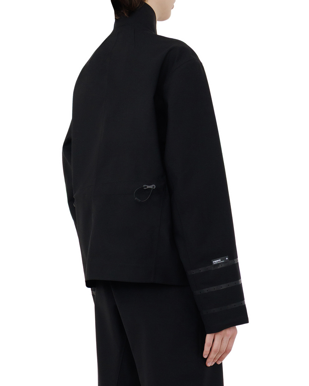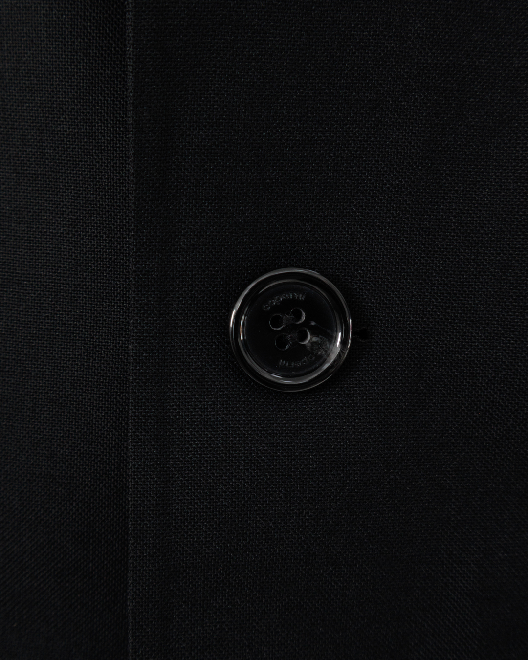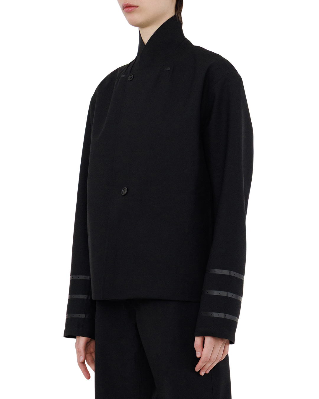 Чёрный жакет с высоким воротником-стойкой излучает сдержанную элегантность. Укороченный крой придаёт современности, а лаконичная застёжка на две пуговицы подчёркивает строгость силуэта. Манжеты украшены тонкими декоративными полосами — деталь, добавляющая изысканности без излишеств. Чистые линии и минимализм отделки делают модель универсальной: она легко впишется в деловой или вечерний образ, сохраняя утончённость.