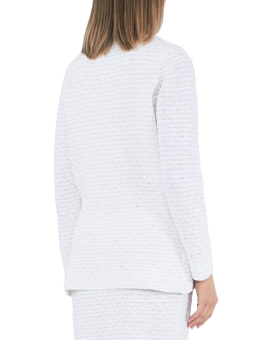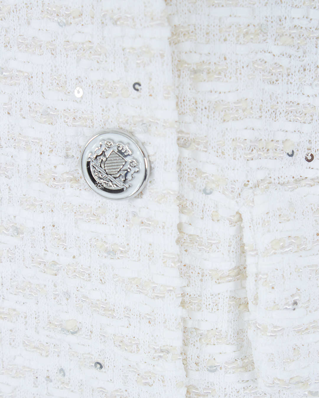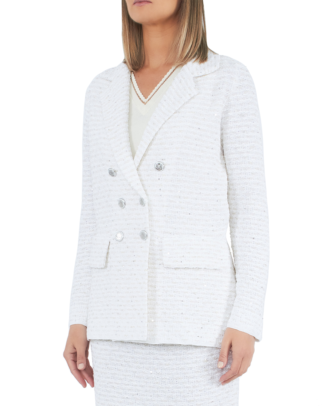 Жакет из твидовой вискозы с добавлением хлопка. Модель приталенного силуэта с застежкой на пуговицы дополнена двумя карманами с планками и отложным воротником.