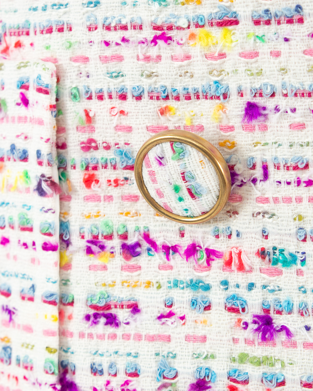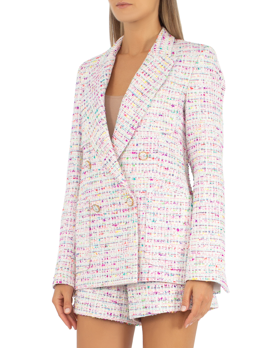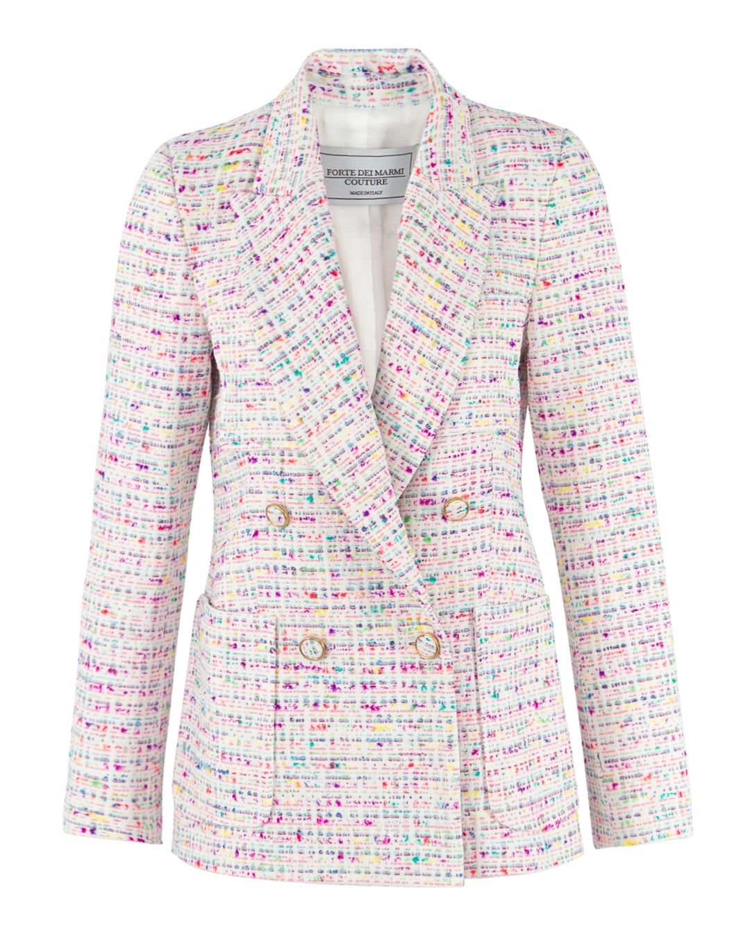 Буклированный жакет Forte Dei Marmi Couture сшит из вискозы в цветную крапинку. Приталенный силуэт с двубортной застежкой на пуговицы дополнен двумя карманами и отложным воротником.