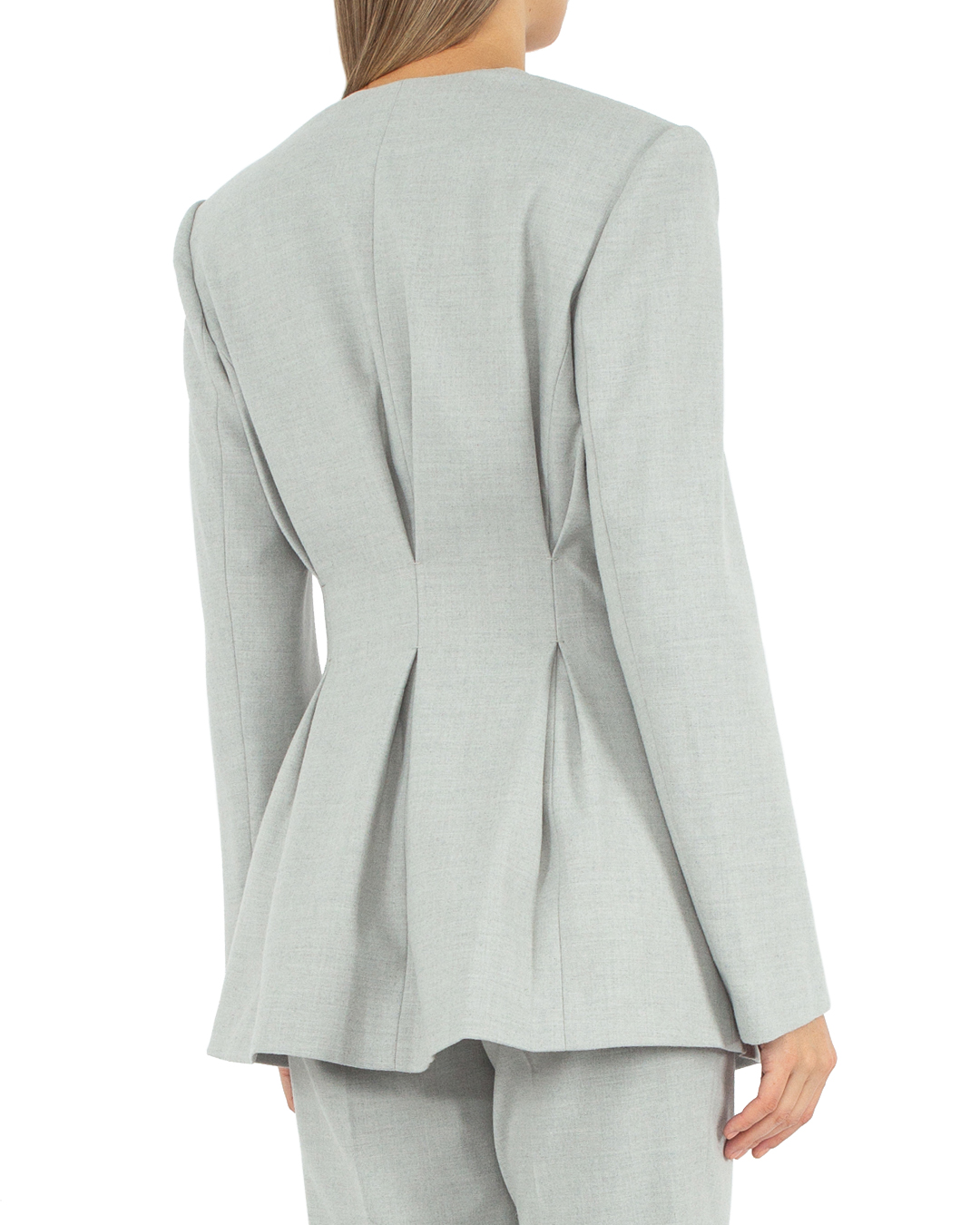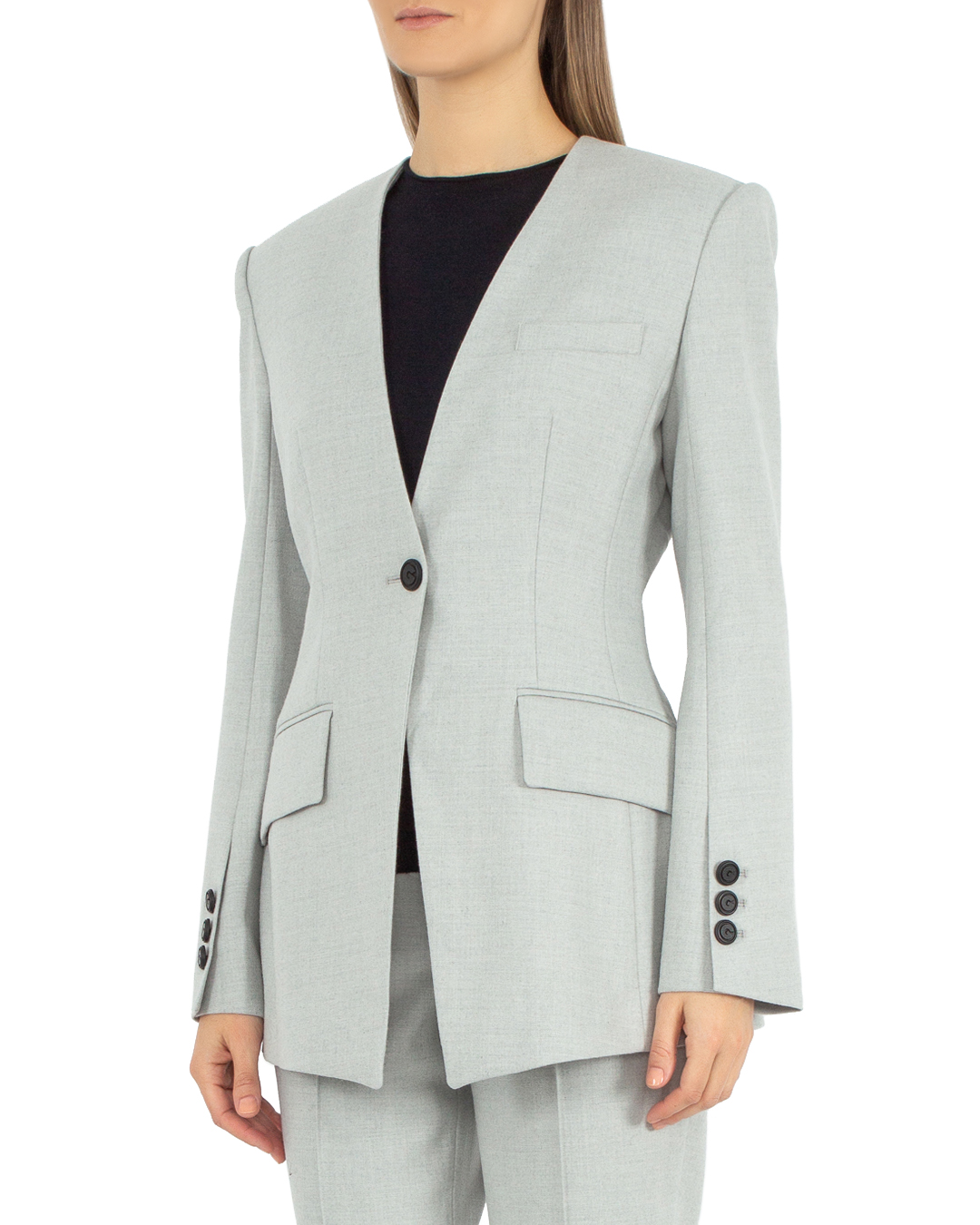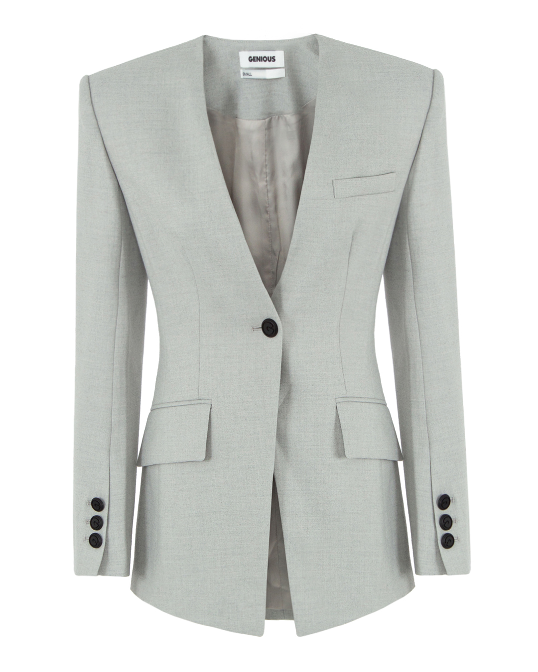 Жакет GENIOUS из комбинированного костюмного материала с добавлением вискозы и шерсти. Модель приталенного силуэта с застежкой на пуговицу дополнена двумя карманами по бокам с клапанами.