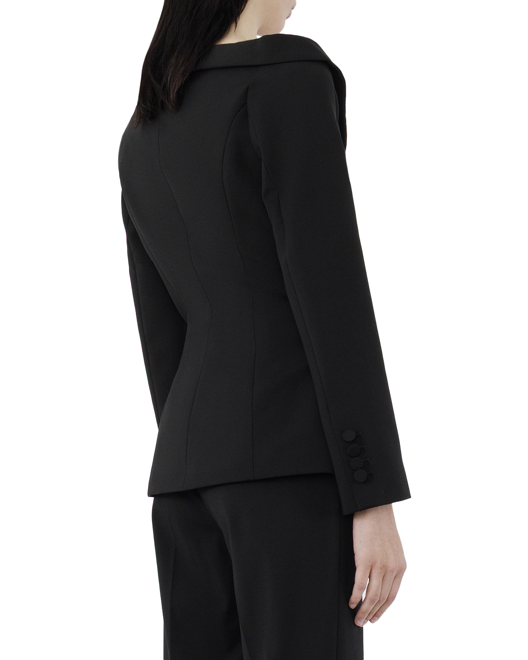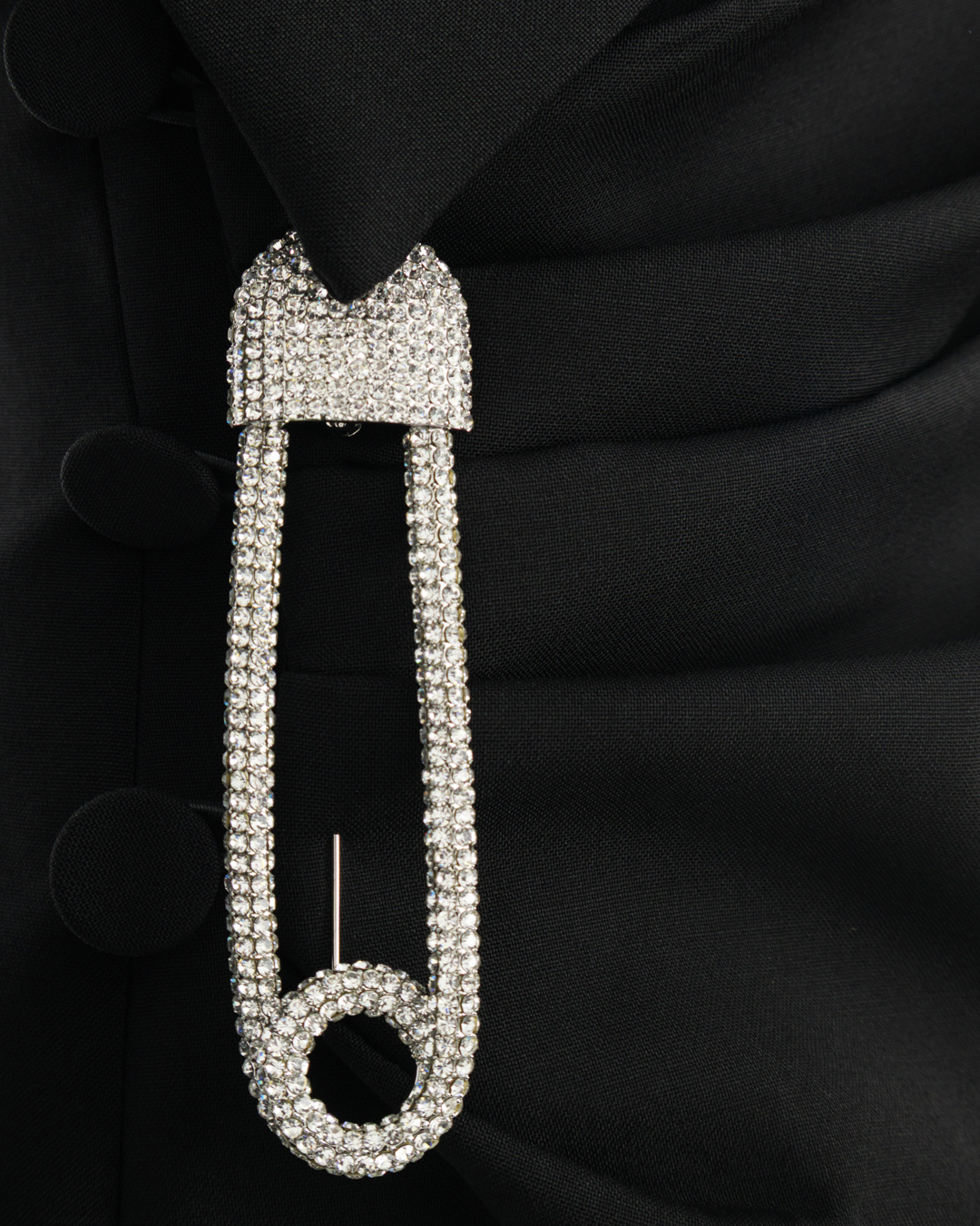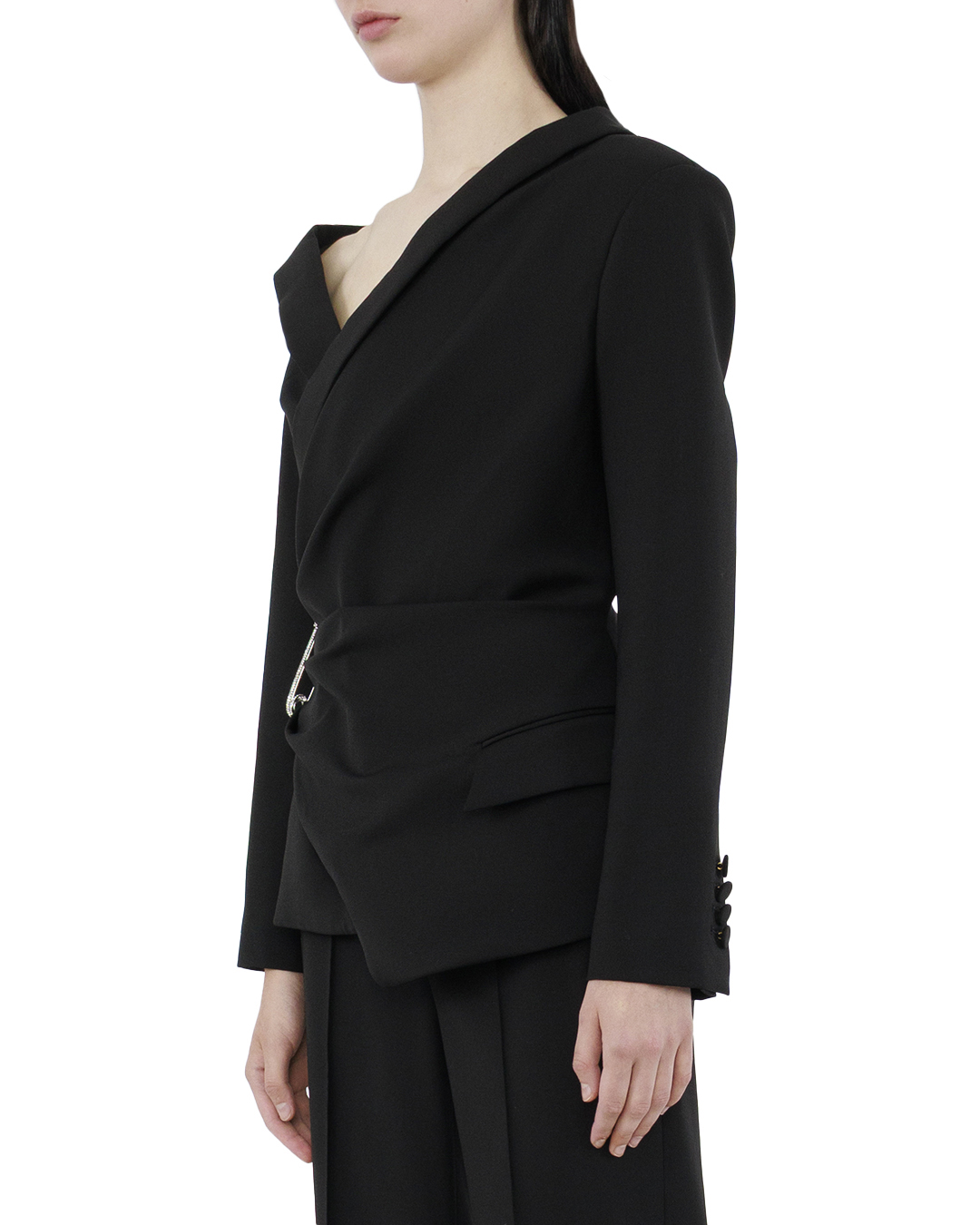 Этот шикарный жакет — воплощение утонченной элегантности и современного дизайна. Изготовленный из гладкой ткани насыщенного чёрного цвета, он гармонично вписывается в любой гардероб, придавая образу особую изысканность. Асимметричный крой создаёт интересные визуальные линии, которые подчёркивают современность и индивидуальность. Линия плеча мягко акцентирована, создавая женственный и утонченный силуэт. Изюминкой дизайна служит декоративная застёжка с инкрустированными блестящими элементами, добавляющая нотку роскоши и привлекающая внимание к талии. Этот элемент является фокусным акцентом и непринужденно сочетается с общим минимализмом. Элегантные драпировки на полочках добавляют динамичности и объёма, создавая эффект движения в статике. Тонкая атласная подкладка обеспечивает комфорт и приятные ощущения при носке. Жакет прекрасно дополнит как вечерний, так и деловой образ, подчёркивая вашу индивидуальность и чувство стиля.