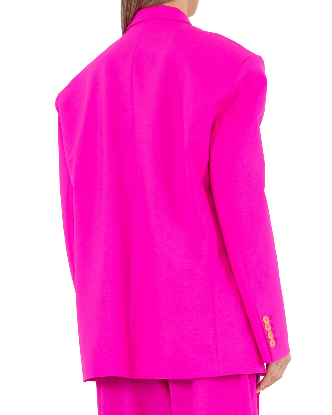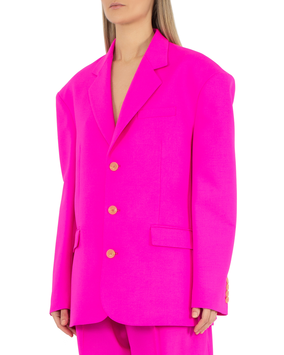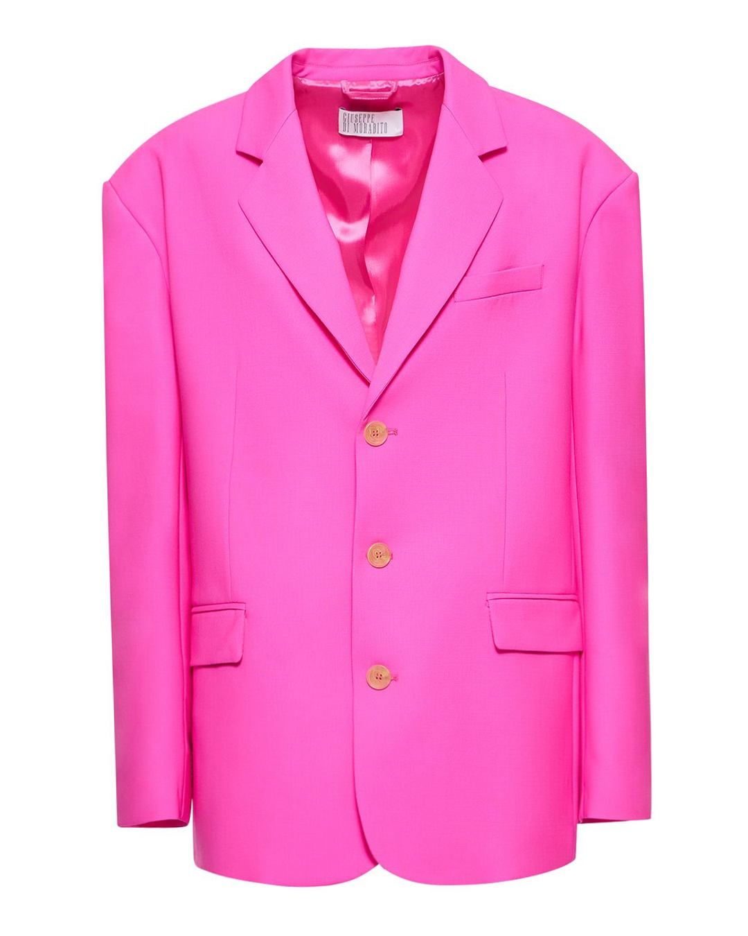Жакет Giuseppe Di Morabito сшит из шерсти яркого оттенка фуксии. Изделие oversize прямого силуэта с двубортной застежкой на пуговицы и двумя прорезными карманами с клапанами по бокам.