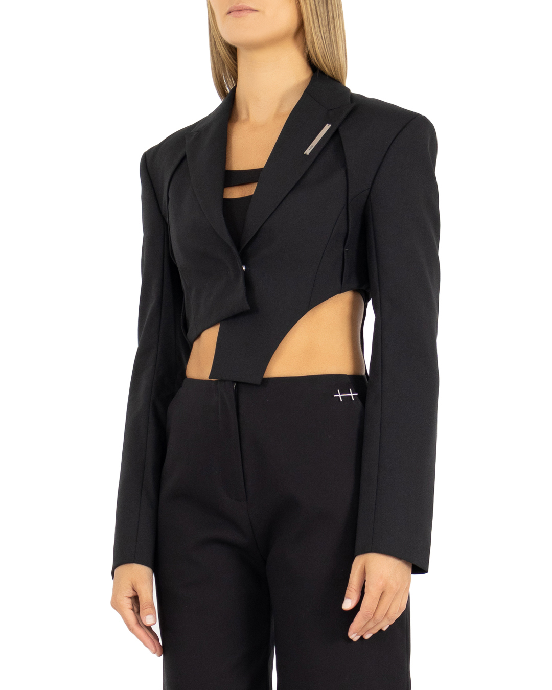 Жакет HELIOT EMIL из шерсти и мохера черного цвета. Модель сложного кроя укороченного силуэта.
