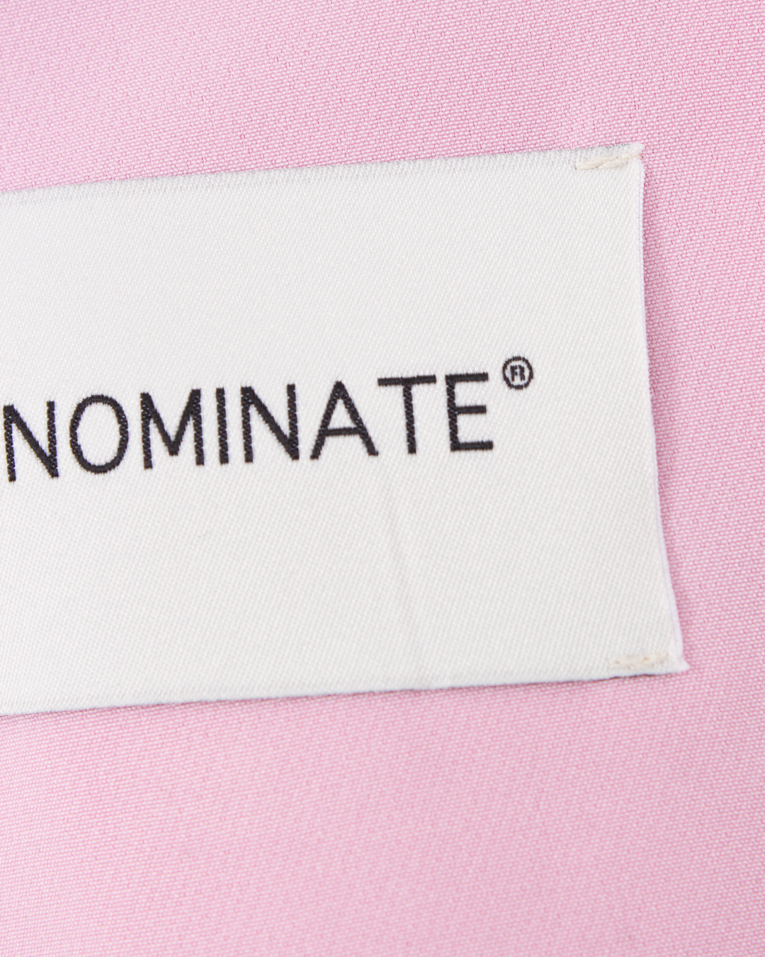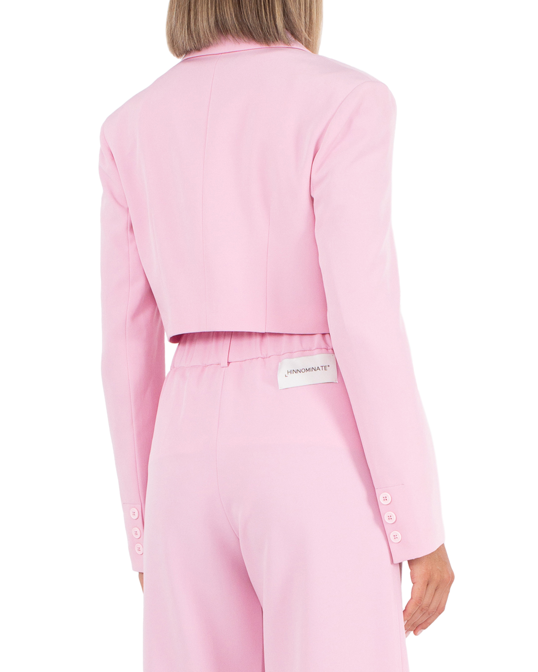 Укороченный жакет HINNOMINATE из крепа нежного розового оттенка. Модель полуприлегающего силуэта с застежкой на пуговицу и отложным воротником.