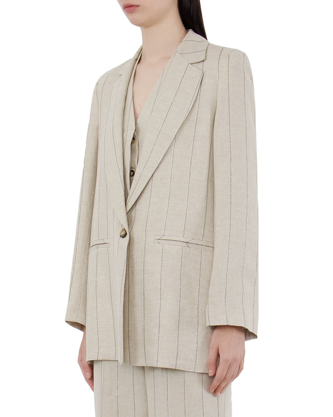 Этот жакет — воплощение современного шика и утонченной элегантности. Искусно выполненный из лёгкой ткани с вертикальной полоской, он визуально вытягивает силуэт, придавая фигуре стройность и изящество. Прямой крой и слегка удлиненная форма добавляют изделию модный и расслабленный характер. Классические лацканы придают строгую элегантность, идеально подчеркивая V-образный вырез. Однобортная застёжка с крупной пуговицей обеспечивает стильный акцент и завершает общий вид. Карманы с клапанами добавляют функциональность без лишних деталей, сохраняя лаконичность и изысканность. Нежный бежевый тон в сочетании с тонкими полосами делает этот жакет универсальным выбором как для офисных образов, так и для более неформальных встреч. Этот предмет гардероба легко сочетается с брюками и юбками, создавая гармоничные и стильные ансамбли для любого случая.