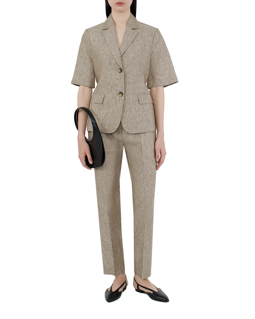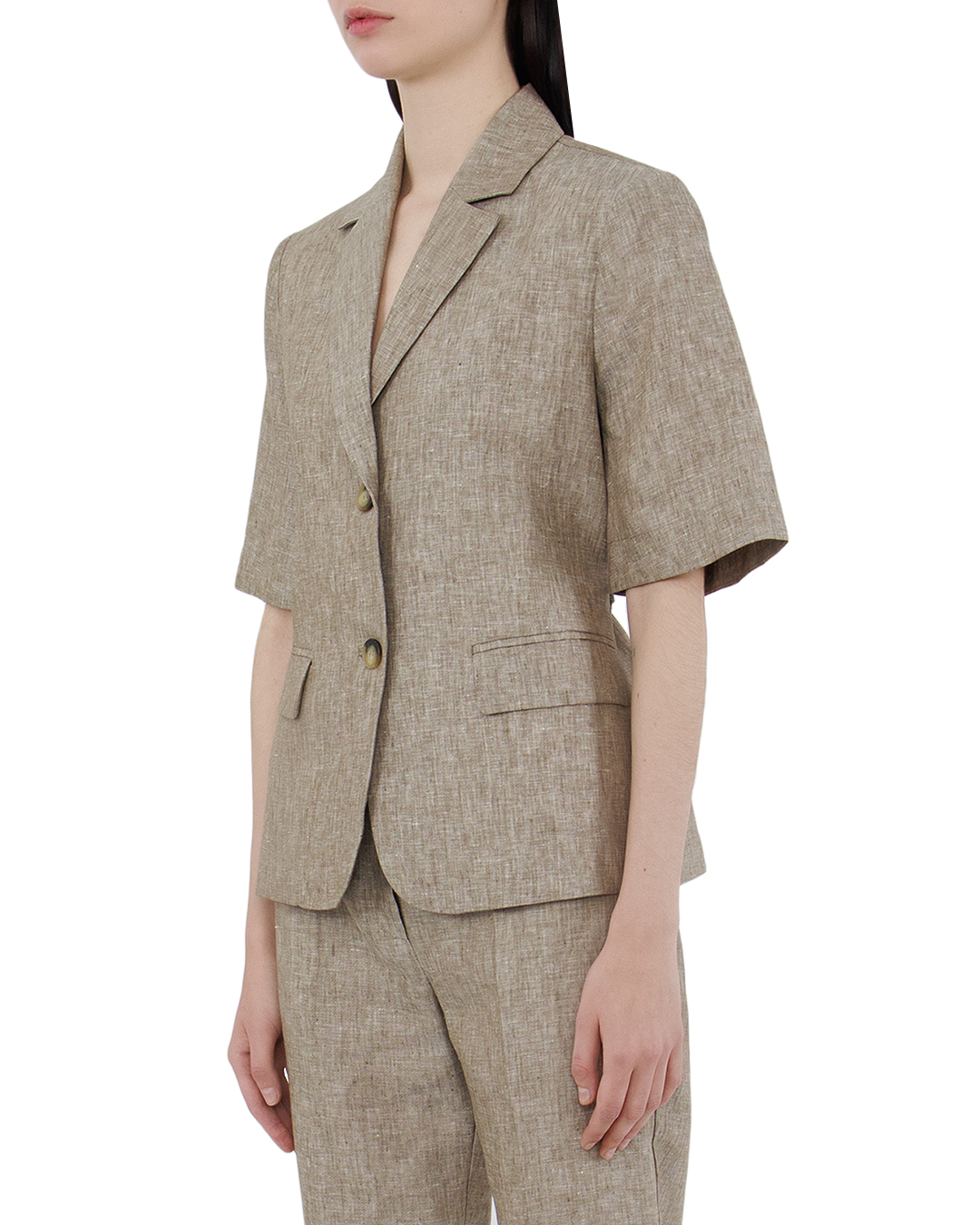 Этот жакет — квинтэссенция стиля и утонченности с легким налетом ретро-шика. Изготовленный из льна натурального бежевого оттенка, он прекрасно подходит для теплых сезонов, даря комфорт и изящный вид. Полуприталенный силуэт с короткими рукавами и аккуратно проработанной линией плеч создаёт гармоничный и сбалансированный образ. Классические лацканы добавляют структуру и строгую элегантность, в то время как крупные пуговицы служат эффектной деталью, привнося дополнительный акцент. Клапанные карманы подчеркивают практичность и придают жакету декоративное завершение. Текстура ткани придаёт глубину и интерес к дизайну, делая его универсальным элементом гардероба для создания многослойных образов. Этот жакет идеально сочетается с брючными костюмами или легкими платьями, добавляя нотку изысканности и лёгкой непринужденности.