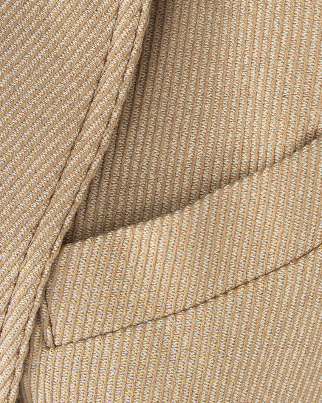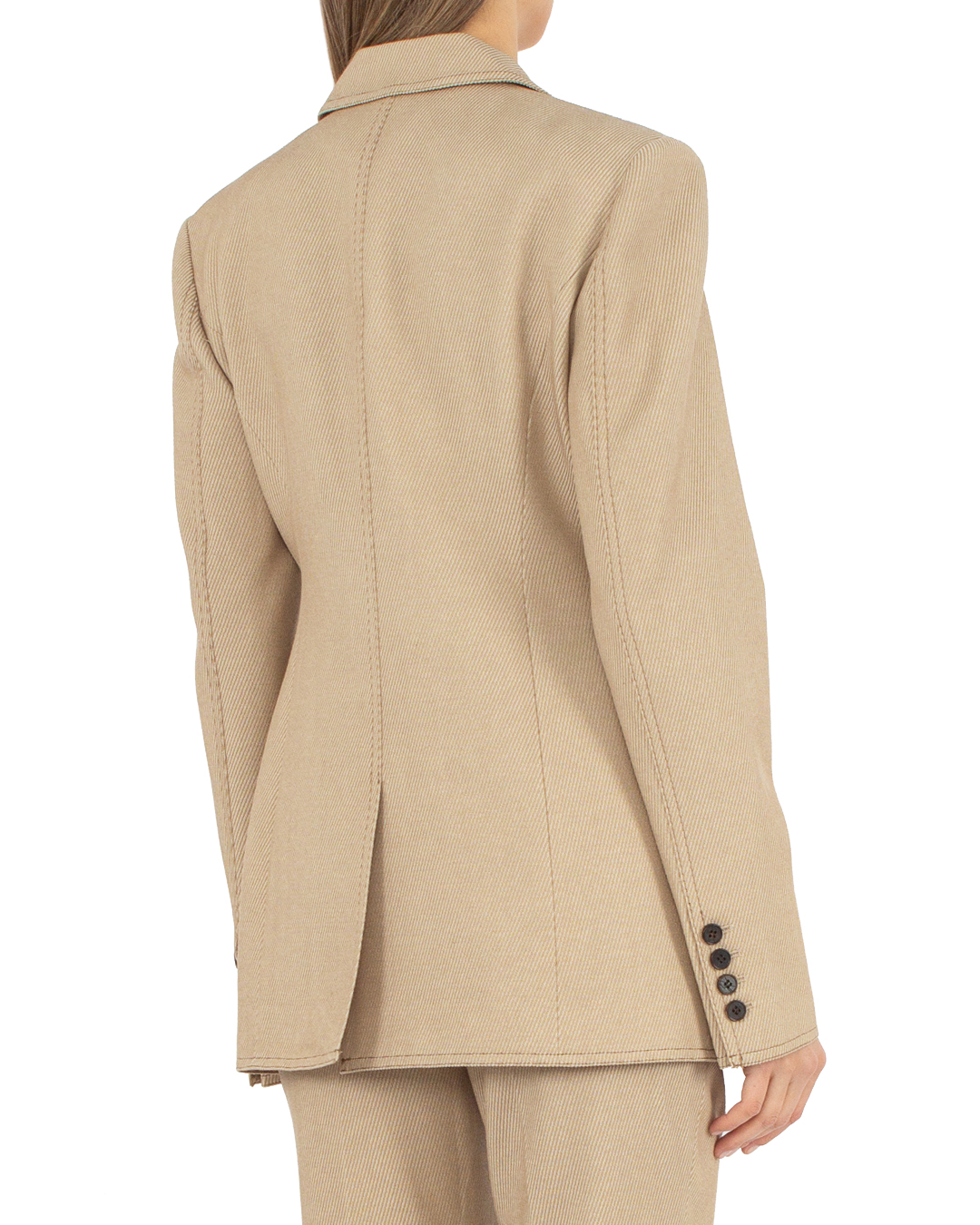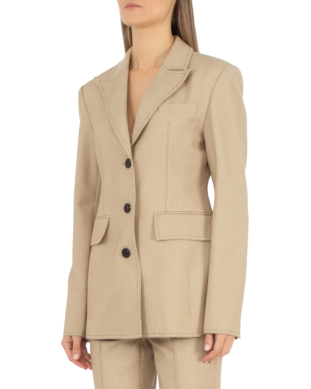 Жакет LVIR из плотного материала бежевого оттенка в рубчик. Модель приталенного силуэта с застежкой на пуговицы и двумя прорезными карманами с клапанами.
