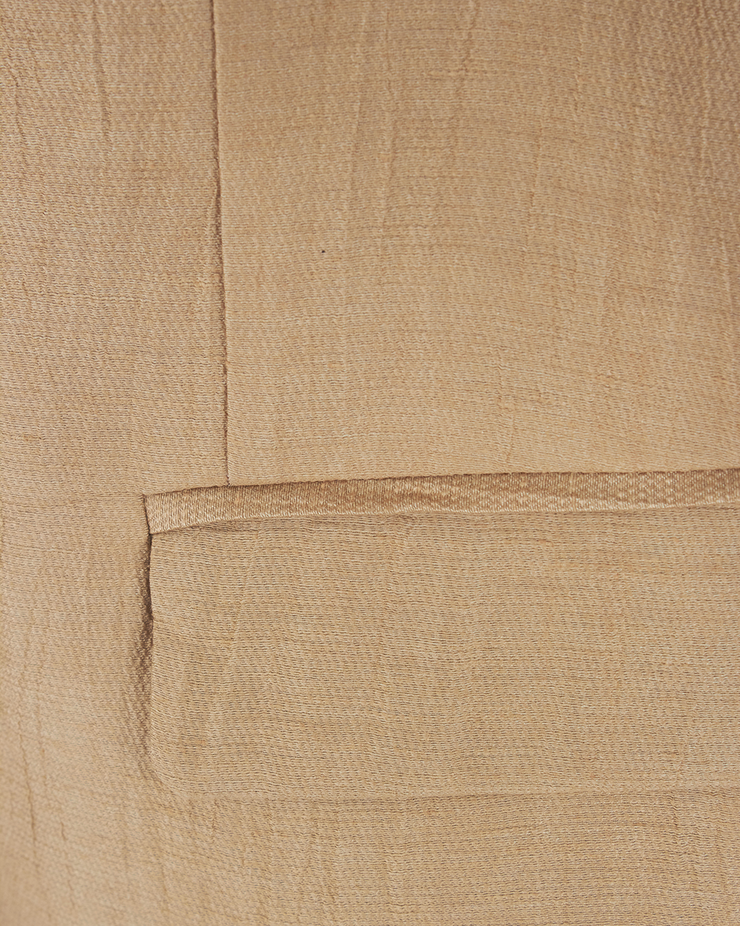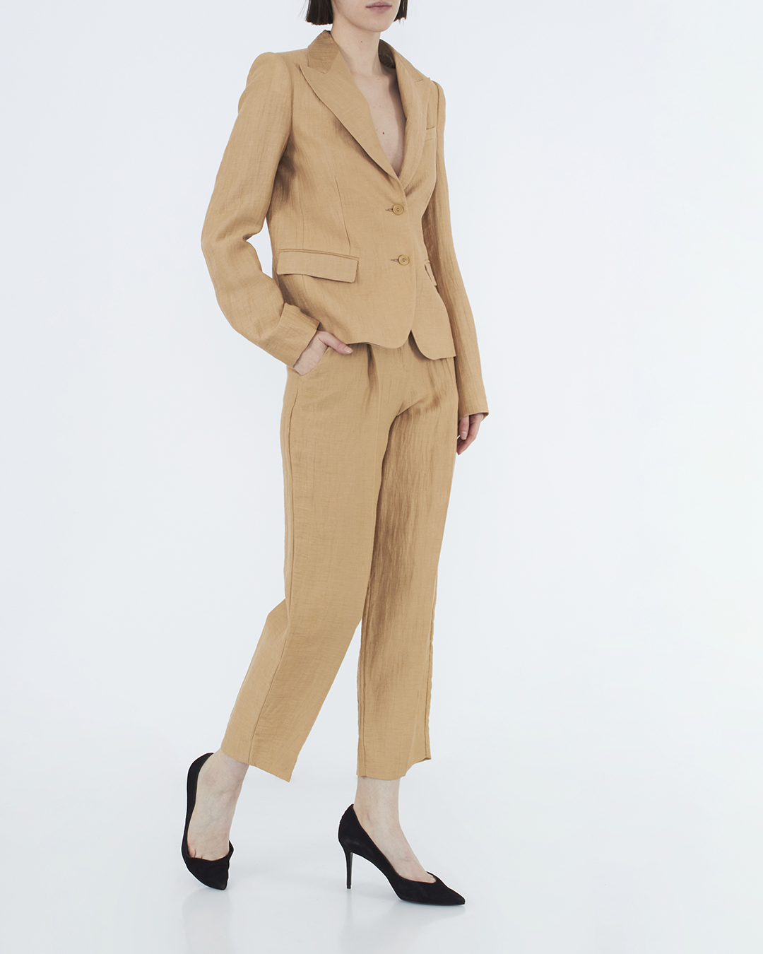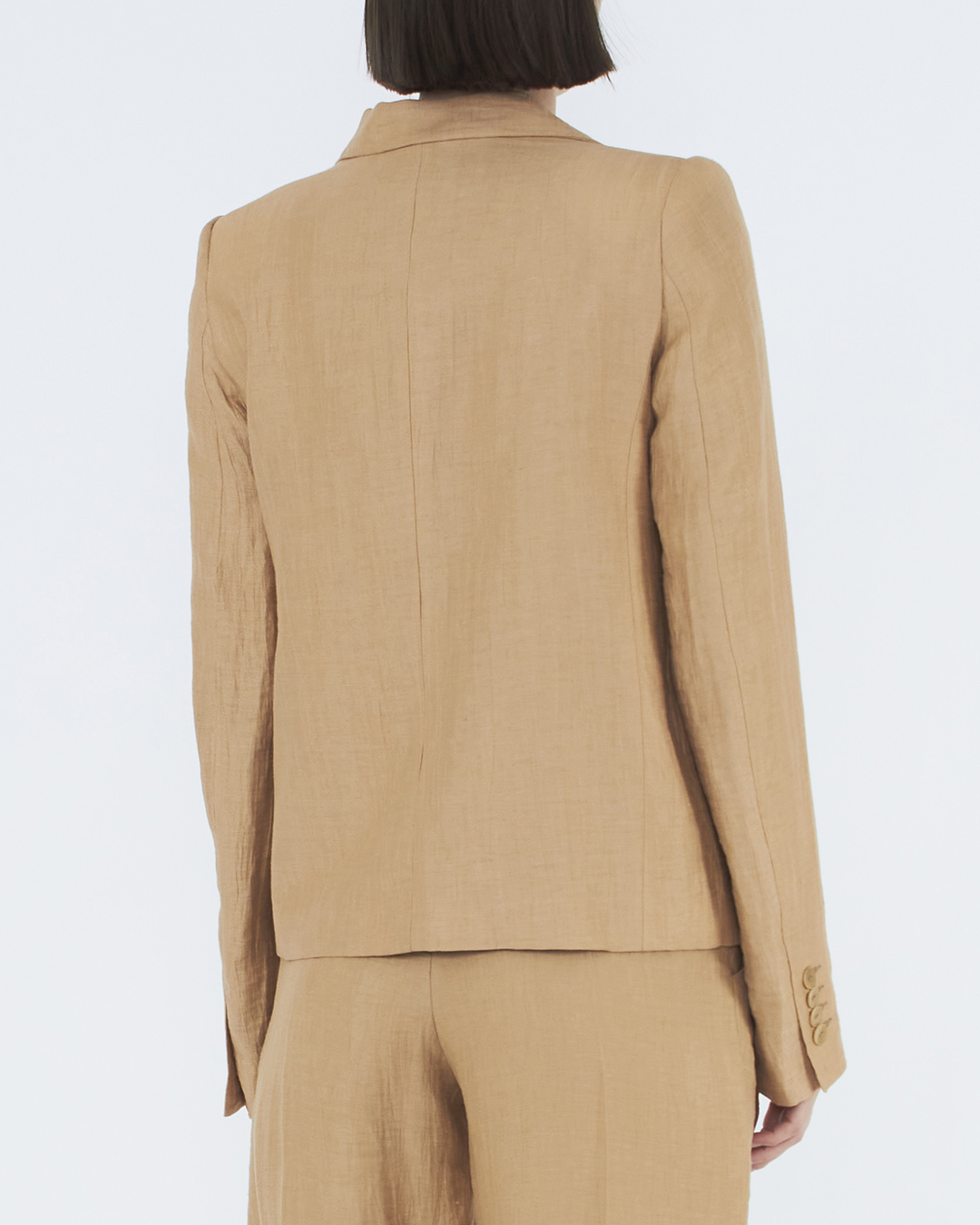 Жакет изо льна бежевого оттенка. Модель прямого силуэта с застежкой на пуговицы и двумя прорезными карманами по бокам.
