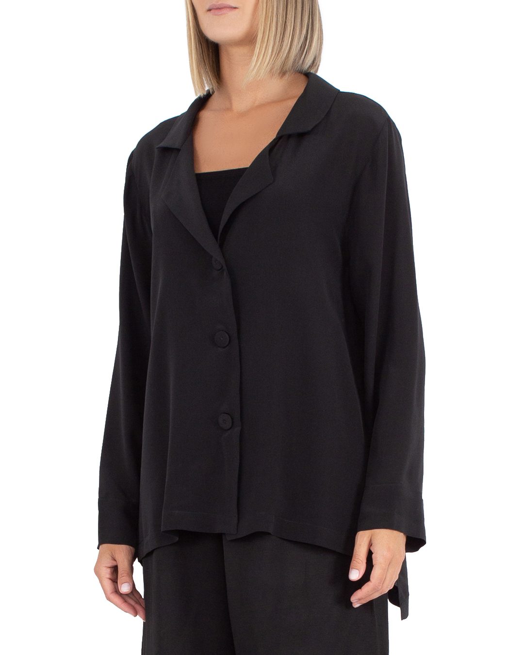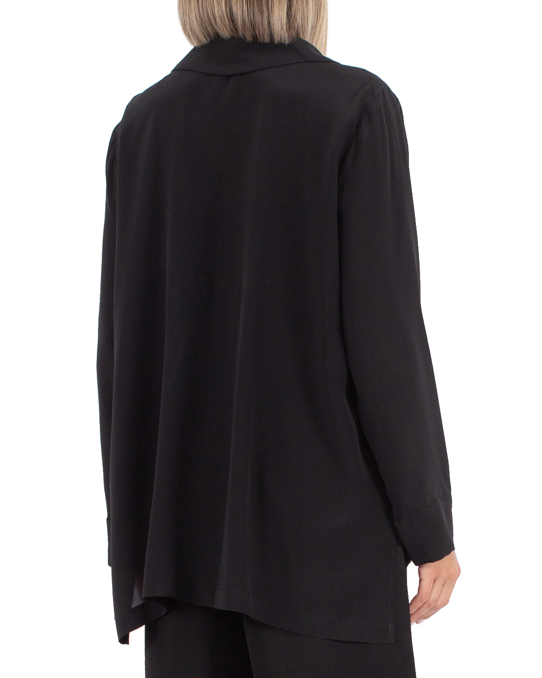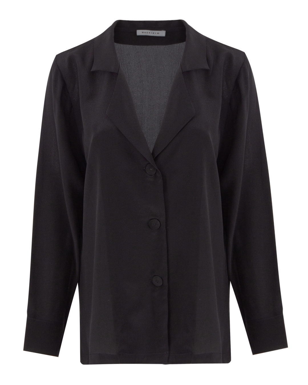 Блуза MAURIZIO выполнена из шелка черного цвета. Модель прямого свободного силуэта с застежкой на пуговицы и отложным воротником.