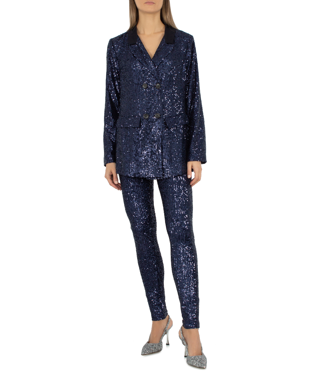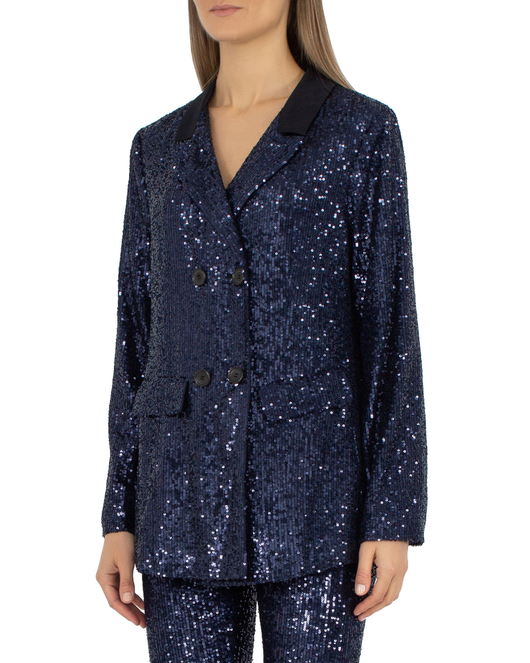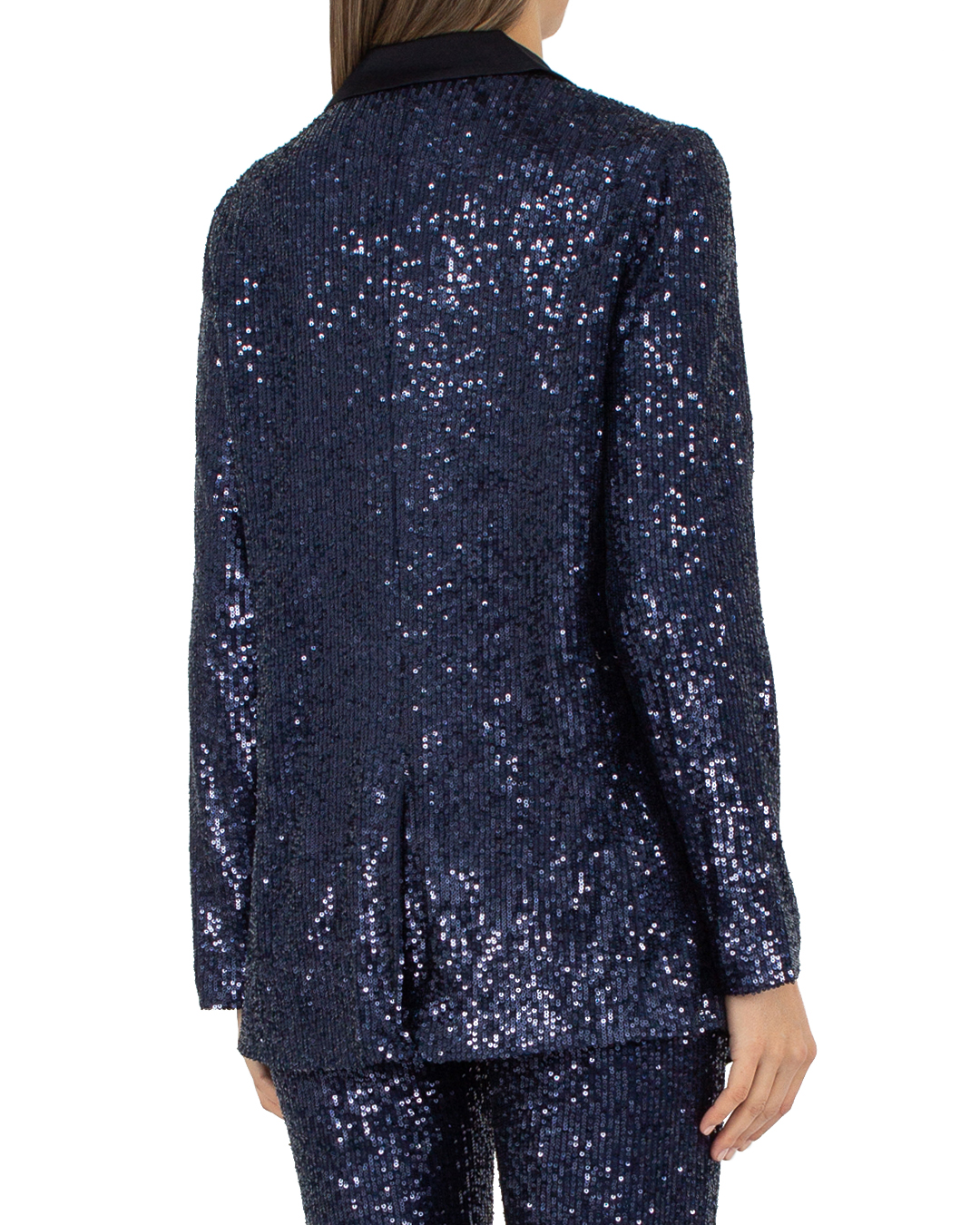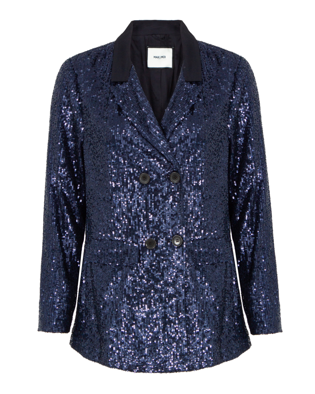 Жакет MAX&MOI из эластичного материала с отделкой блестящими пайетками. Прямой свободный силуэт с застежкой на пуговицы дополнен двумя карманами и отложным воротником.
