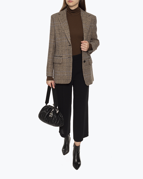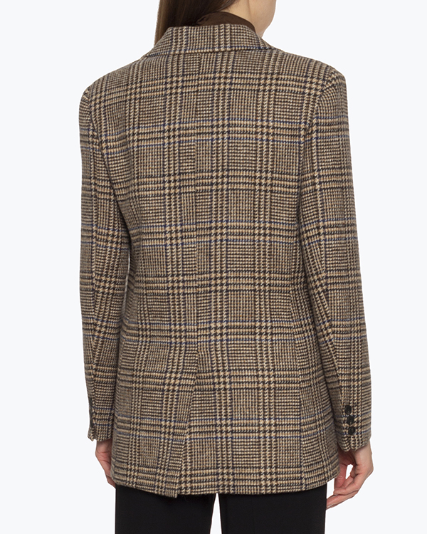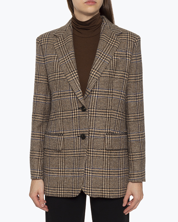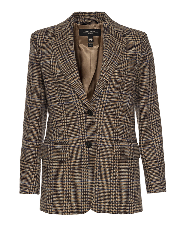 Жакет MaxMara Weekend из новой коллекции сезона осень-зима 21/22 выполнен из шерсти коричневого оттенка в клетку на подкладке. Классический прямой крой дополнен застежкой на пуговицы и двумя прорезными карманами с клапанами. Отложной воротник и объемные плечики.