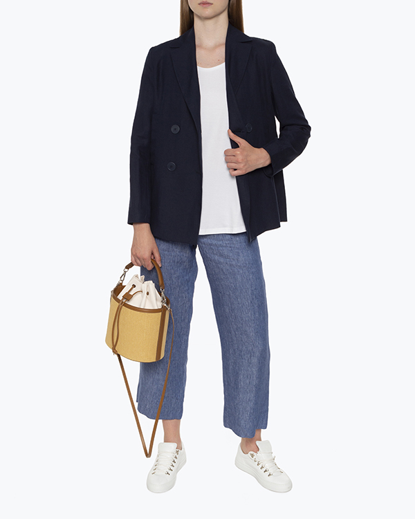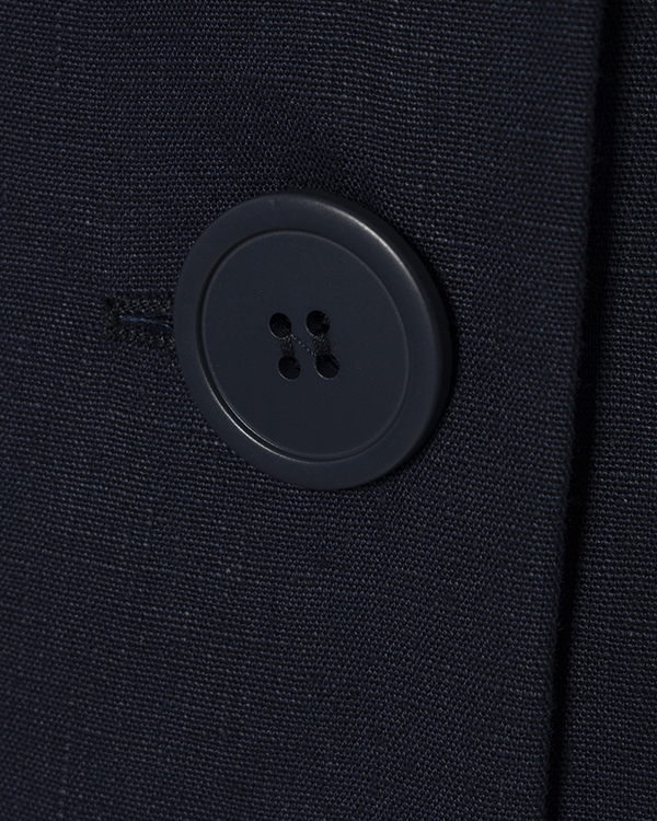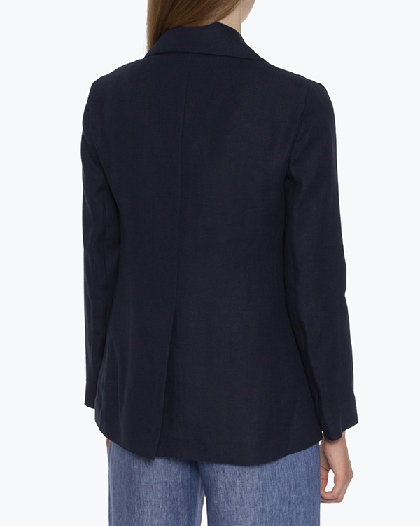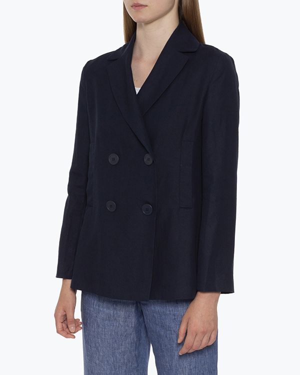 Жакет из плотного натурального льна темно-синего оттенка. Модель прямого силуэта с двубортной застежкой на пуговицы и двумя прорезными карманами по бокам.