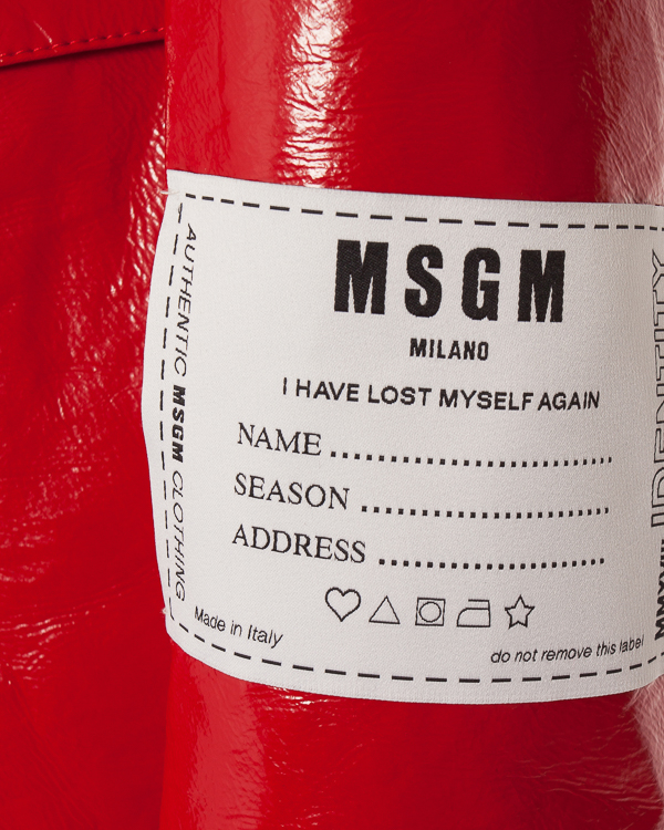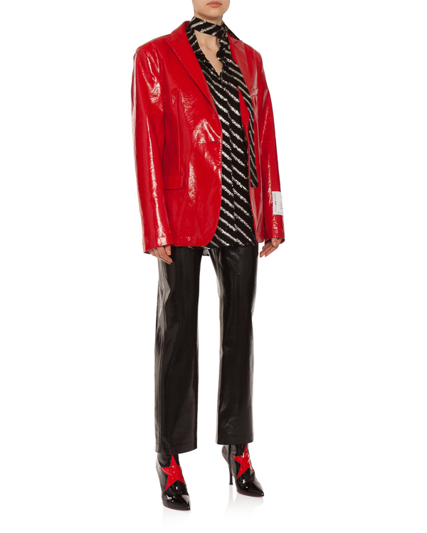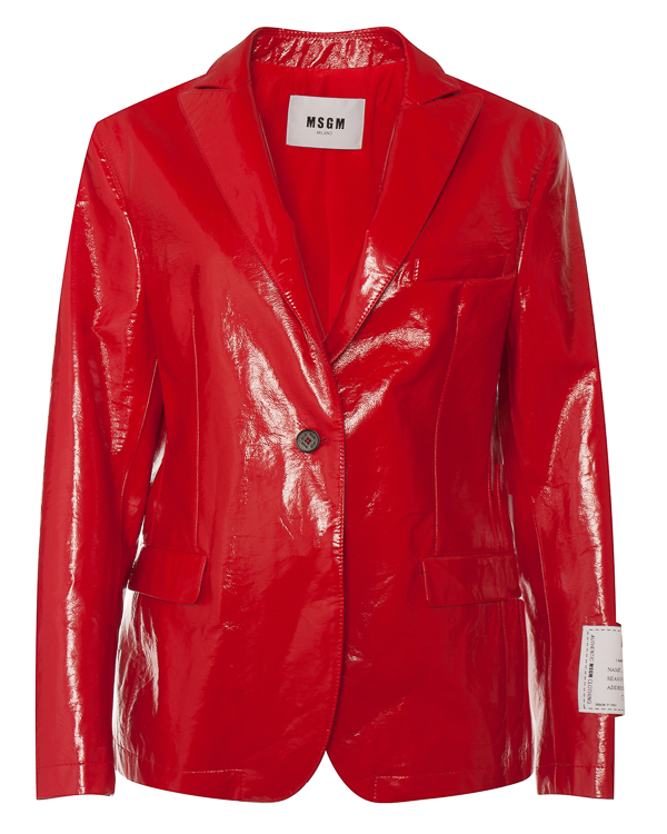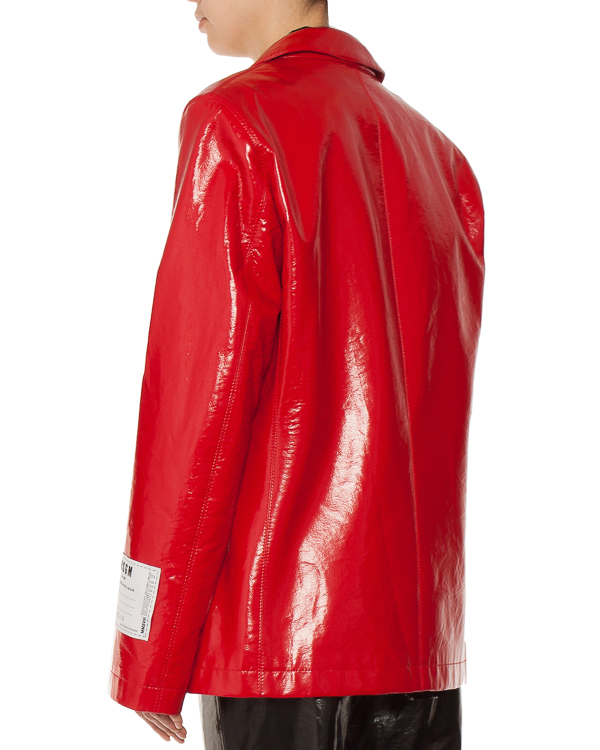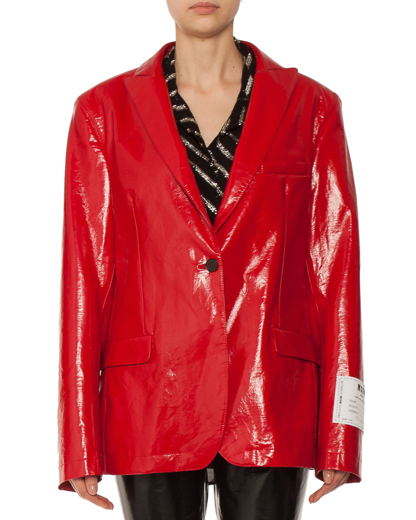 Жакет из хлопка с виниловым покрытием красного оттенка. Модель хорошо держит форму и застегивается на пуговицу. Жакет дополнен двумя карманами и нашивкой на рукаве.