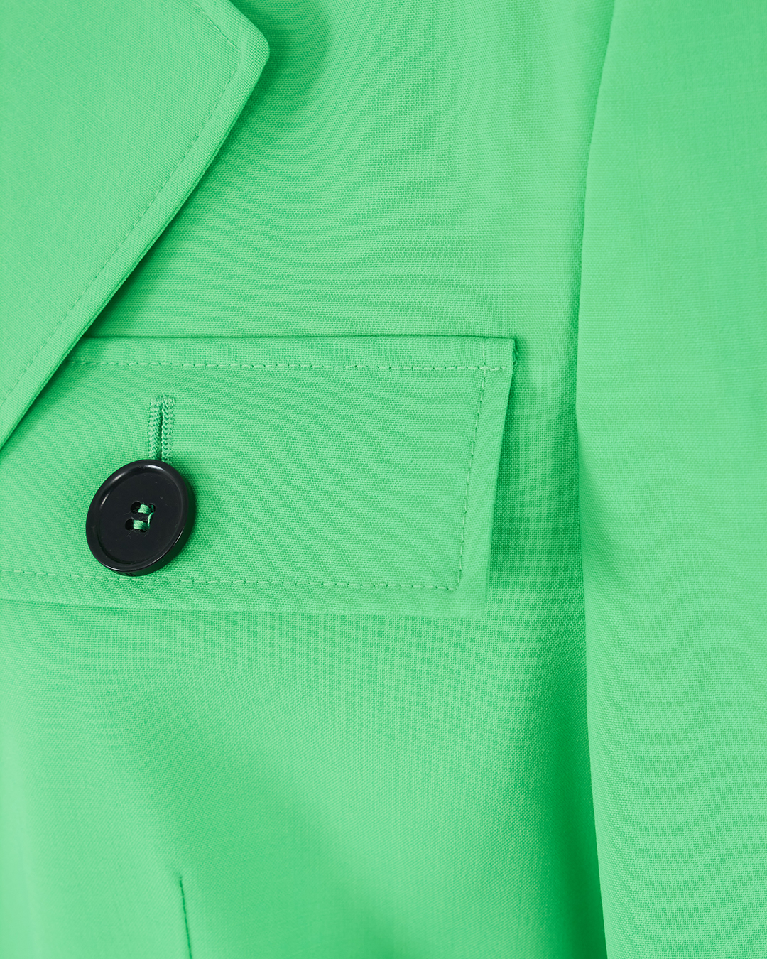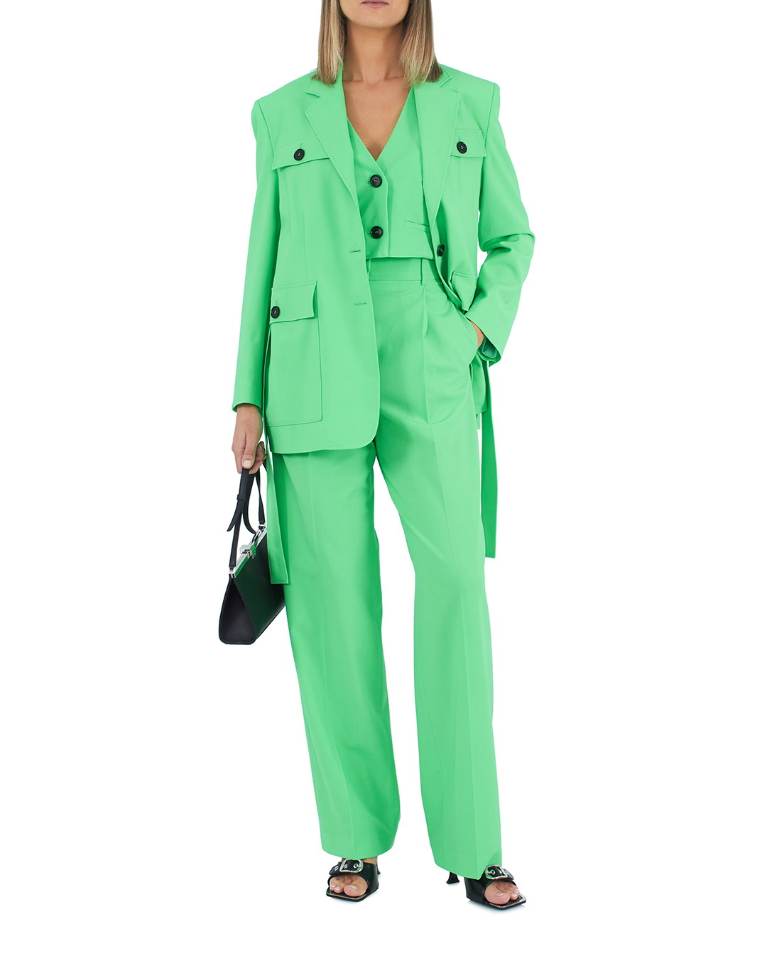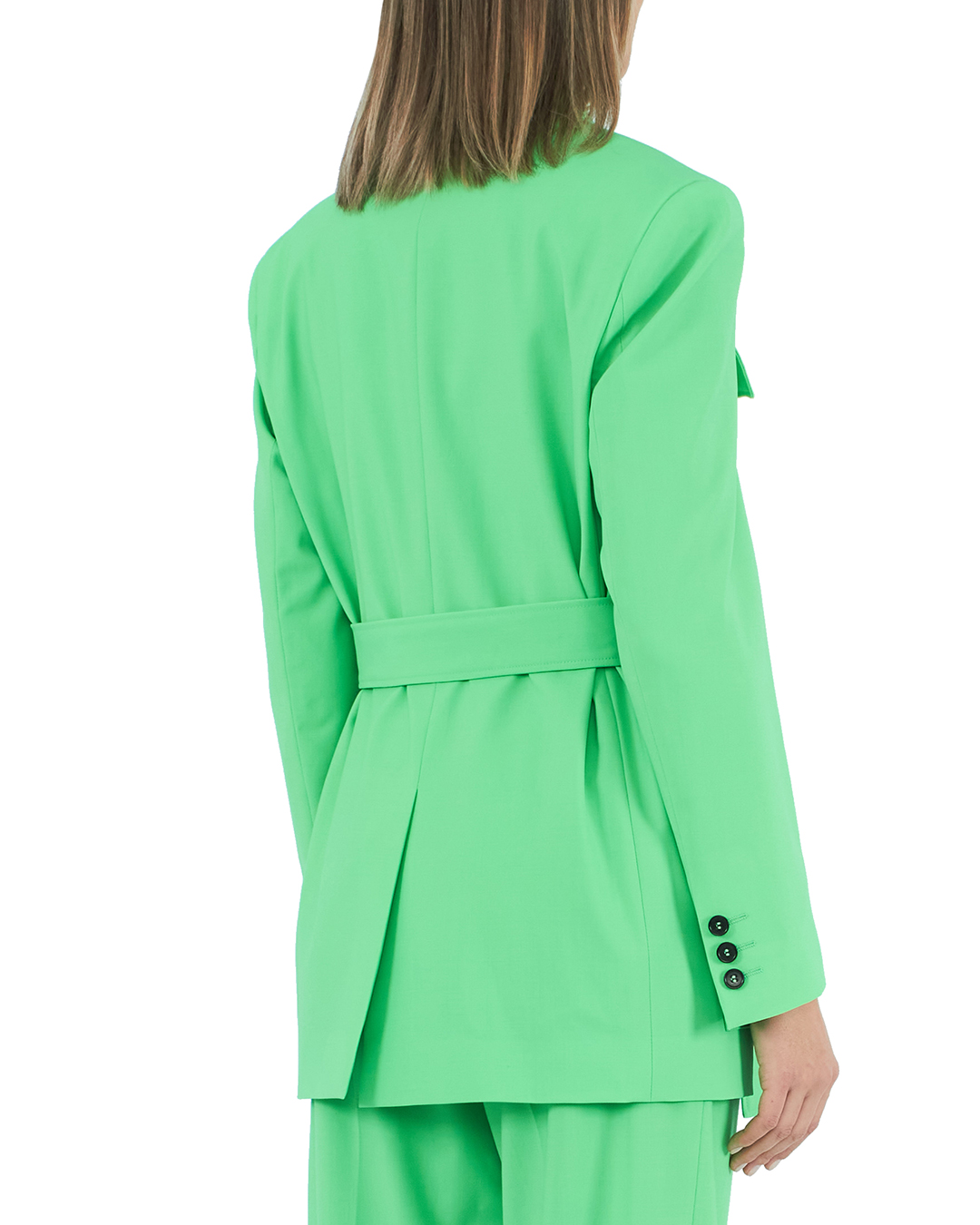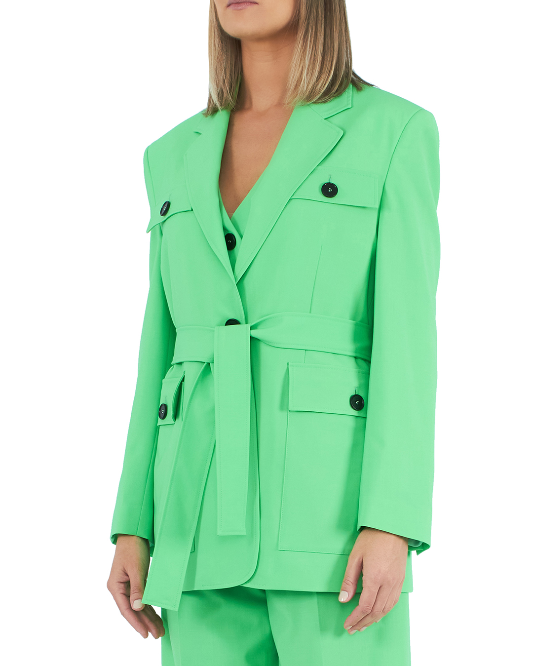 Жакет из костюмной шерсти салатового оттенка. Изделие прямого силуэта с застежкой на пуговицы дополнено поясом из основного материала.
