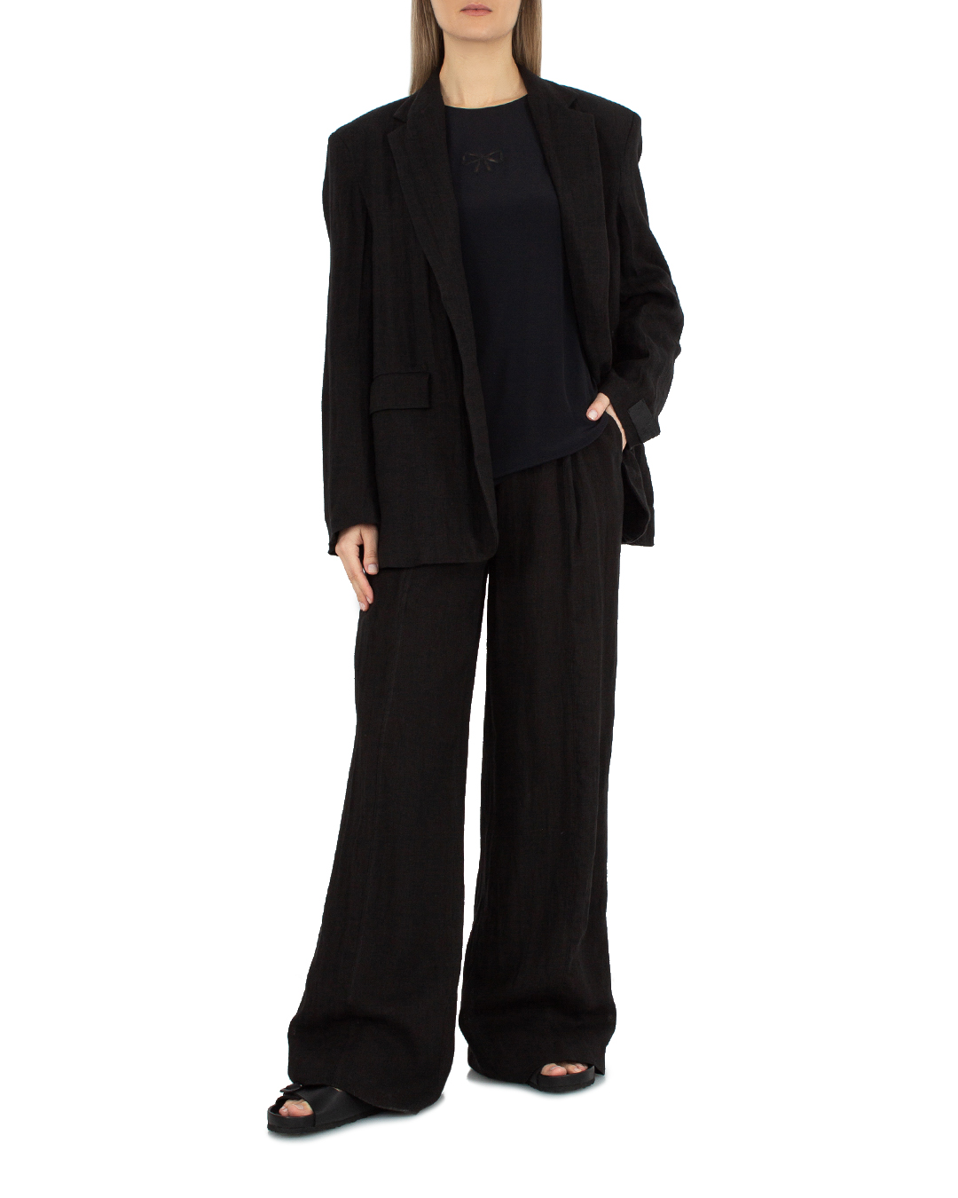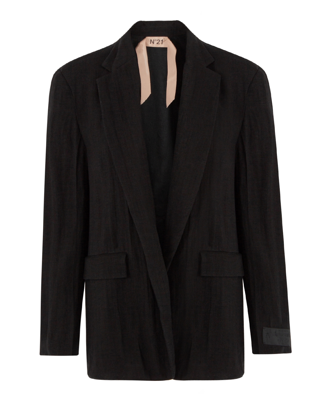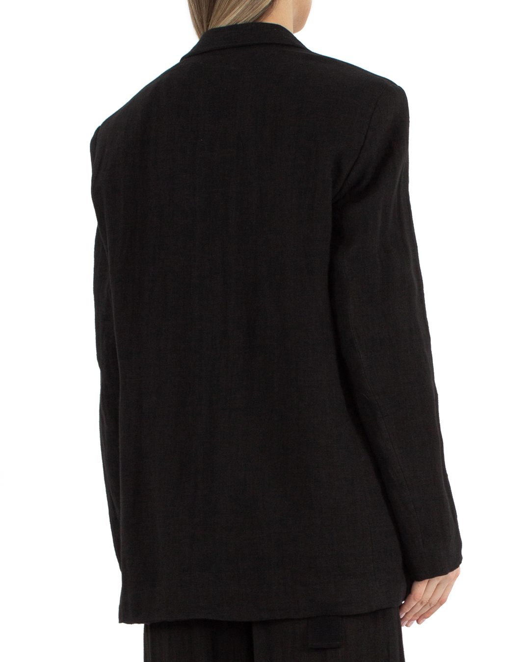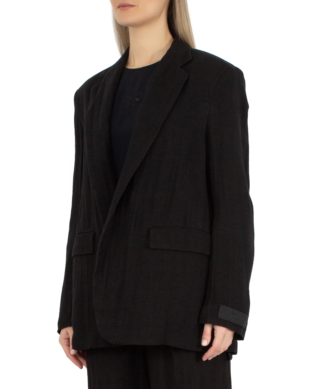 Жакет № 21 сшит изо льна. Модель прямого свободного силуэта с застежкой на пуговицы и двумя карманами с клапанами.