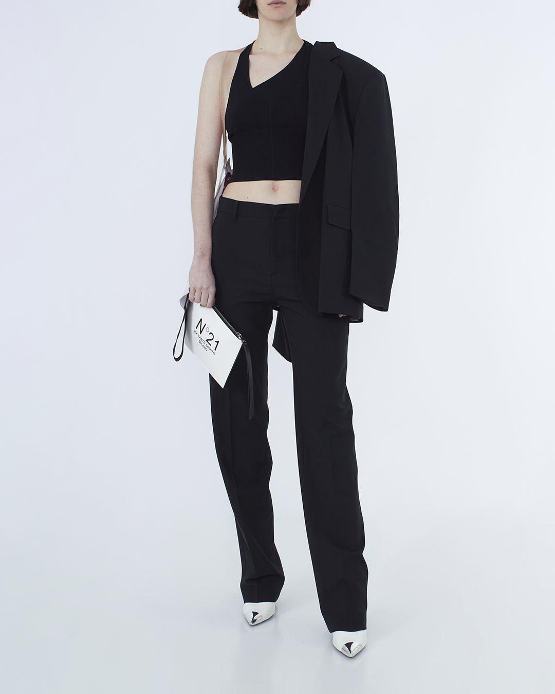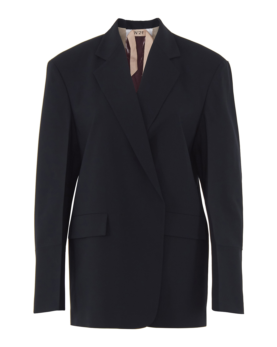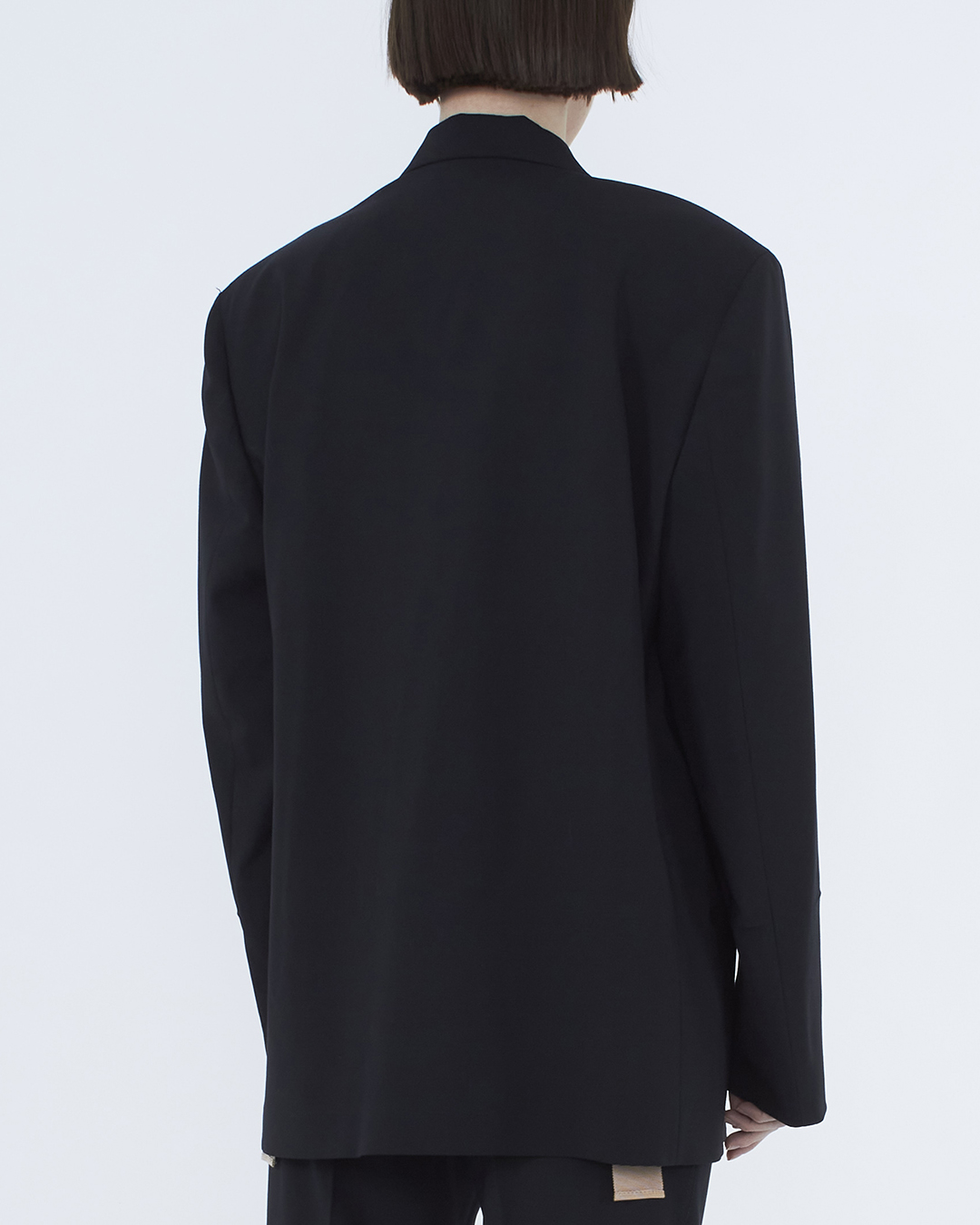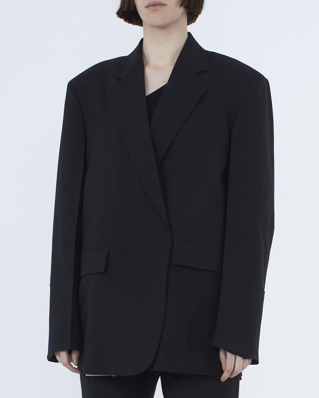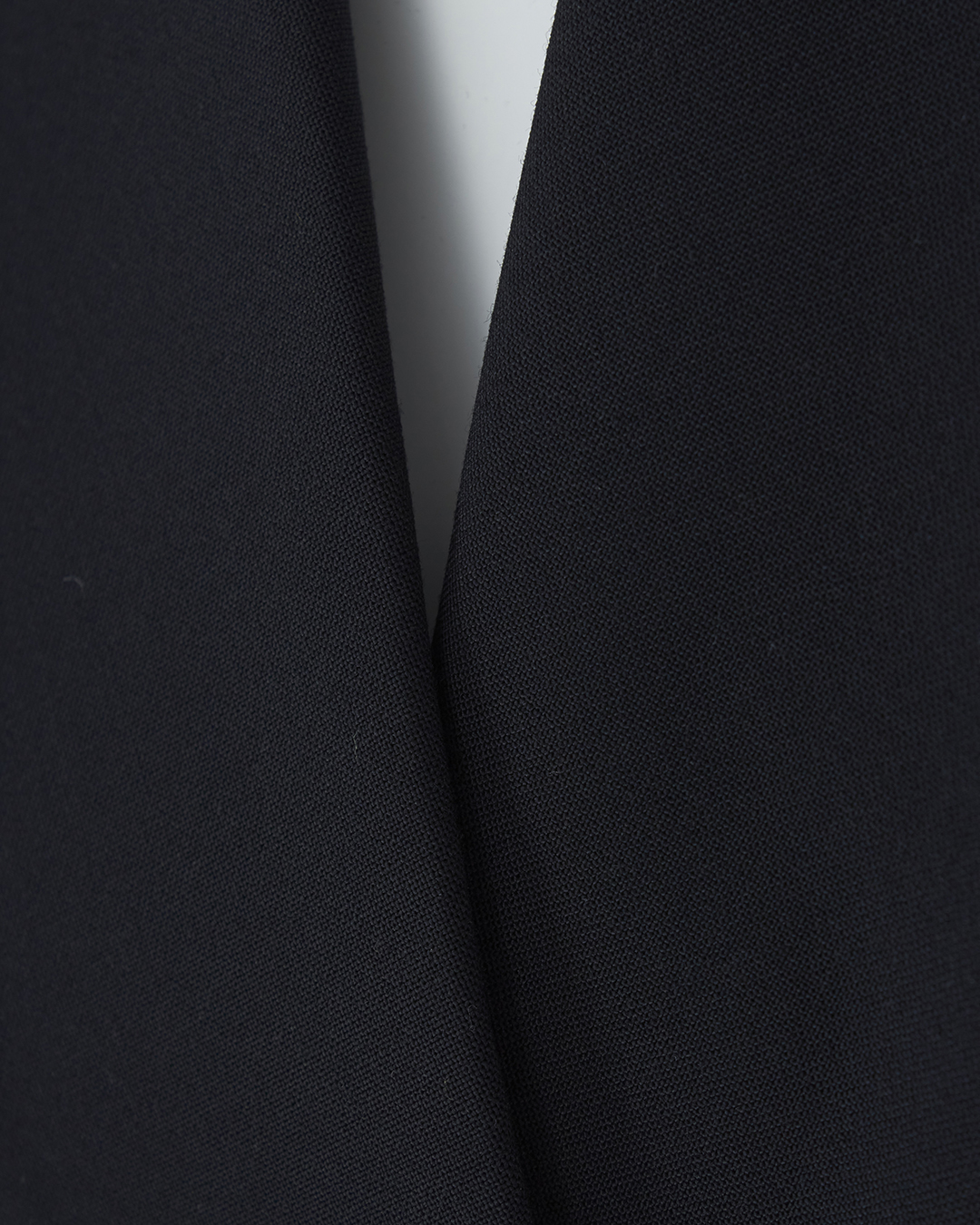 Жакет № 21 сшили из костюмного полушерстяного материала черного цвета. Модель в мужском стиле слегка объемного силуэта с двумя прорезными карманами с клапанами.
