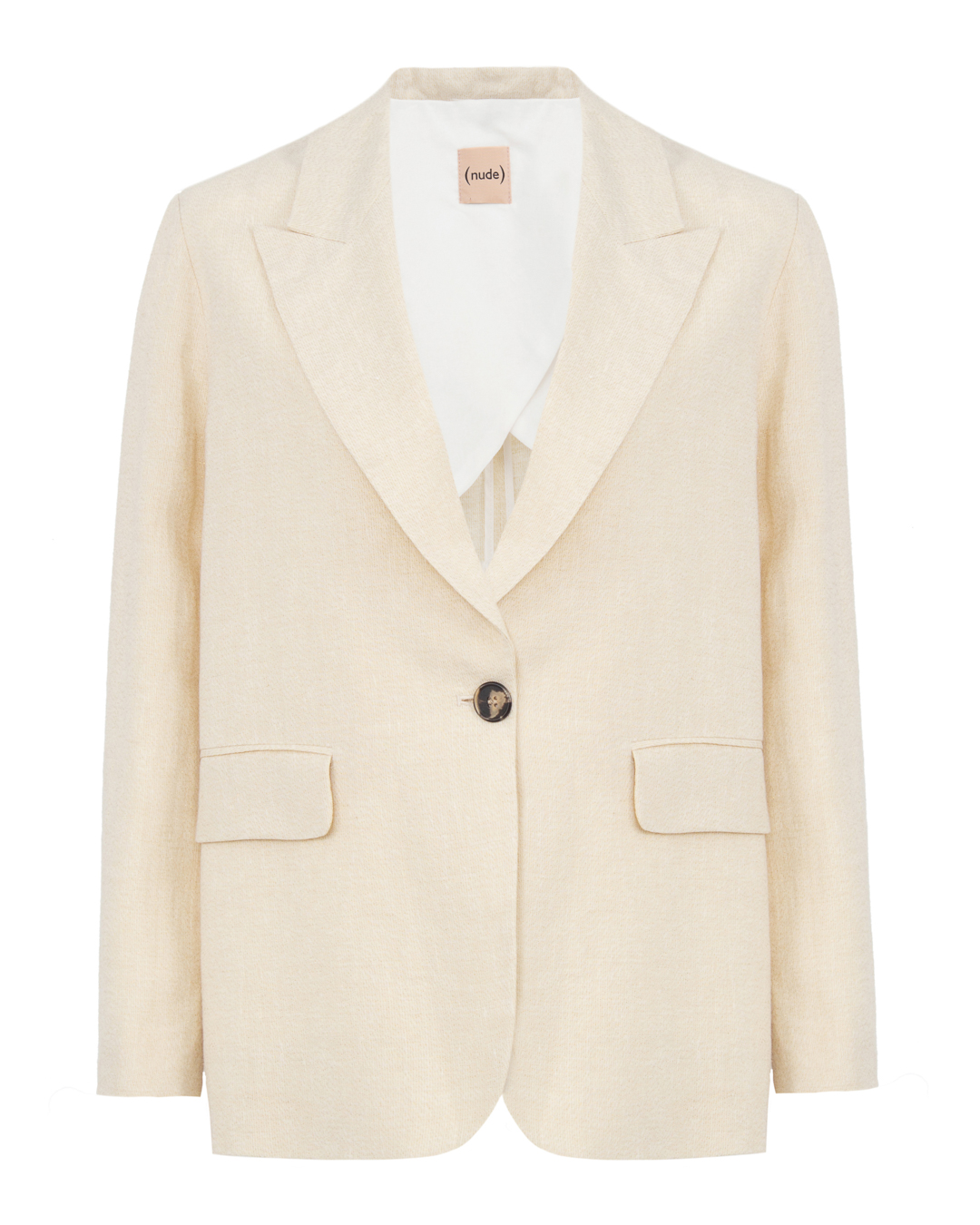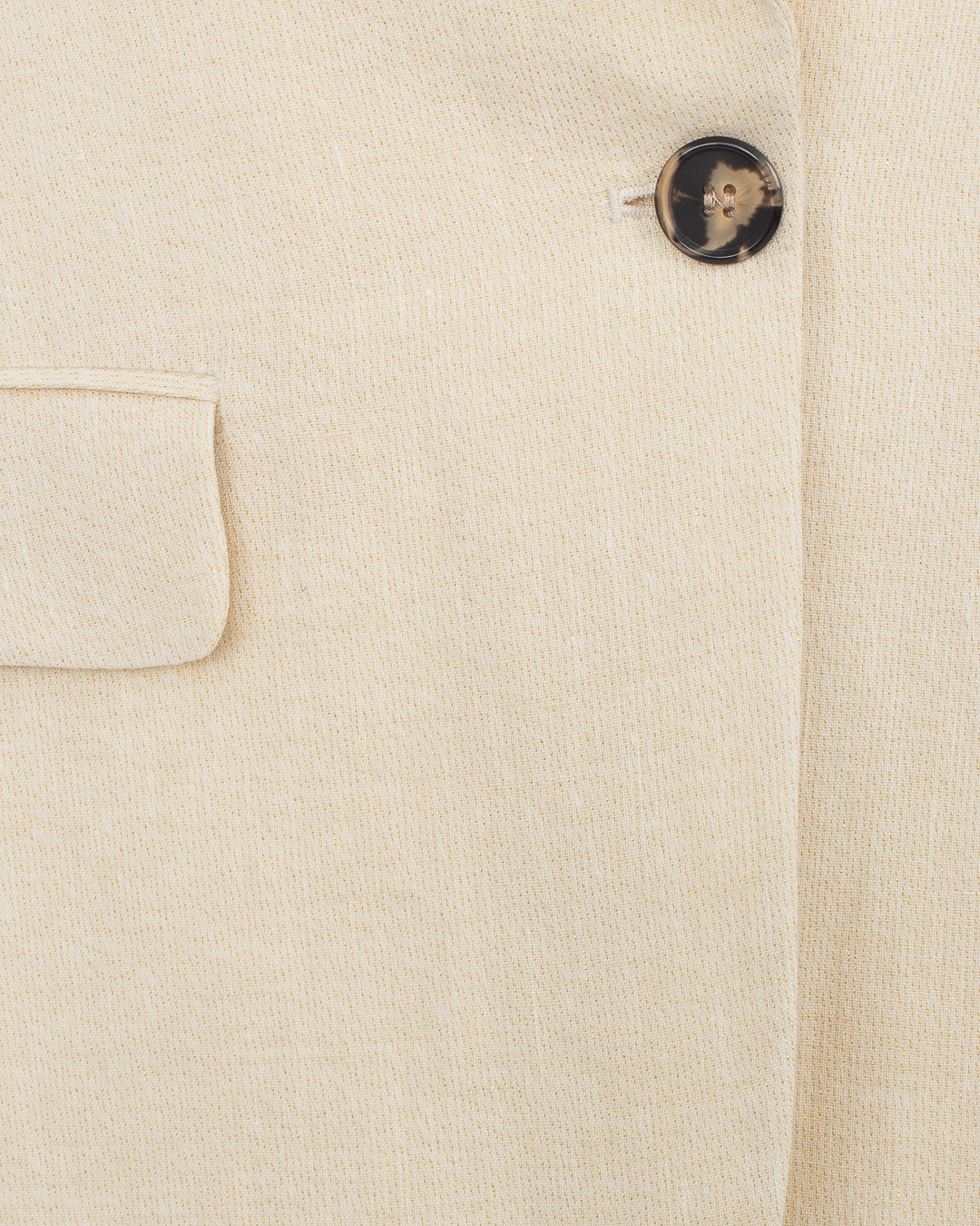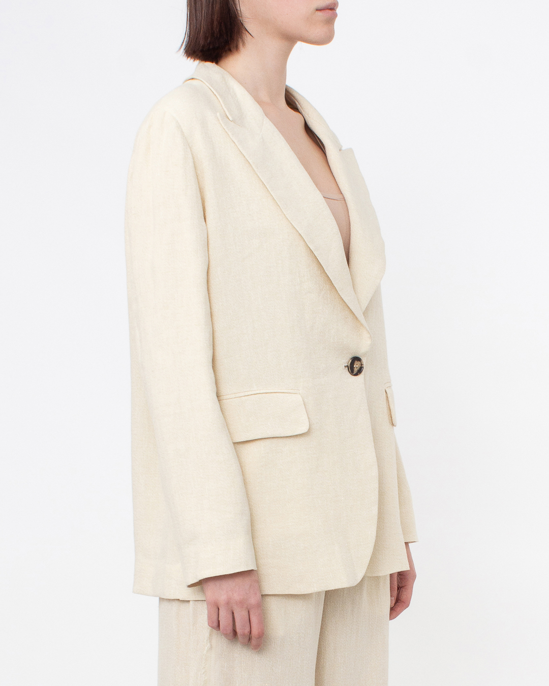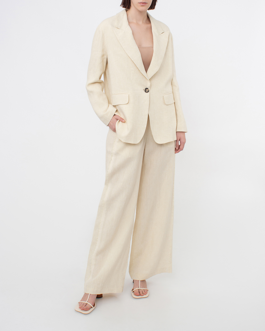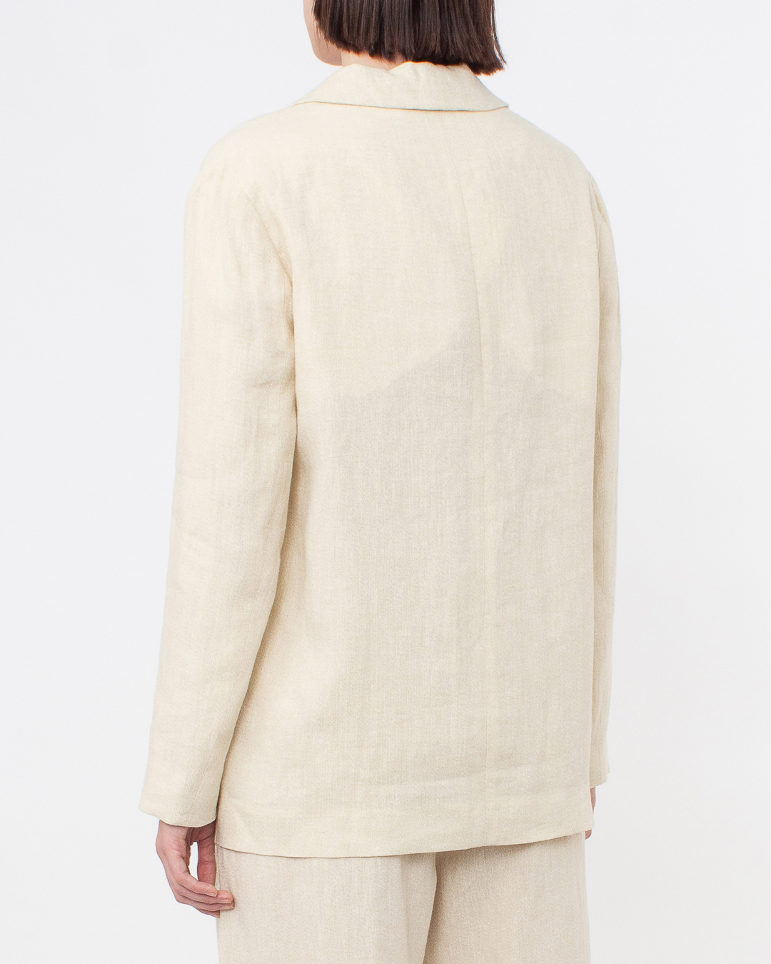 Жакет из льна природного бежевого оттенка. Прямой крой дополнен застежкой на пуговицу, отложным воротником и двумя прорезными карманами с клапанами.