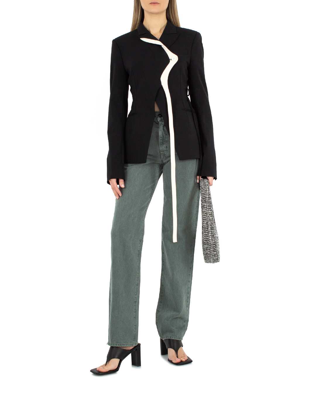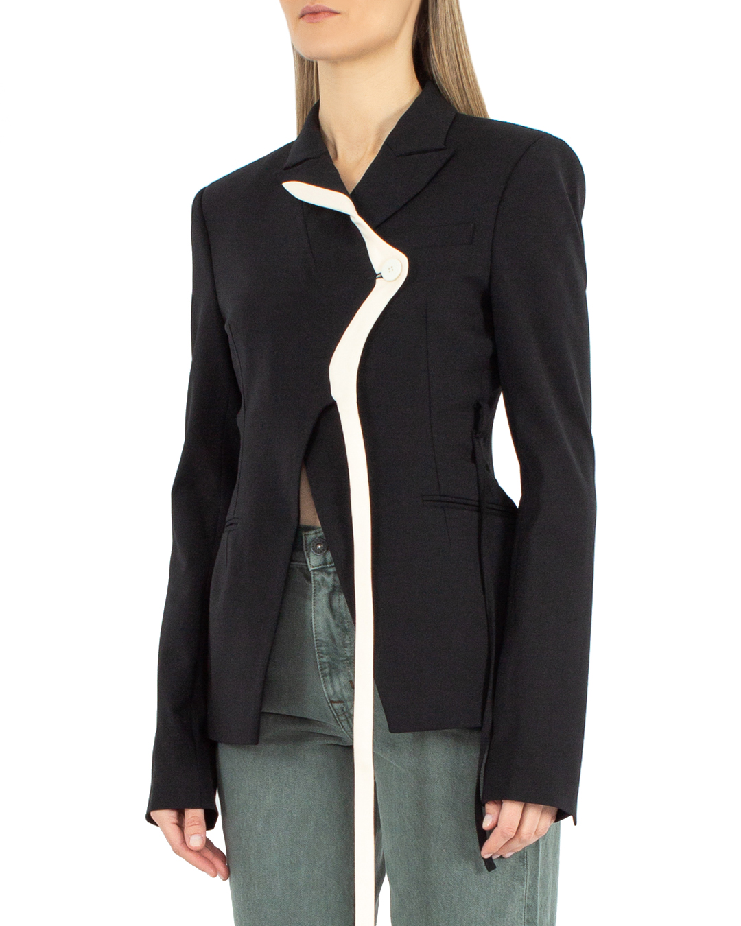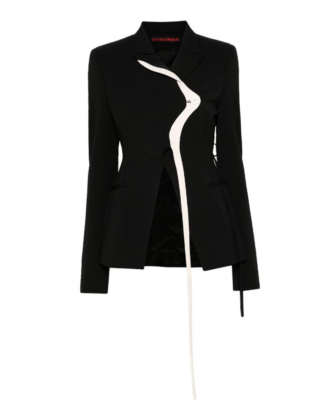 Жакет OTTOLINGER сшит из костюмного материала с добавлением шерсти. Модель приталенного силуэта с застежкой на пуговицы и нестандартной отделкой на контрасте.