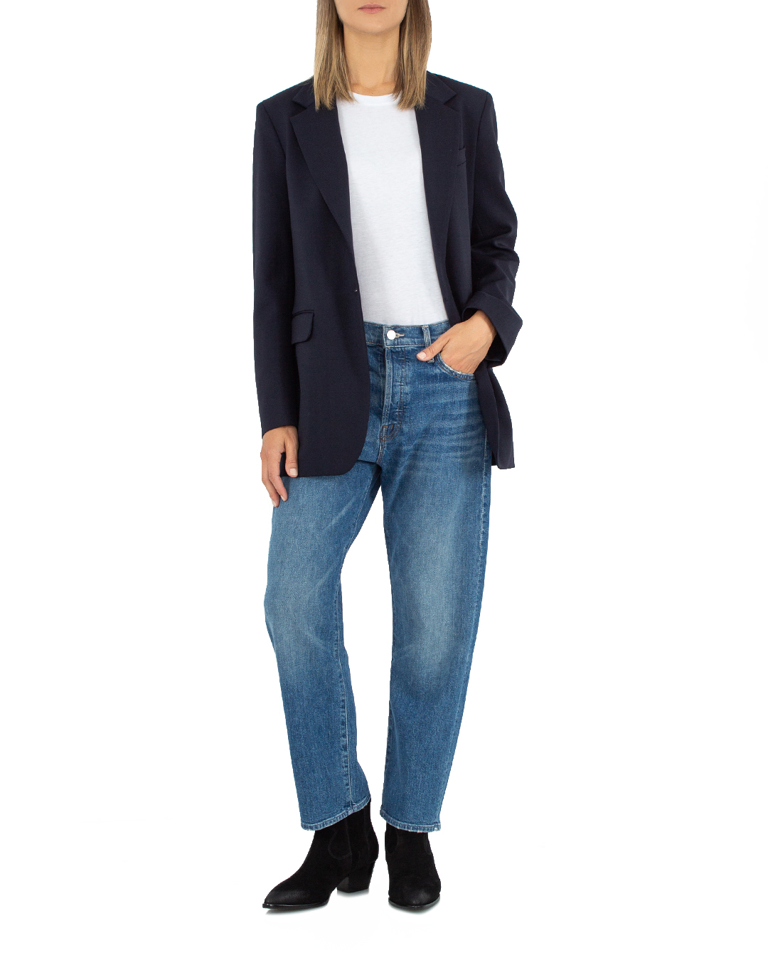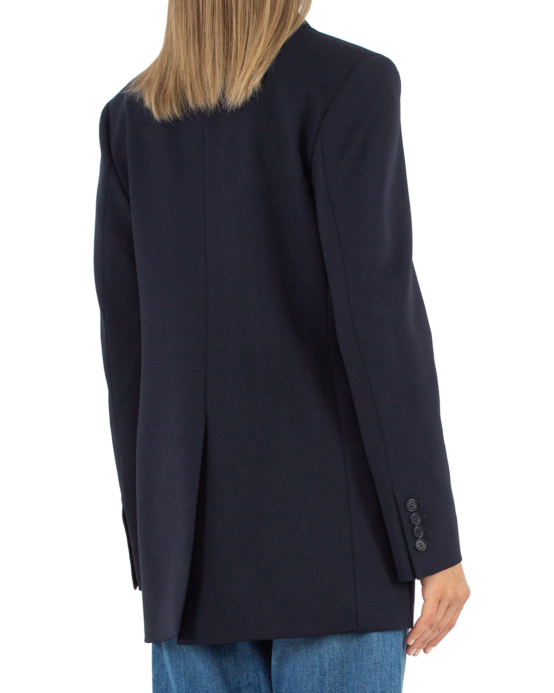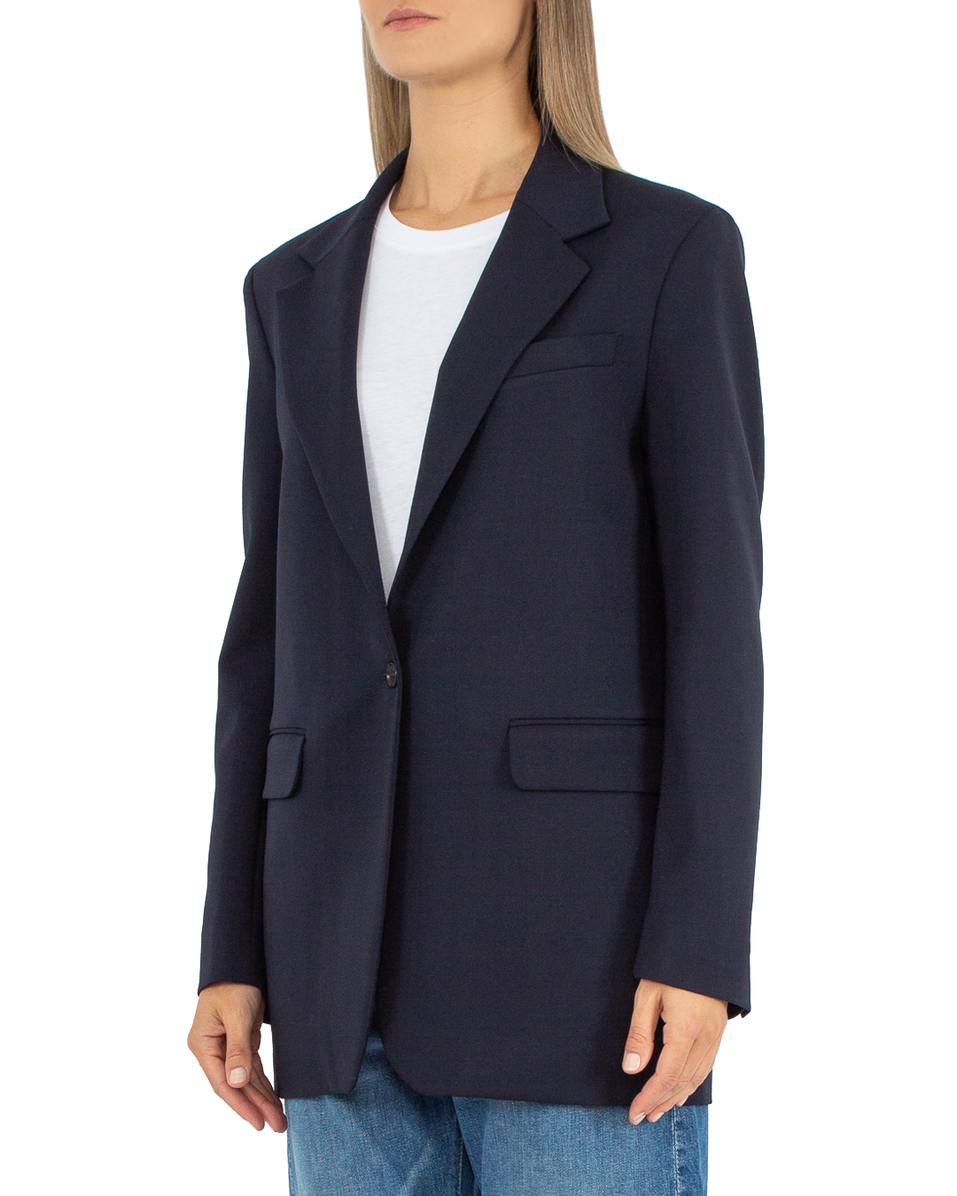 Жакет P.A.R.O.S.H из костюмной шерсти темно-синего оттенка. Модель прямого силуэта с застежкой на пуговицу.