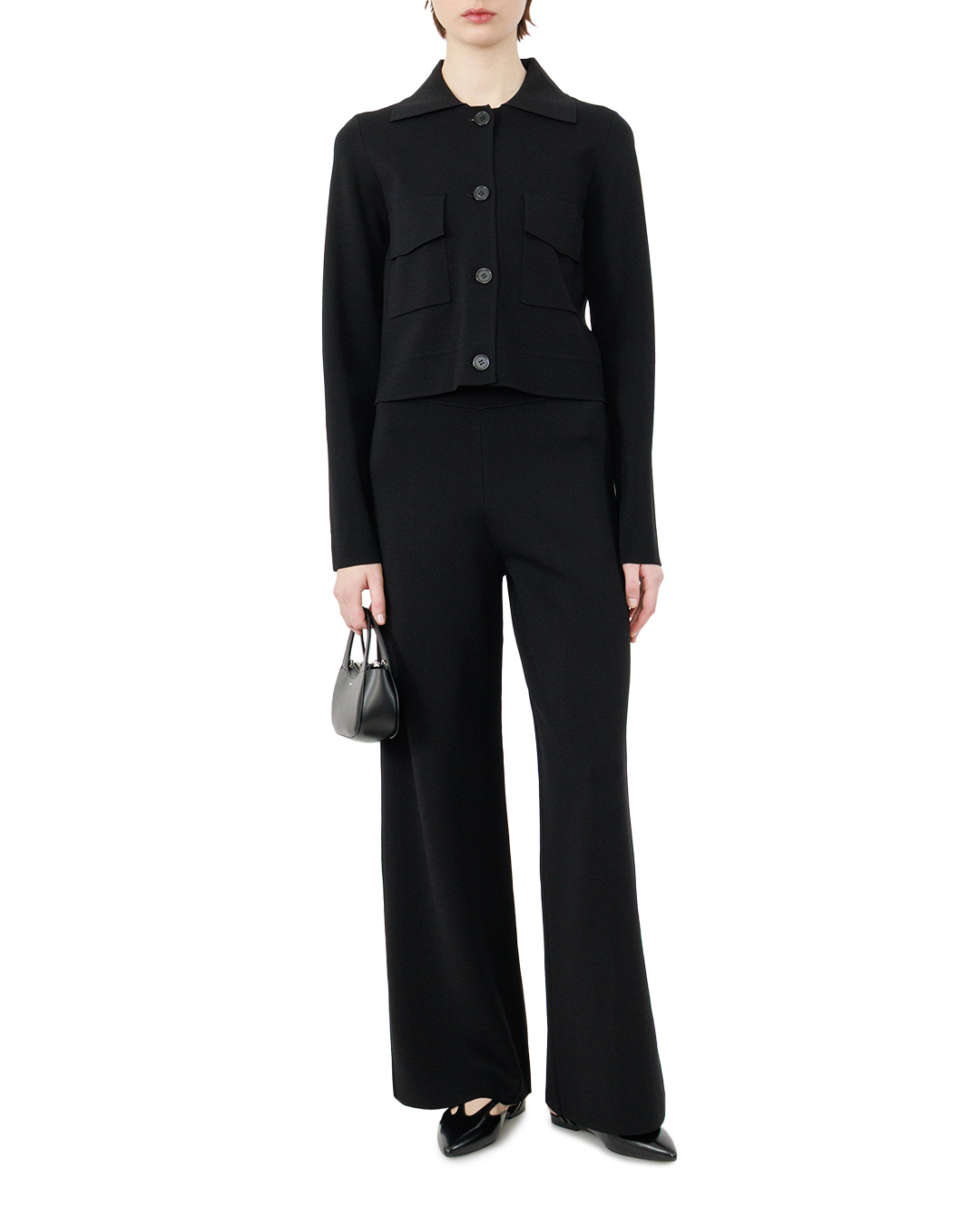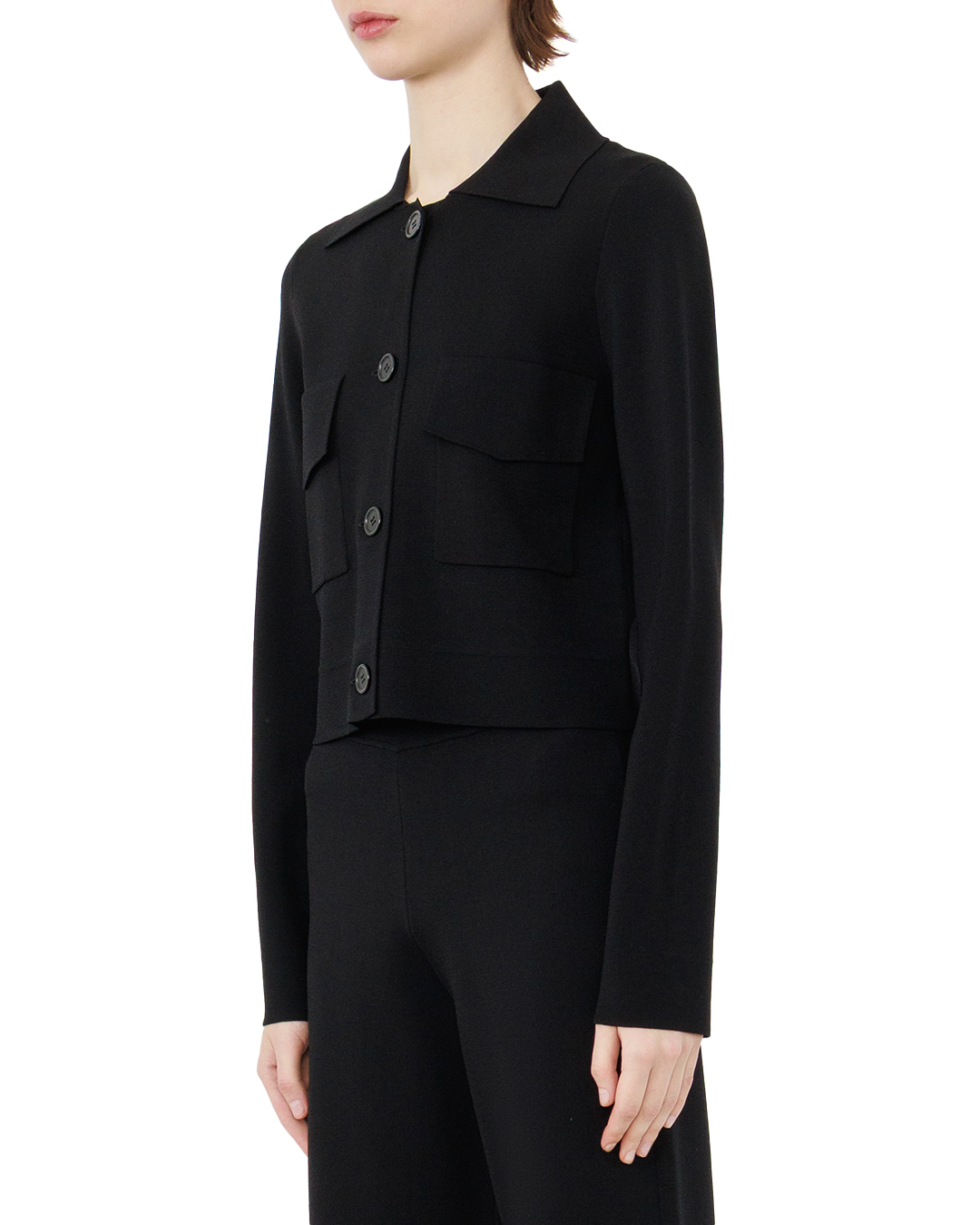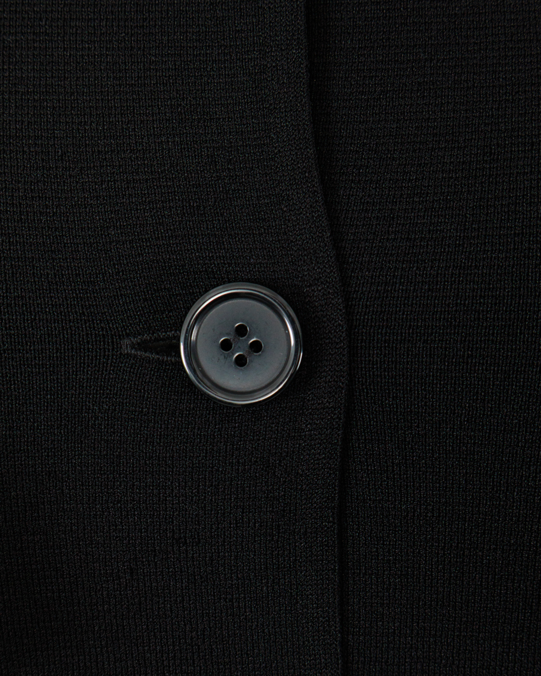 Этот укороченный жакет — воплощение строгой элегантности и современного кроя. Глубокий чёрный цвет придаёт вещи выразительность и универсальность, позволяя легко интегрировать её в самые разные образы. Лаконичный силуэт подчёркивает линию талии, создавая изящный контраст с прямыми линиями плеч и рукавов. Отложной воротник с чёткими гранями задаёт классическую основу, мягко структурируя верхнюю часть образа. Вертикальная линия застёжки с крупными пуговицами выстраивает выразительный ритм, визуально вытягивая силуэт и добавляя графичности. Пуговицы выполнены в тон изделия, что создаёт эффект цельной композиции, не отвлекая внимание от общей гармонии. Накладные карманы с асимметричной отделкой вносят динамику в классический крой, добавляя вещи характер и лёгкую небрежность. Их контуры мягко подчёркивают геометрию жакета, создавая интересную игру объёмов. Манжеты рукавов и нижний край изделия обработаны с особой тщательностью — подгибы выполнены безупречно, линии ровные и чёткие, что подчёркивает качество пошива. Все швы аккуратные, практически незаметные, что создаёт ощущение монолитности конструкции. Жакет идеально балансирует между классикой и современностью: он одинаково органично впишется как в деловой ансамбль с юбкой-карандашом, так и в повседневный образ с джинсами. Эта вещь — пример того, как минимализм и точность кроя работают на создание безупречного стиля.