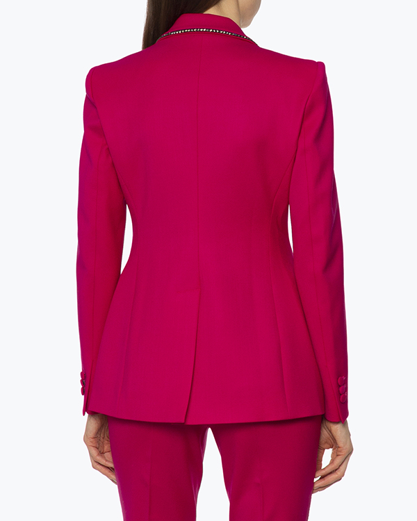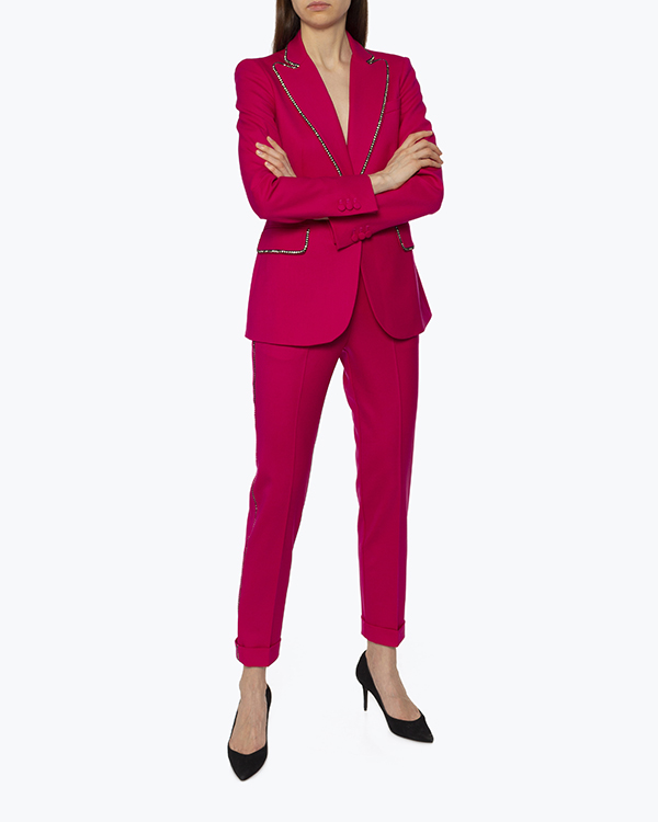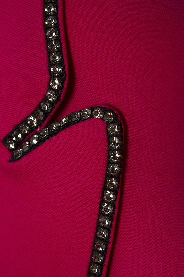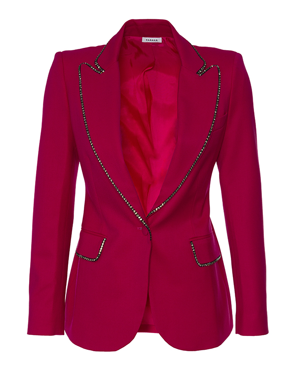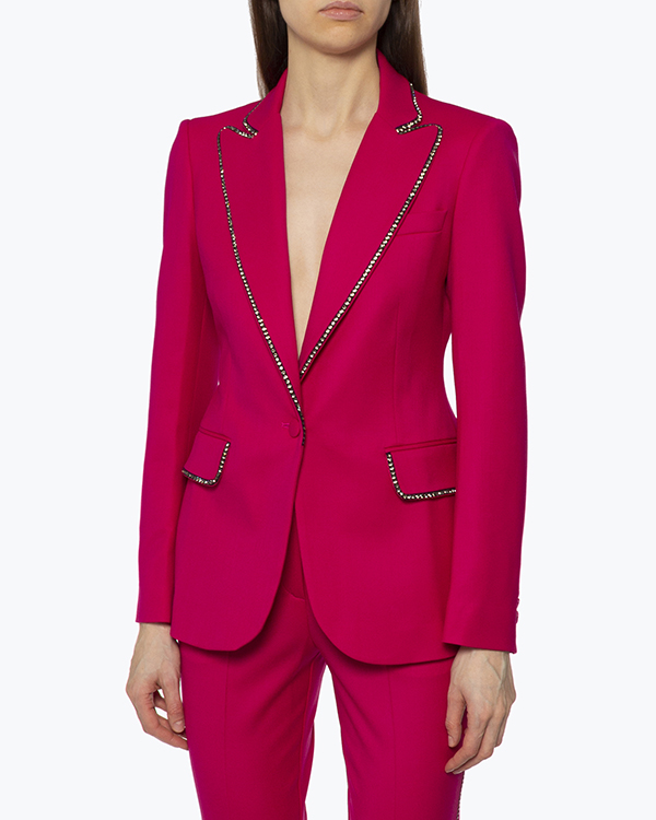Жакет из костюмной шерсти мериноса оттенка фуксии с отделкой кристаллами, на подкладке. Модель приталенного силуэта с застежой на пуговицу.