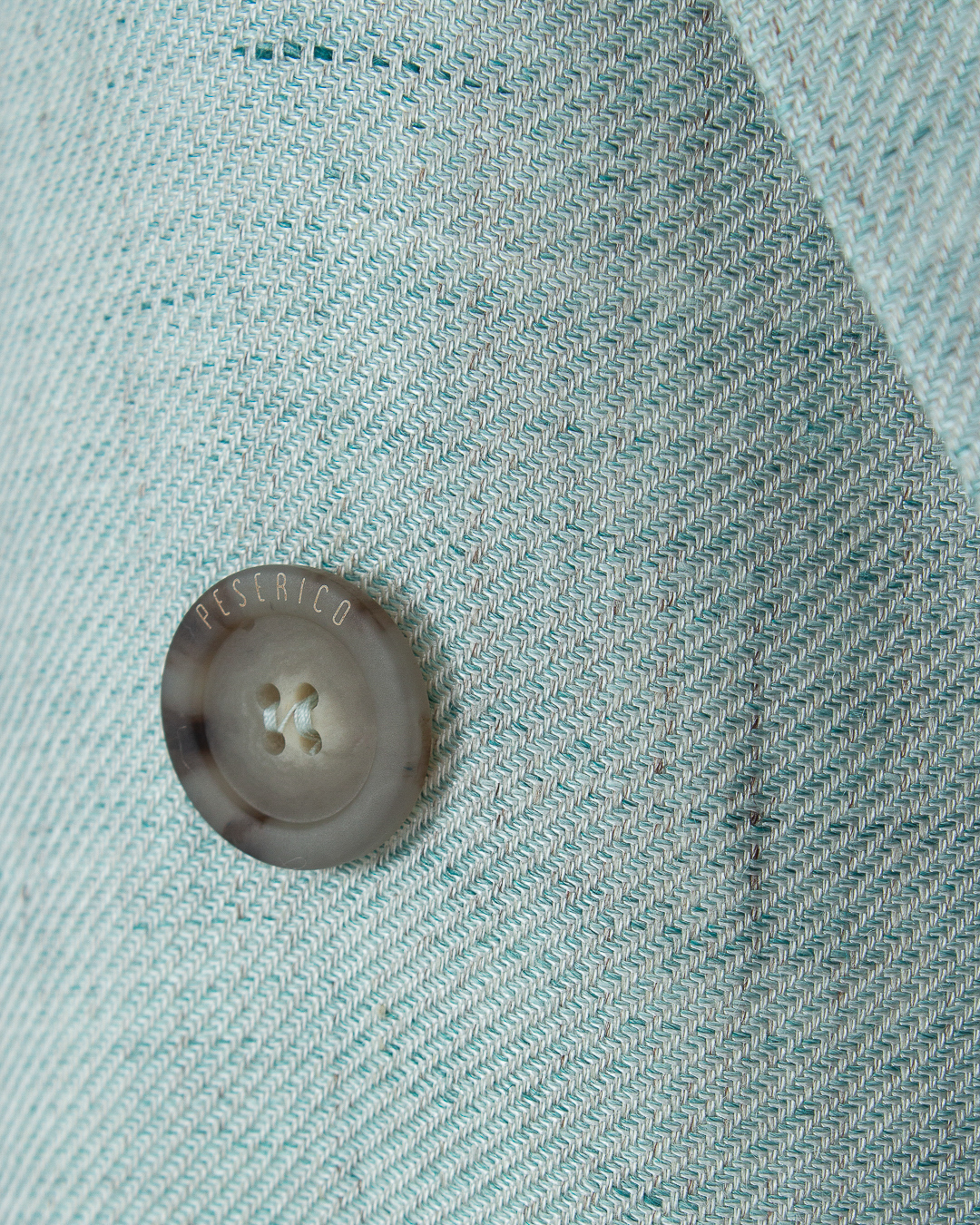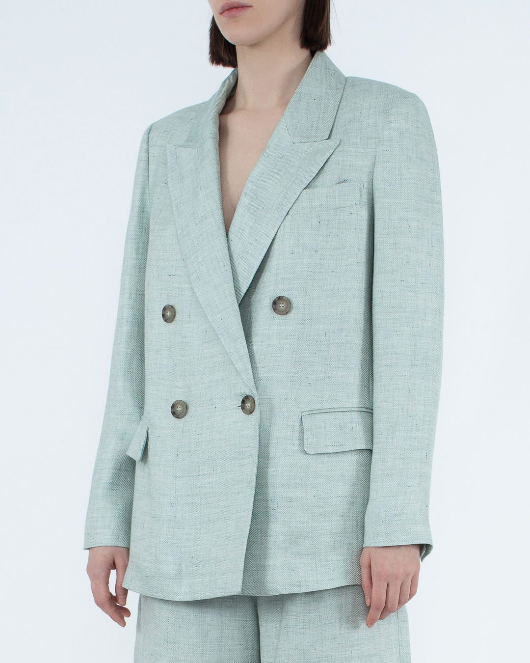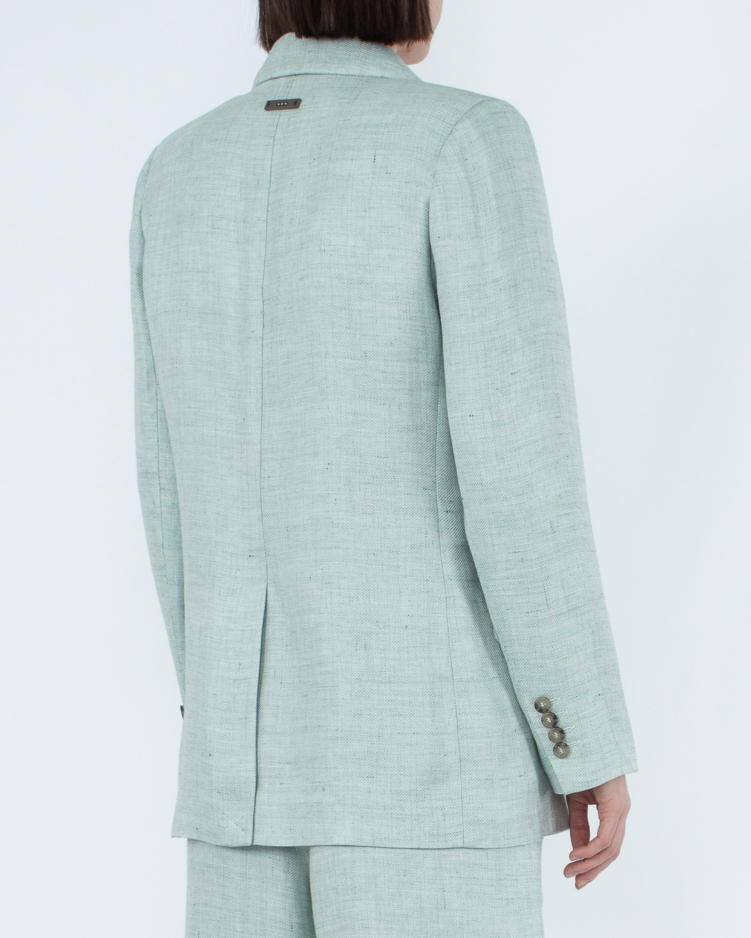 Костюмный жакет изо льна светло-голубого оттенка. Модель прямого силуэта с застежкой на пуговицы дополнена прорезными карманами с планкой.
