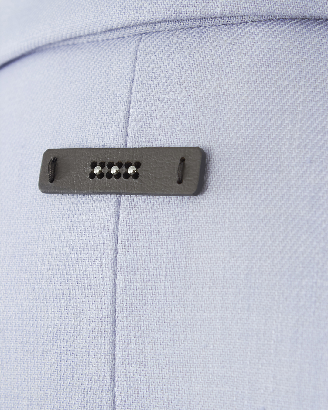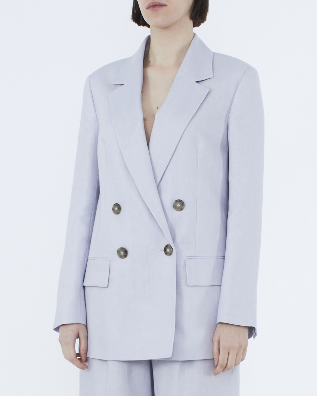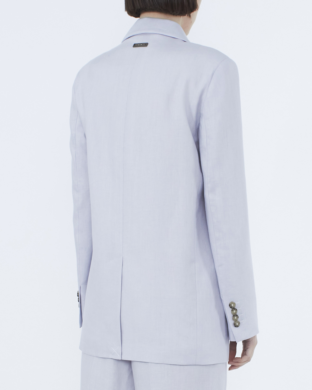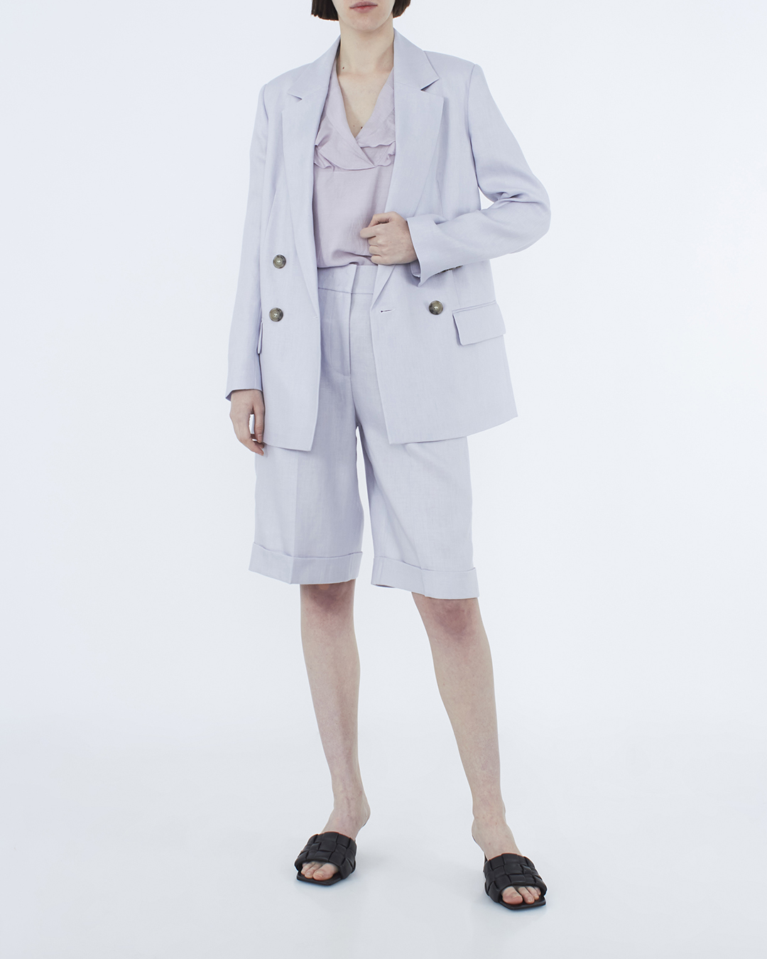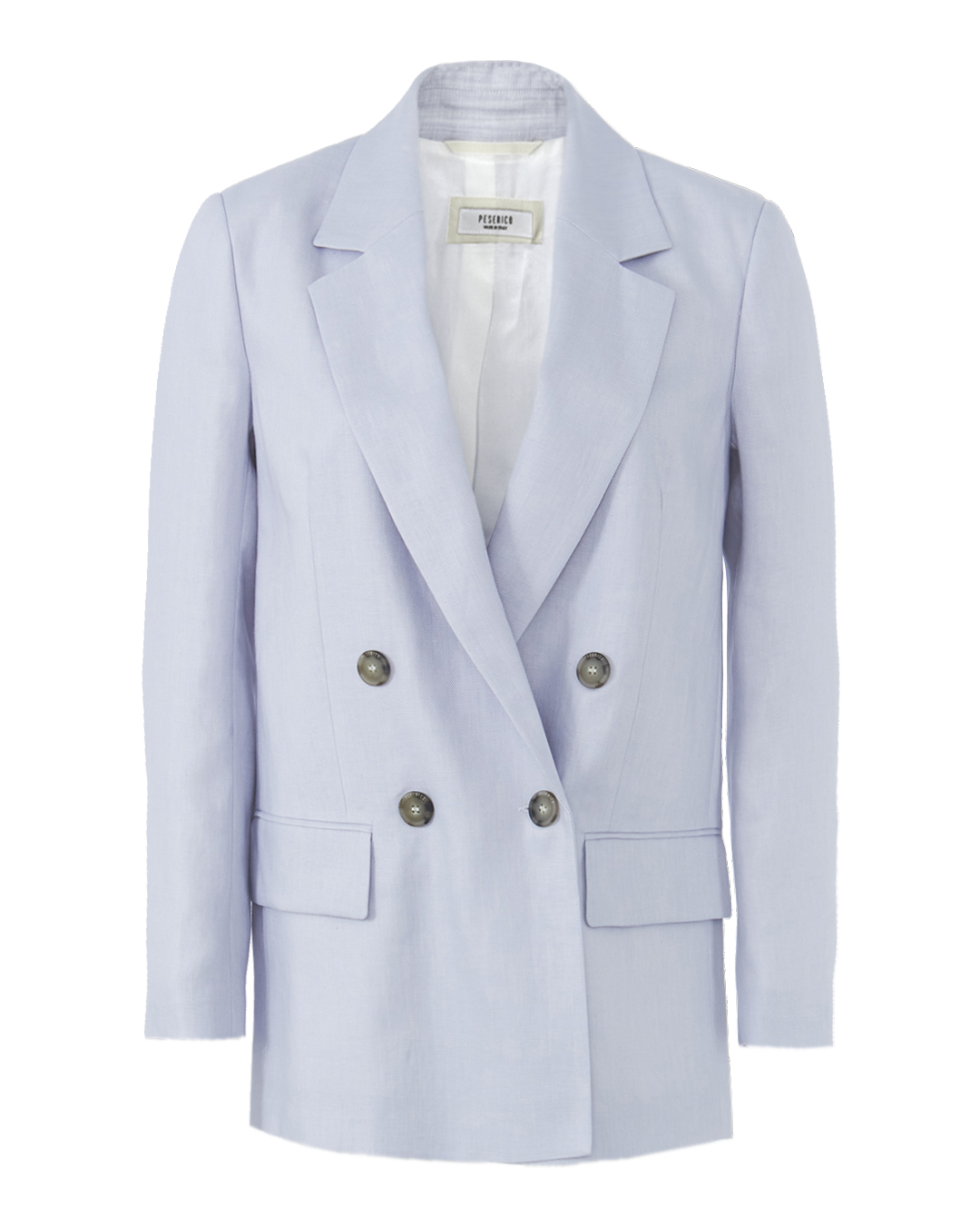 Двубортный жакет Peserico сшили изо льна холодного фиолетового оттенка, на подкладке. Модель прямого силуэта с двумя прорезными карманами и отложным воротником.