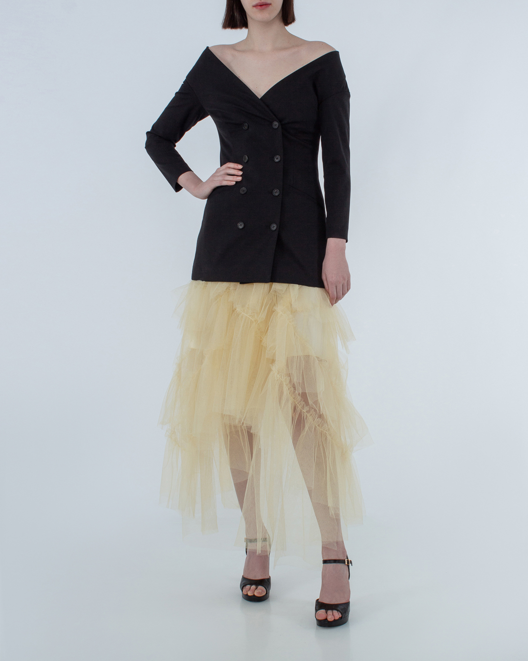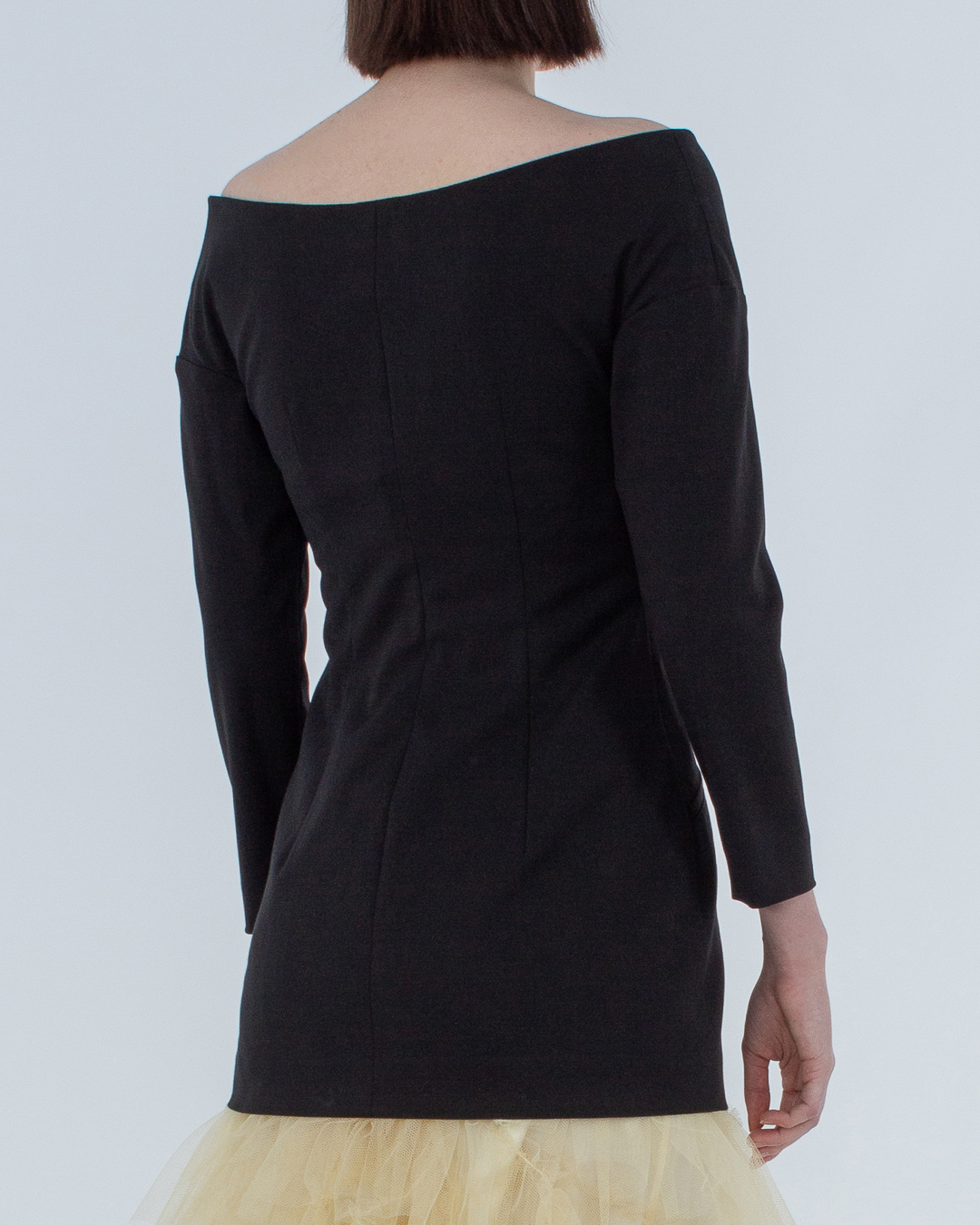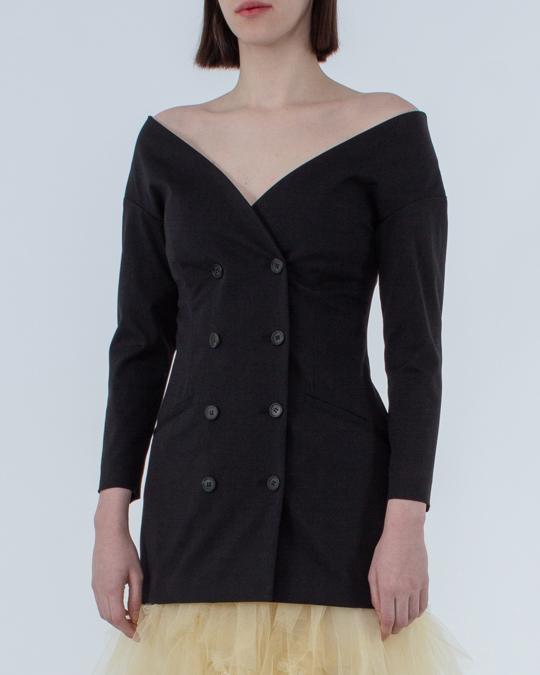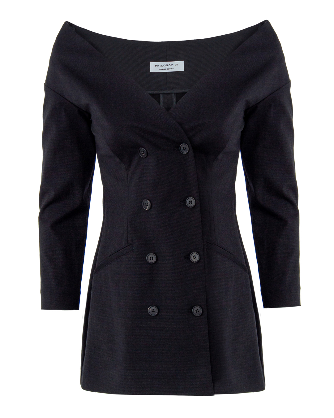 Жакет PHILOSOPHY DI LORENZO SERAFINI сшили из фактурного хлопка черного цвета. Приталенное облегающее изделие с застежкой на пуговицы вполне может быть платьем длины мини. Модель с открытыми плечами и декольтированным вырезом.