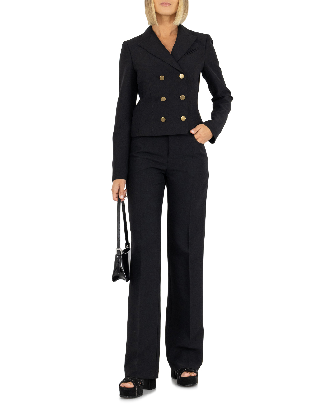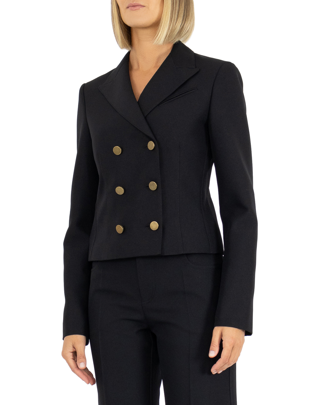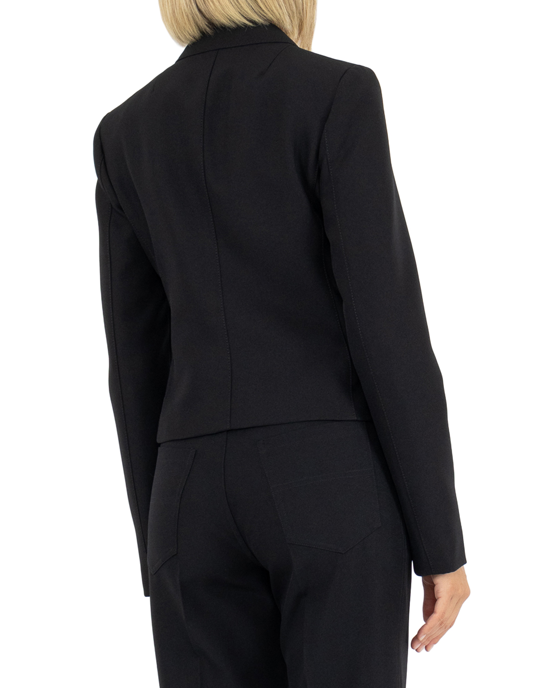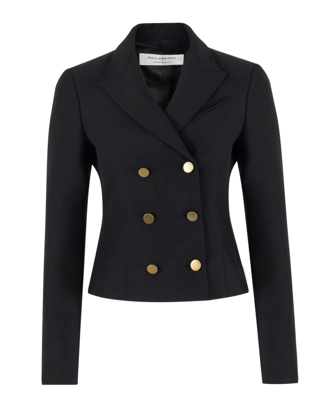 Костюмный жакет PHILOSOPHY DI LORENZO SERAFINI из плотного текстиля черного цвета. Модель приталенного укороченного силуэта с застежкой на пуговицы дополнена длинными рукавами и отложным воротником.