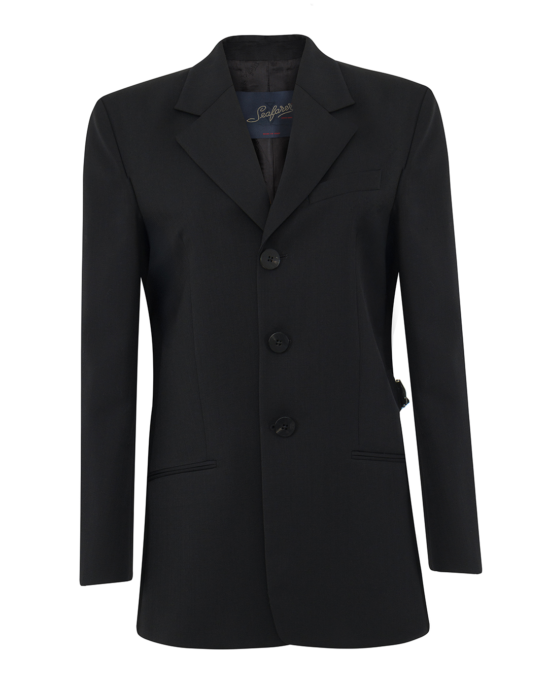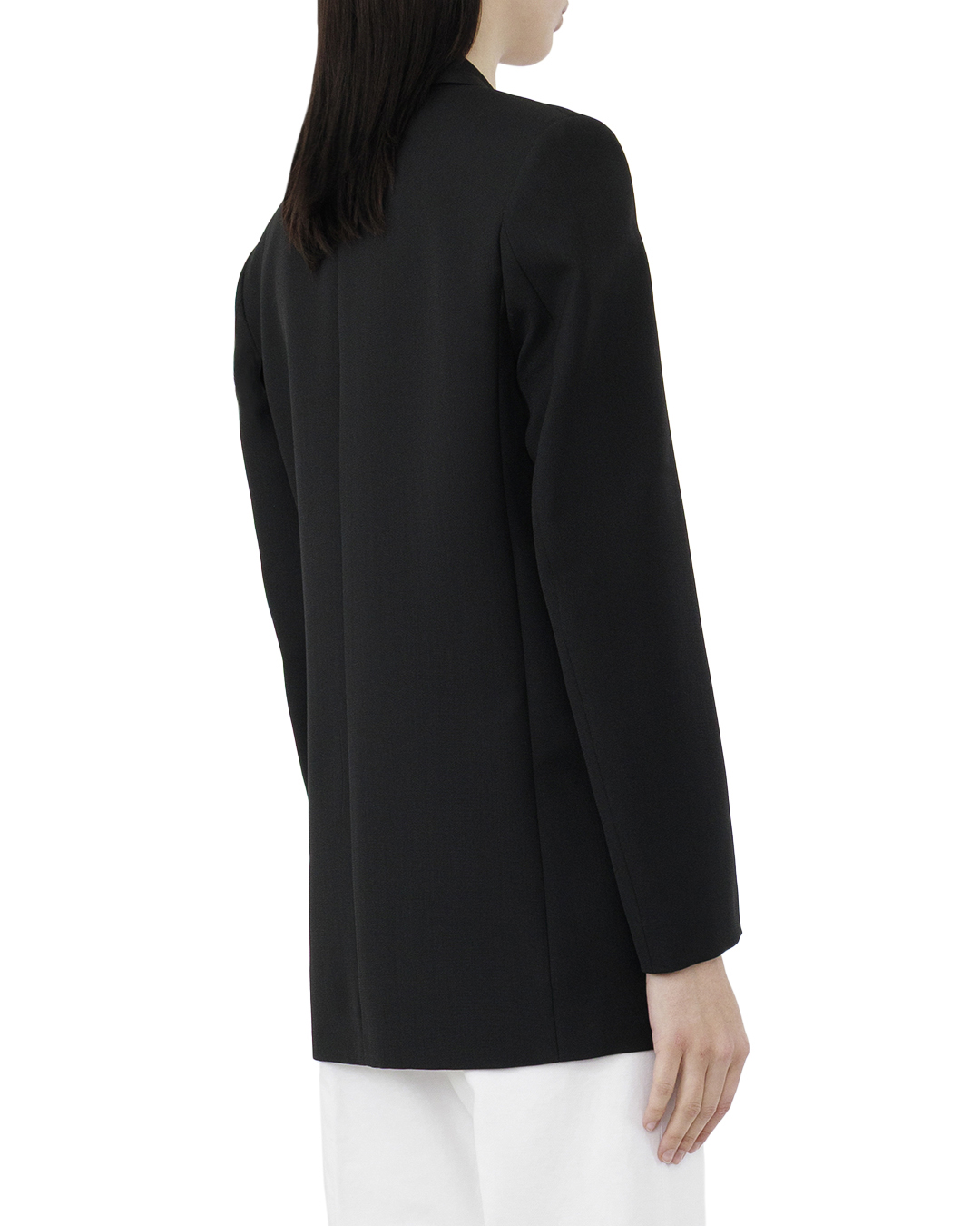 Этот жакет в классическом черном цвете является воплощением элегантности и утонченного стиля. Он прекрасно сочетает в себе элементы традиционного кроя и современные тенденции, создавая универсальный предмет гардероба для любого случая. Крой — удлиненный, с прямым силуэтом и слегка приталенной талией, что придает фигуре утонченность. Лапки пиджака имеют аккуратный скошенный обрез, создавая четкие линии и структуру. Отделка — жакет выполнен из высококачественной ткани с легким ступенчатым блеском, что придает ему статусный вид. Внутренняя подкладка, выполненная из сатина, обеспечивает комфорт и легкость в носке, а также скрывает дополнительный элемент стиля. Застежка — двойная на три аккуратно подобранные пуговицы, изысканная текстура которых гармонично сочетается с основной тканью. Пуговицы имеют минималистичный дизайн, подчеркивающий общую строгость и стилизованность жакета. Карманы — два накладных кармана на уровне бедер с плоскими клапанами, обеспечивающими не только практичность, но и современный вид. Фронтальный карман на груди добавляет классического акцента и служит отличным местом для ношения платка. Манжеты оформлены с помощью маленьких пуговок, что подчеркивает внимание к деталям и завершенность образа. Разрезы по бокам жакета добавляют свободы движения и делают его удобным в носке. Этот жакет является идеальным выбором для создания как строгого делового образа, так и стильного повседневного наряда. Он легко комбинируется с различными нижними частями, от классических брюков до юбок, подчеркивая индивидуальность и вкус своей обладательницы.