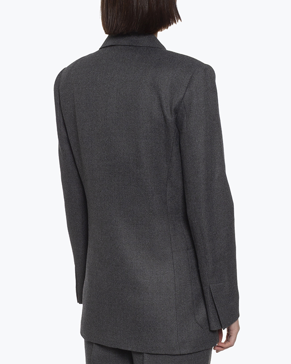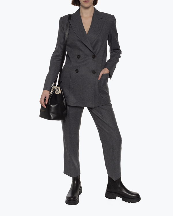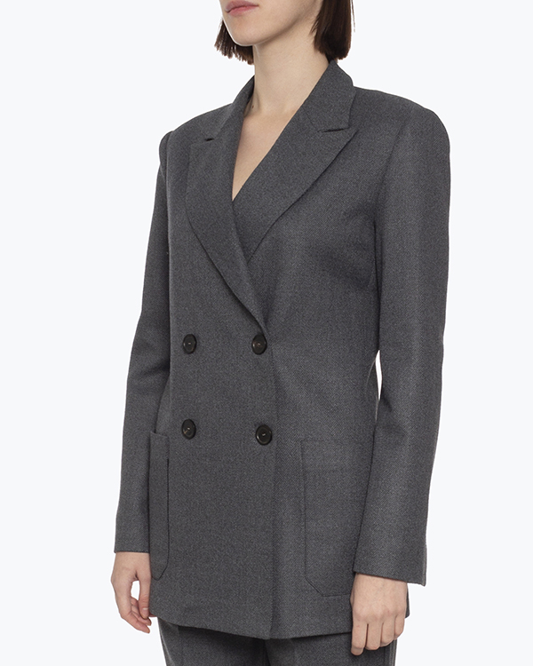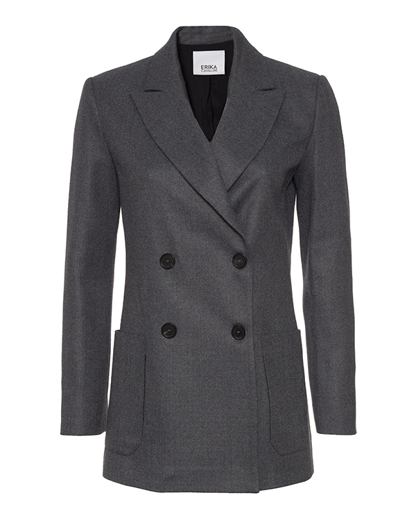 Костюмный жакет Erika Cavallini из новой осенне-зимней коллекции 21/22 выполнен из текстильного полотна с добавлением шерсти серого оттенка. Прямой крой дополнен двубортной застежкой на пуговицы. Отложной воротник и два накладных кармана.