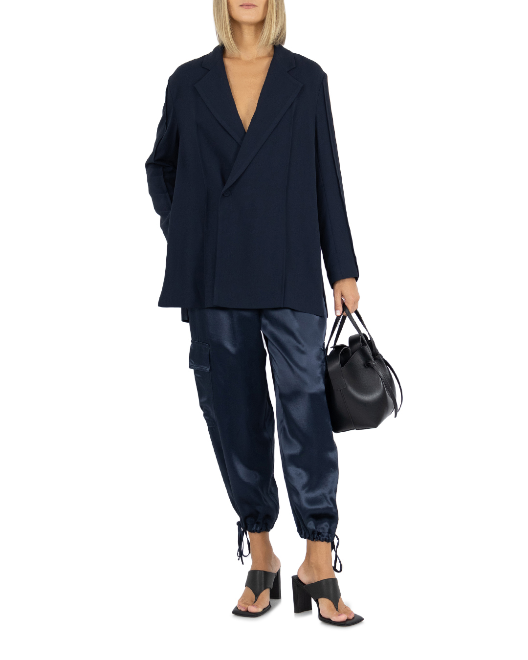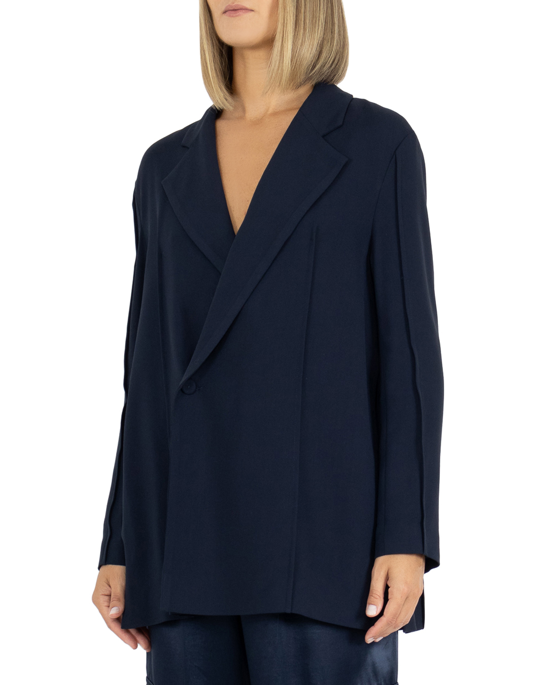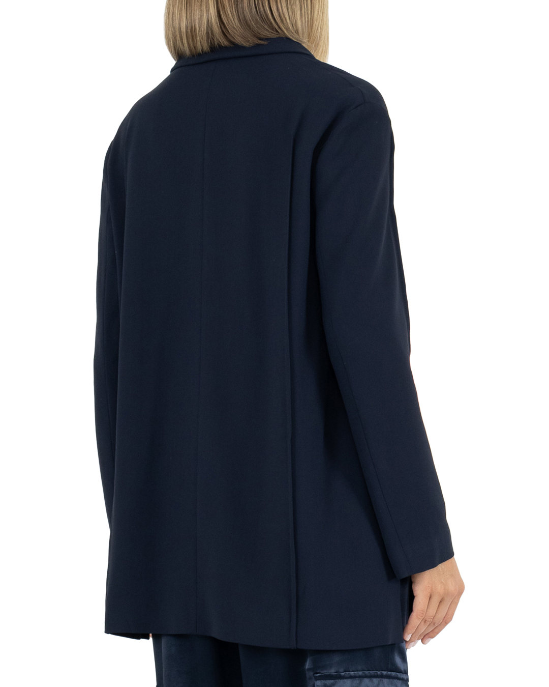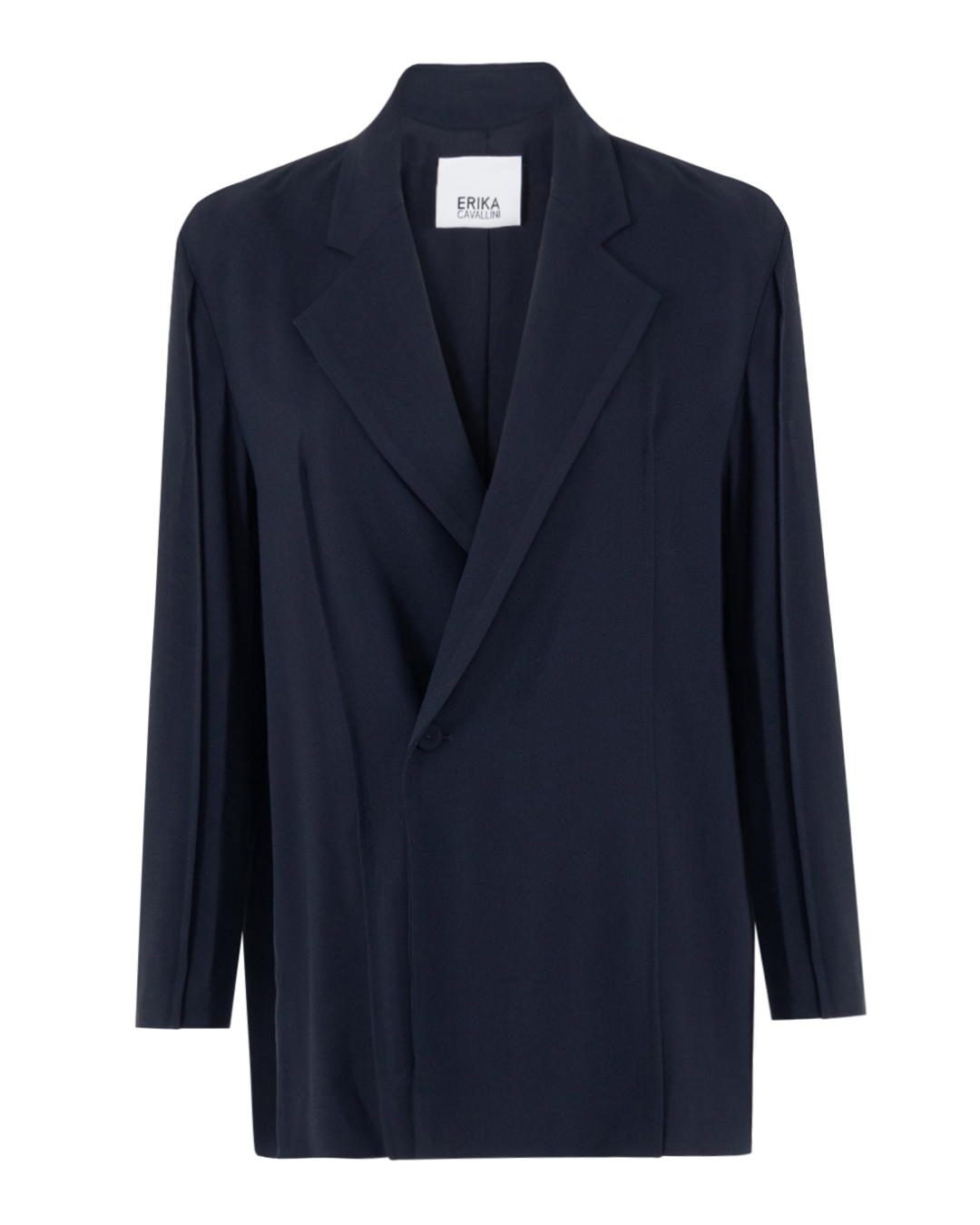 Жакет Erika Cavallini из вискозы темно-синего оттенка. Модель прямого свободного силуэта с застежкой на пуговицу.