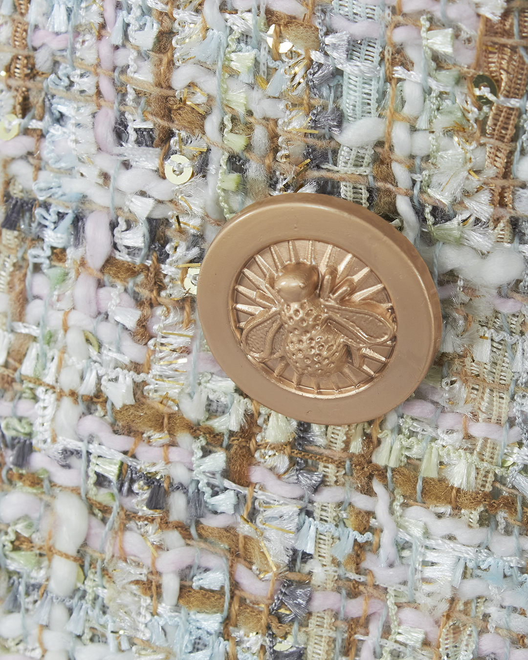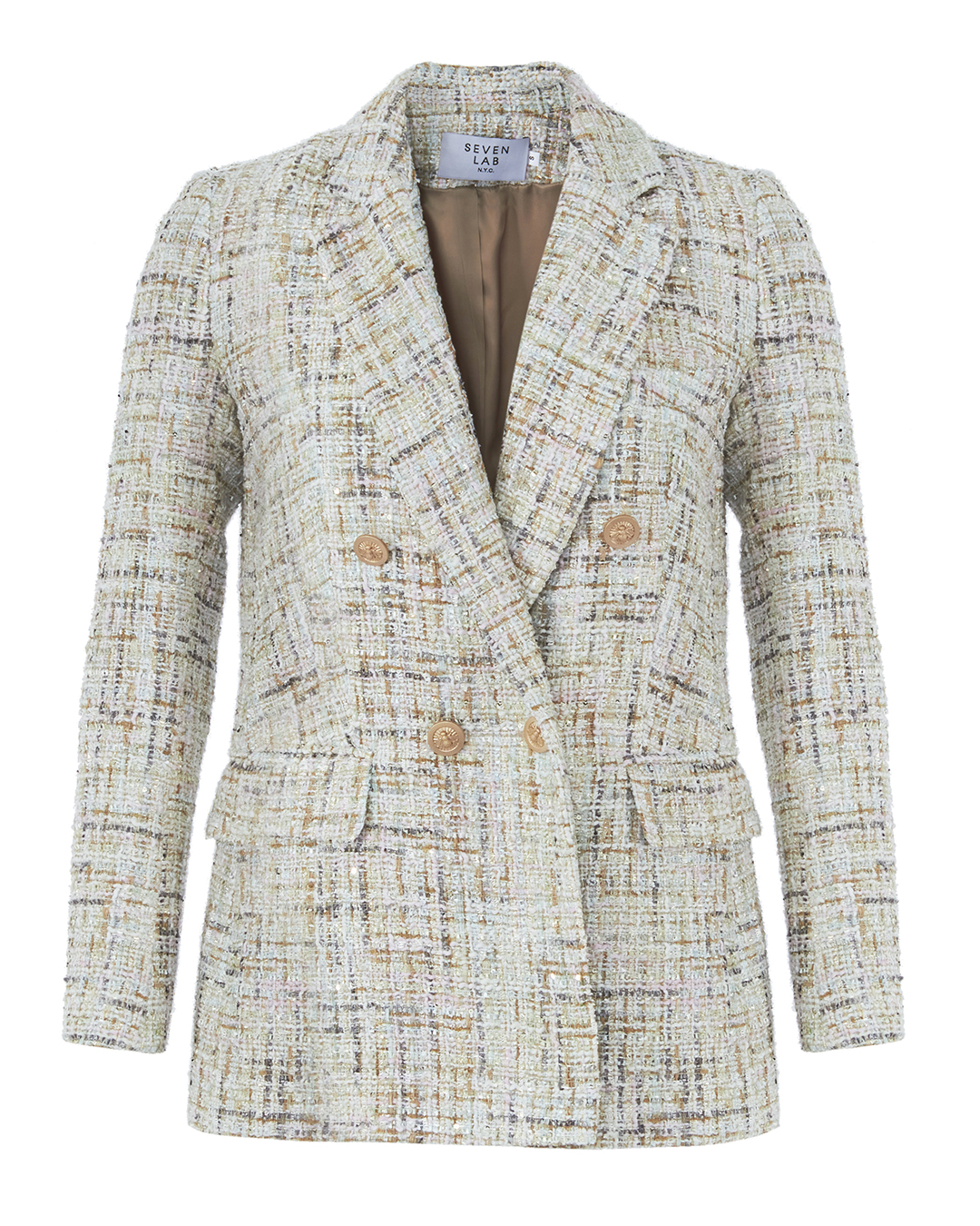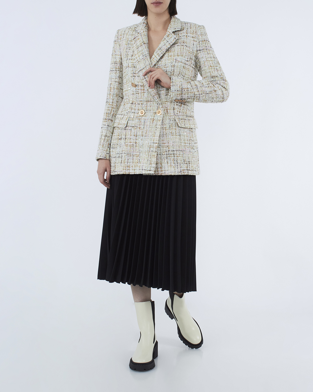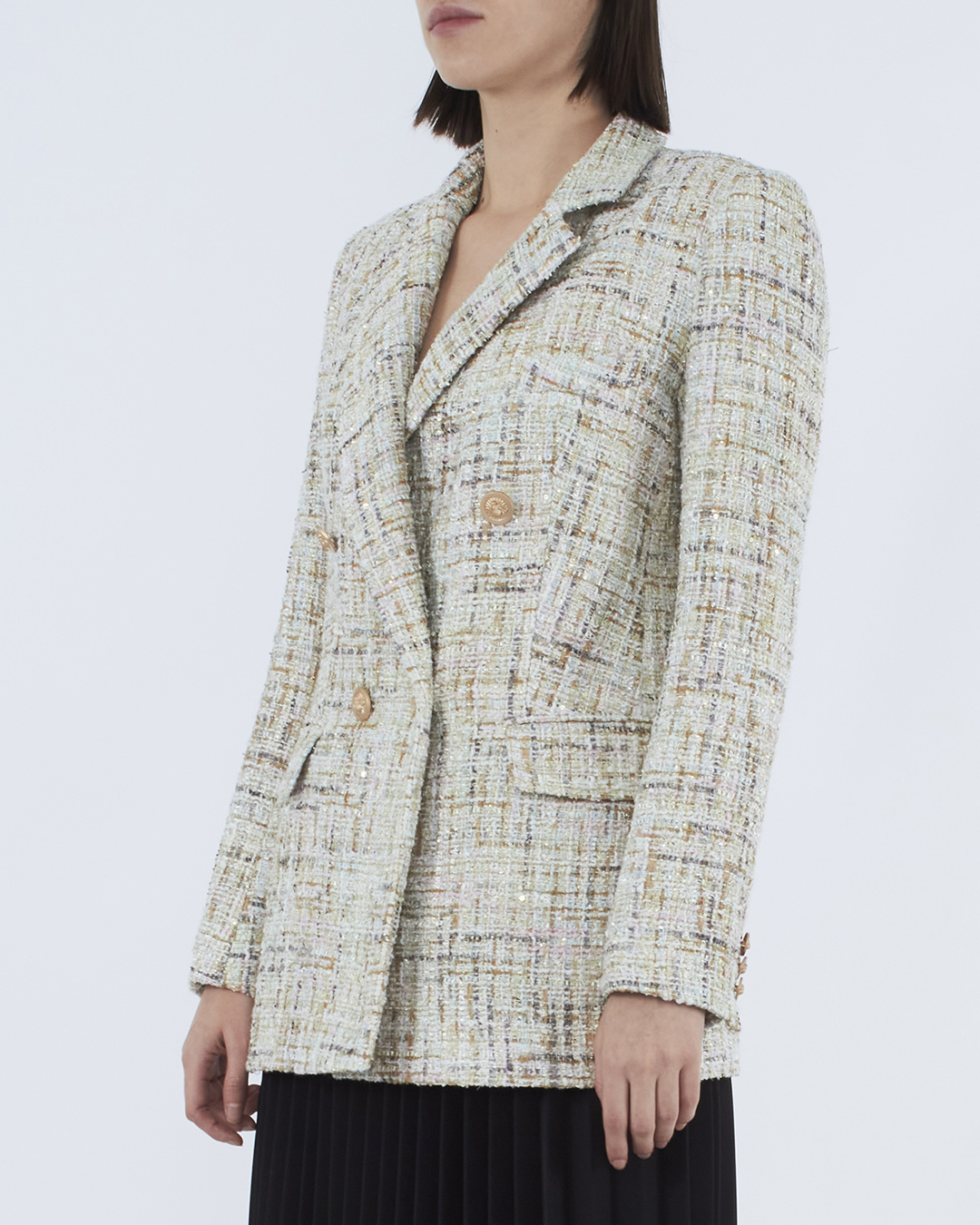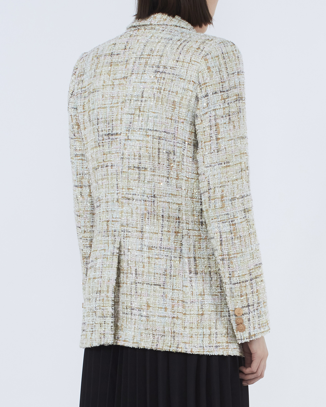 Жакет Seven Lab из новой коллекции сезона FW’22/23 сшит из буклированного хлопка молочного оттенка на подкладке. Прямой крой дополнен отложным воротником, двумя прорезными карманами с клапанами и двубортной застежкой на пуговицы.
