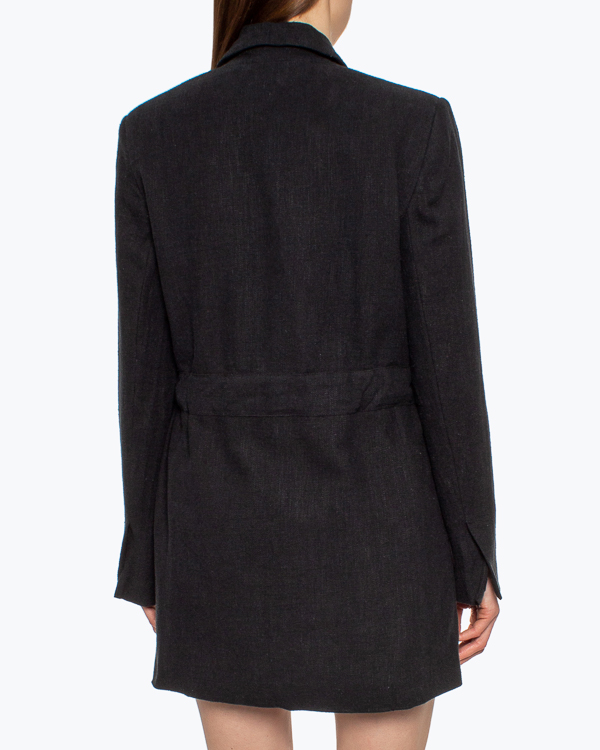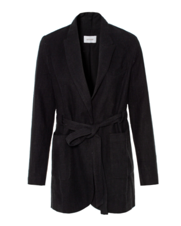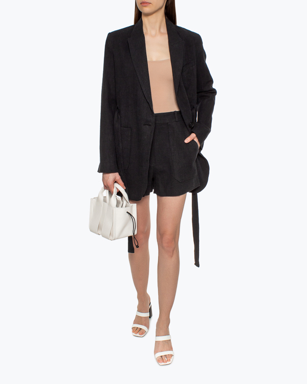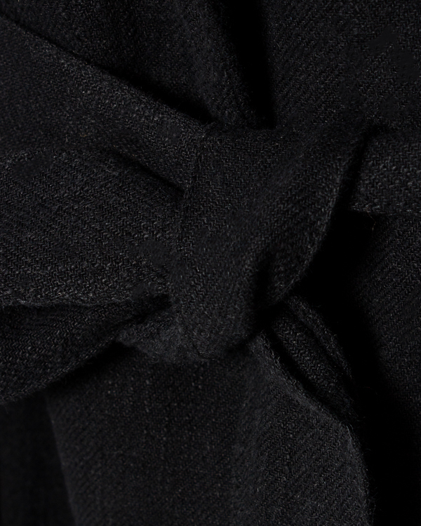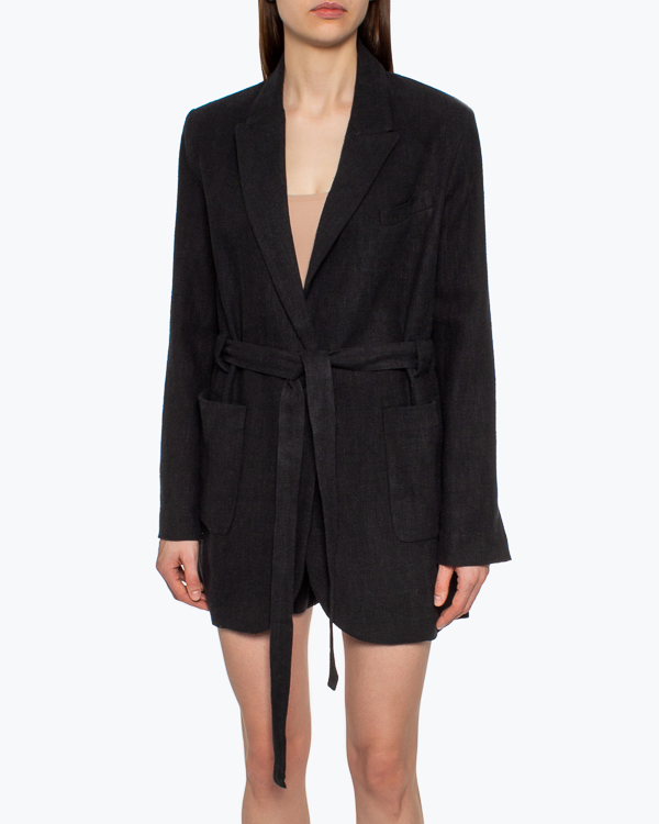 Жакет выполнен из мешковатого материала район черного цвета. Модель прямого силуэта с застежкой на пуговицу, дополненная поясом из основного материала. Два накладных кармана по бокам.