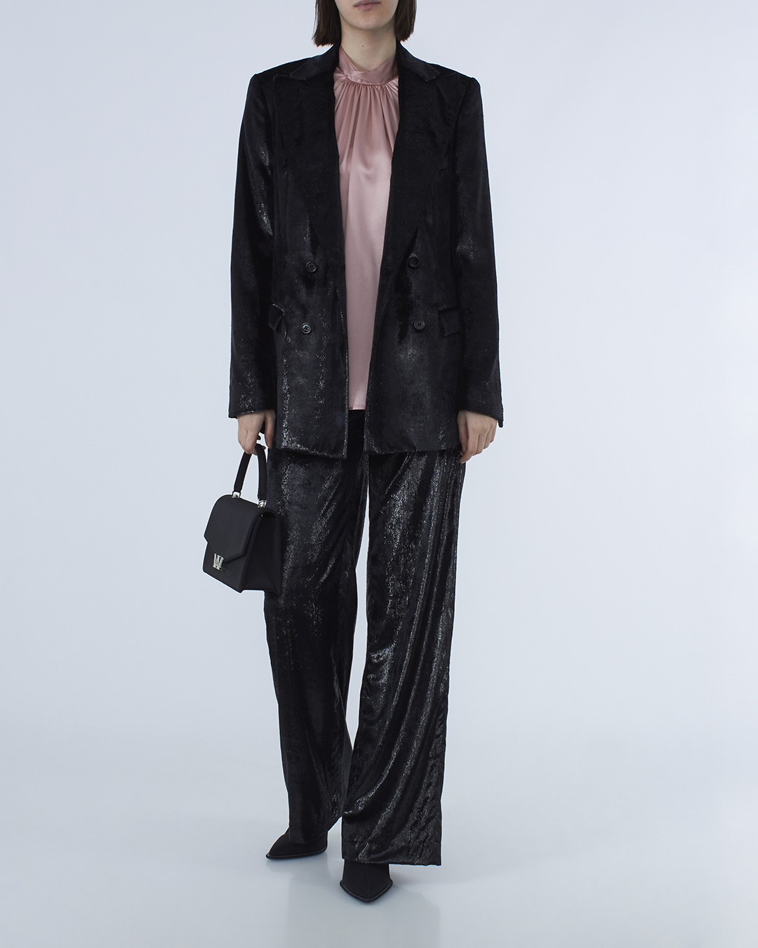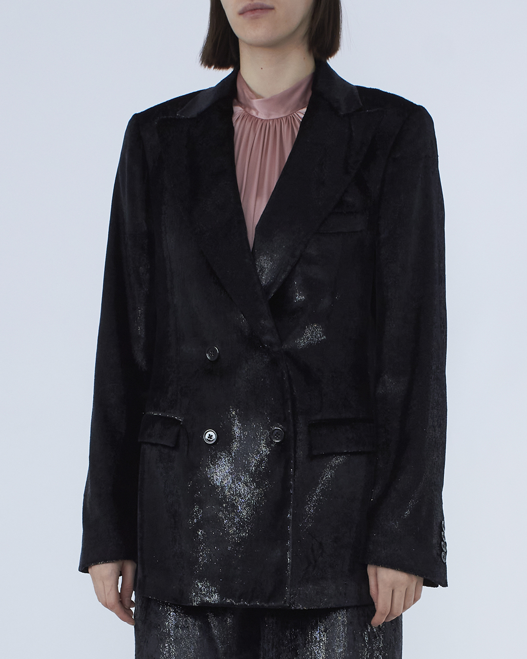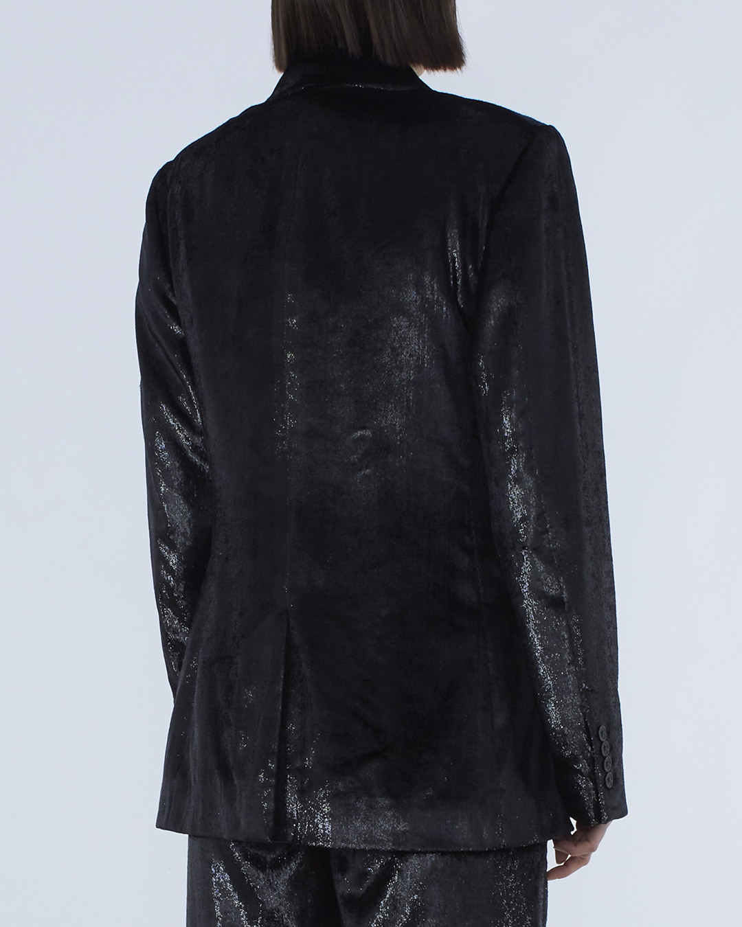 Жакет Veronica Iorio из эластичного бархатного материала черного цвета. Модель прямого силуэта в ретро-стиле с застежкой на пуговицы и отложным воротником с двумя прорезными карманами с клапанами.