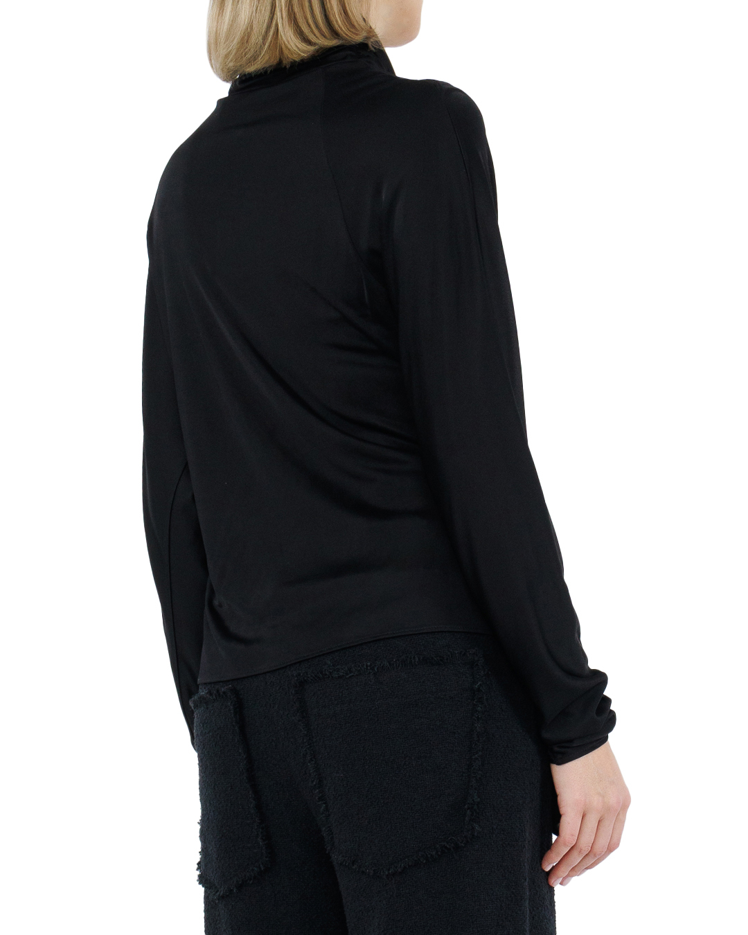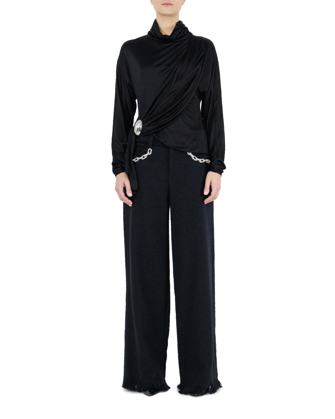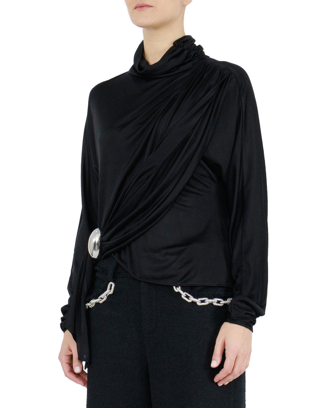 Эта блуза — настоящая икона элегантности и современного шика. Она выполнена из гладкой, струящейся ткани глубокого чёрного цвета, которая изысканно отражает свет, создавая мерцающий эффект.  Высокий ворот стойка придаёт образу утончённость и обрамляет шею с изяществом. Ассиметричная драпировка, создающая легкие складки, добавляет динамичности, мягко подчеркивая женственность силуэта.  Смелым акцентом является декоративная застёжка в виде металлической броши, которая элегантно фиксирует драпировку и добавляет нотку авангарда. Этот элемент привлекает внимание, придавая модели уникальность и стиль.  Длинные рукава с узким манжетом сохраняют общий баланс и делают блузу идеально подходящей для разнообразных ситуаций — от деловых встреч до вечерних прогулок.  Мастерство исполнения видно в каждой детали — от аккуратных швов до продуманной драпировки. Эта блуза станет центральной деталью вашего гардероба, добавляя выразительности и изысканности любому образу.