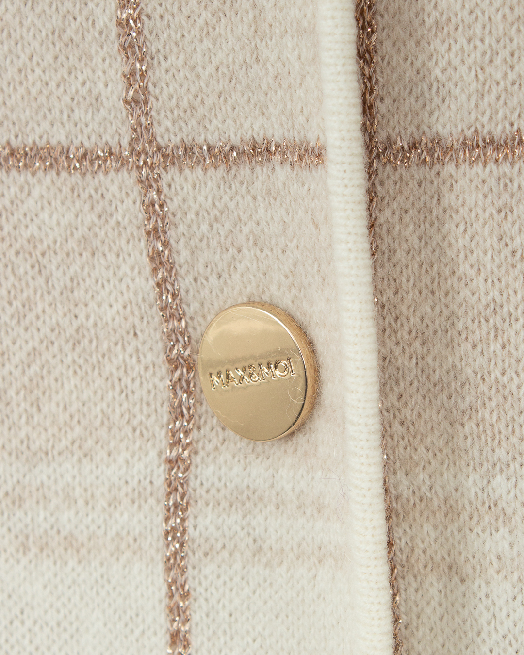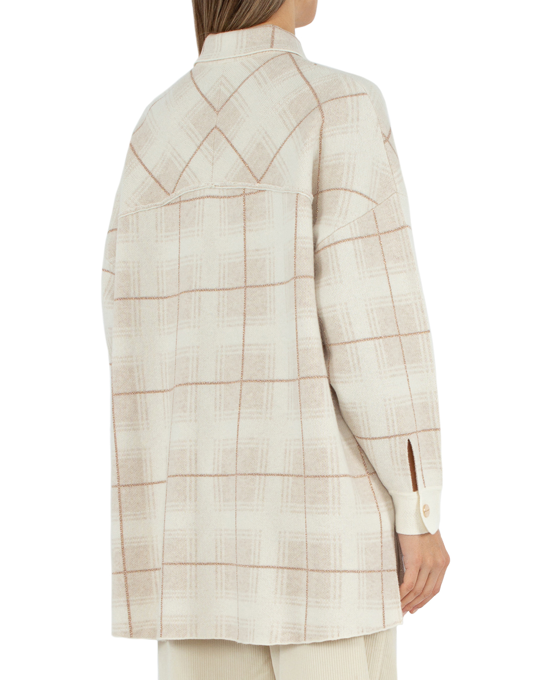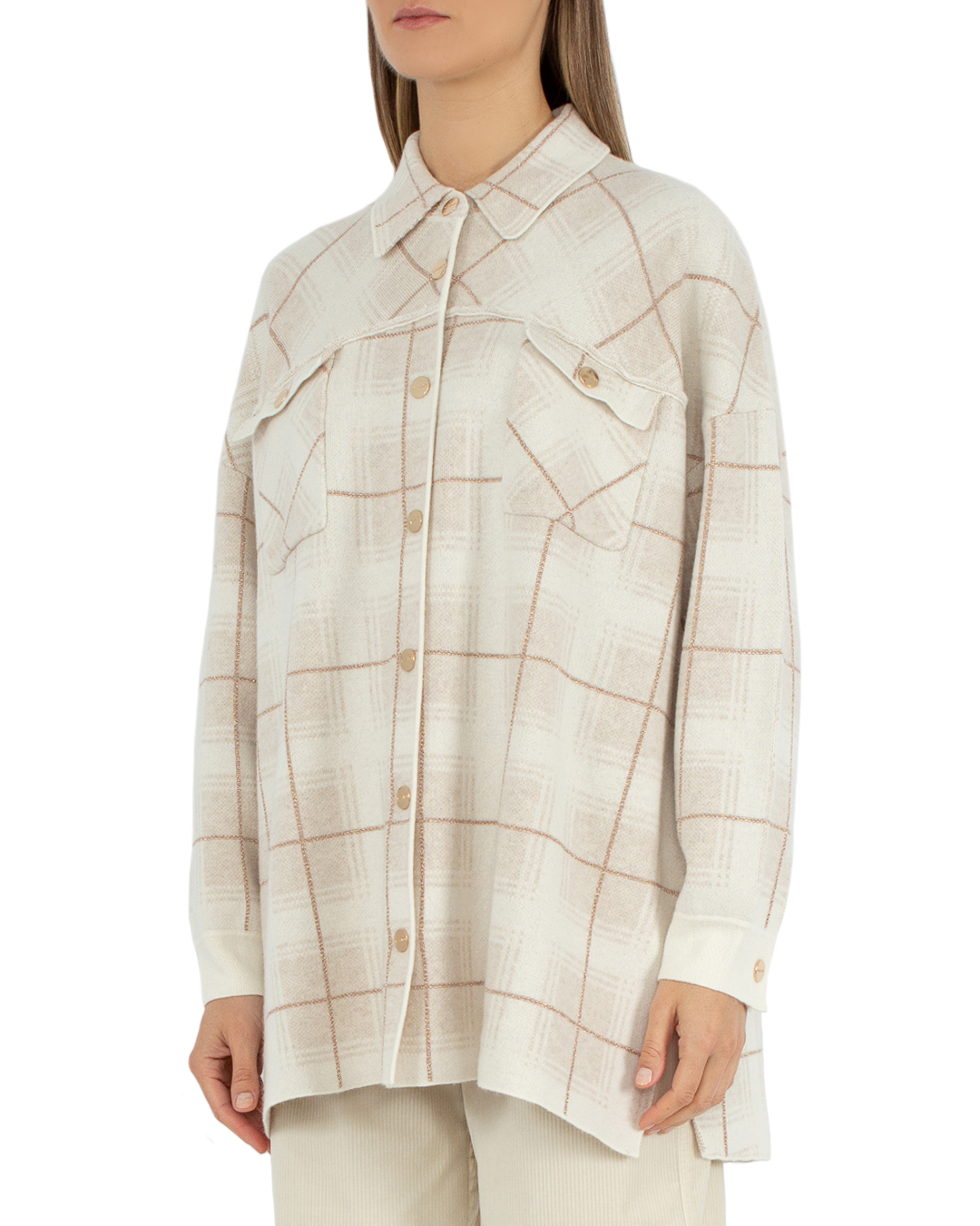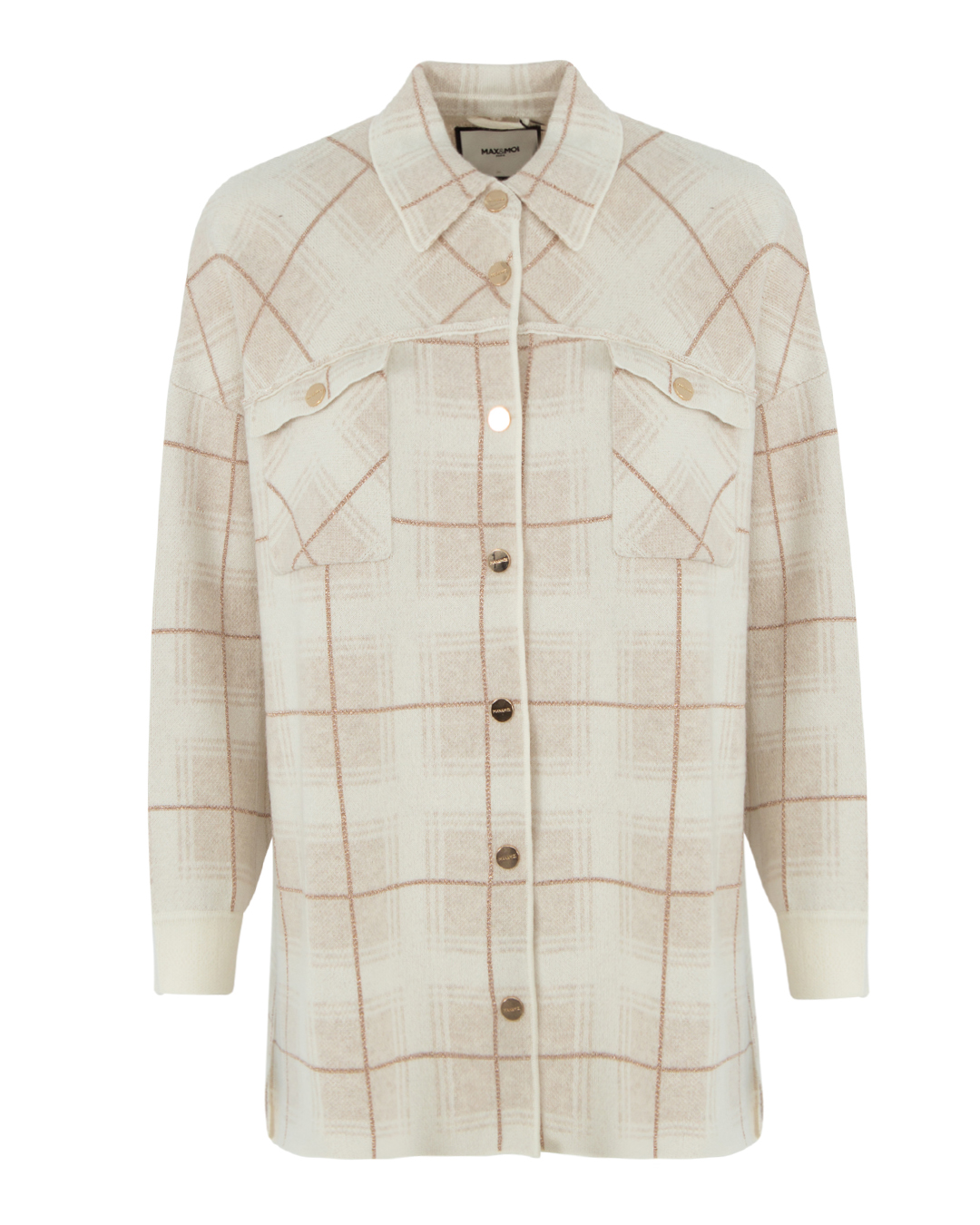 Рубашка MAX&MOI из мягкой шерсти с добавлением кашемира бежевого оттенка в клетку. Прямой свободный силуэт дополнен застежкой на кнопки с гравировкой бренда, накладными карманами и отложным воротником.