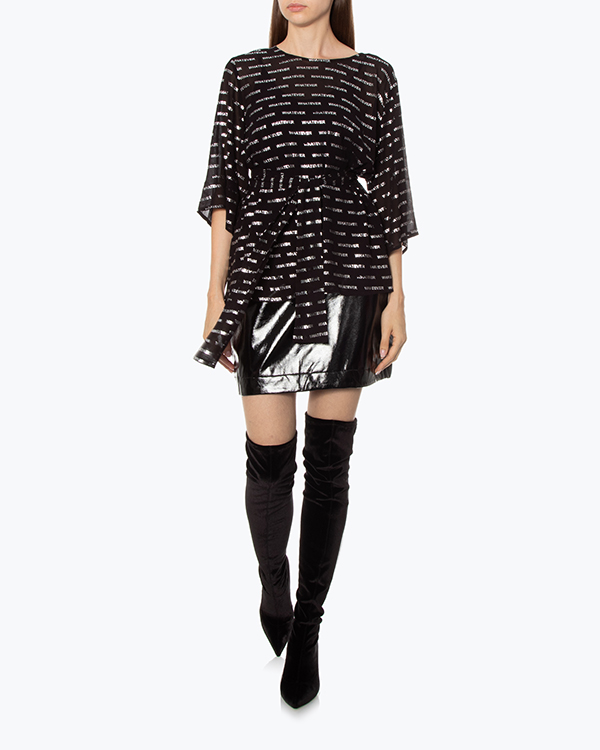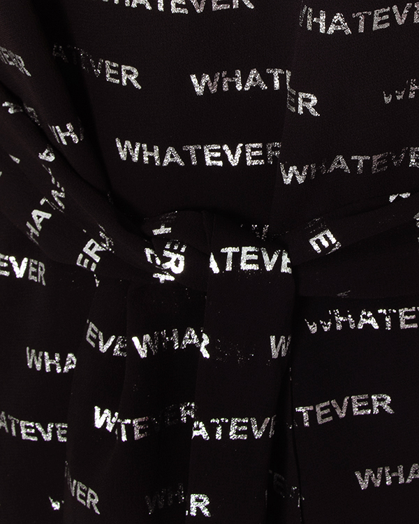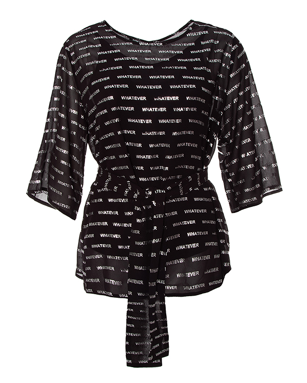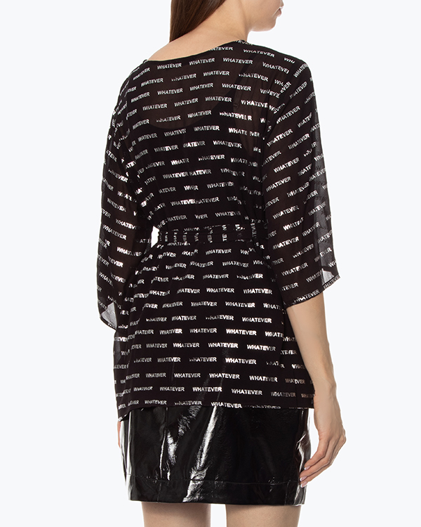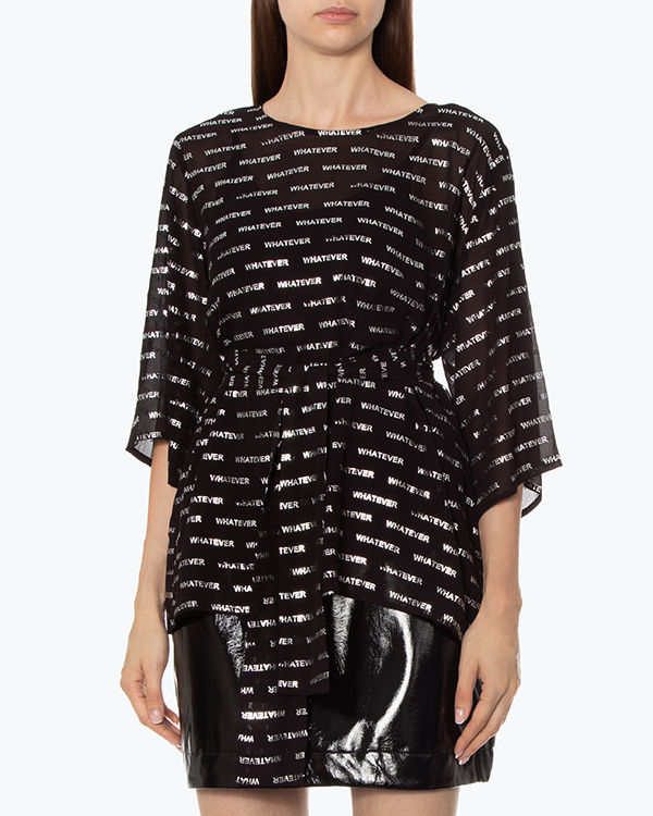Блуза из полупрозрачной вискозы черного цвета с серебряным текстовым принтом. Модель прямого силуэта со спущенной линией плеч дополнена поясом из основного материала.