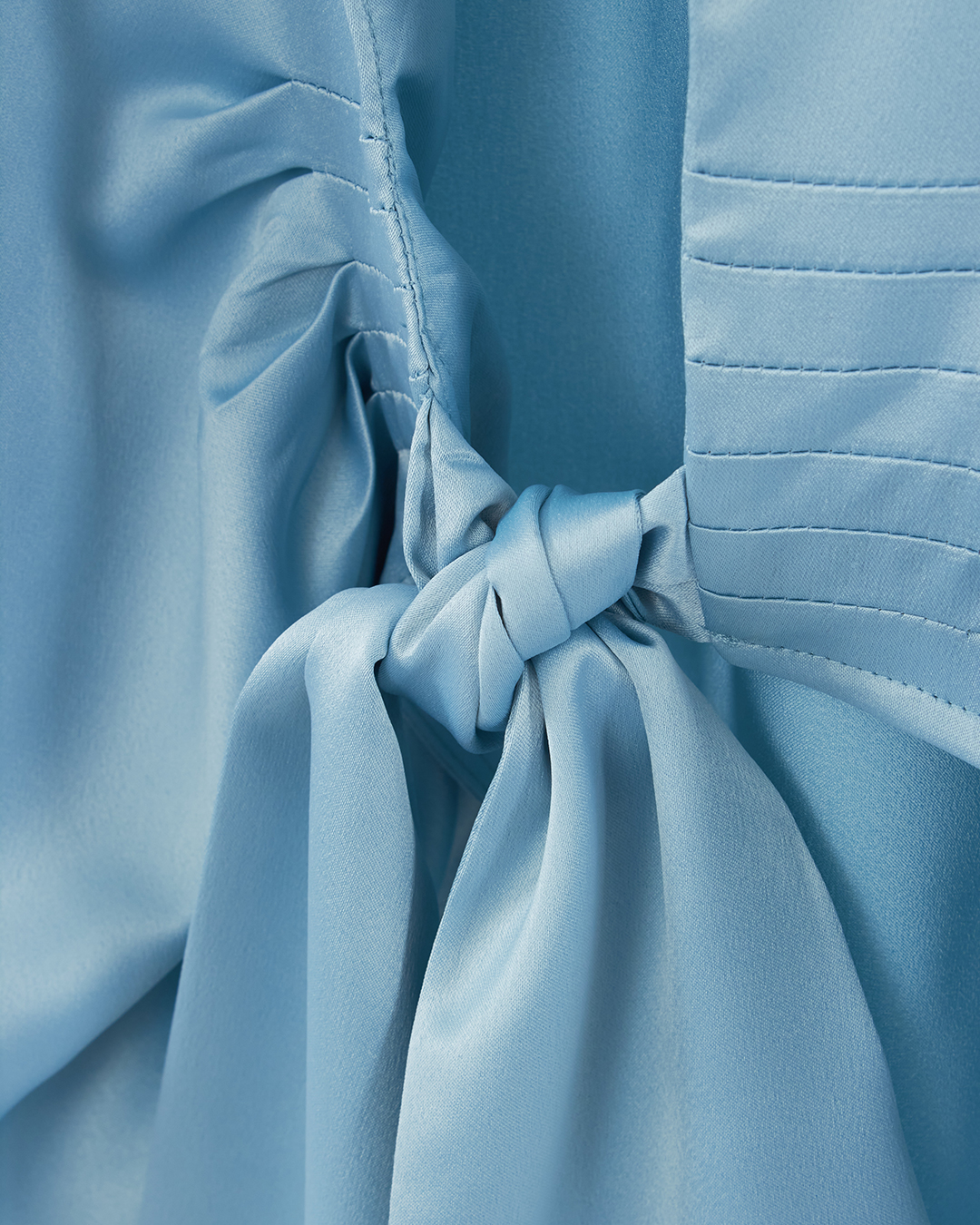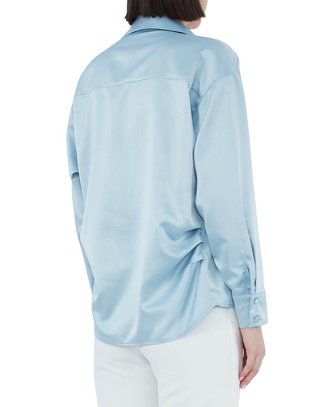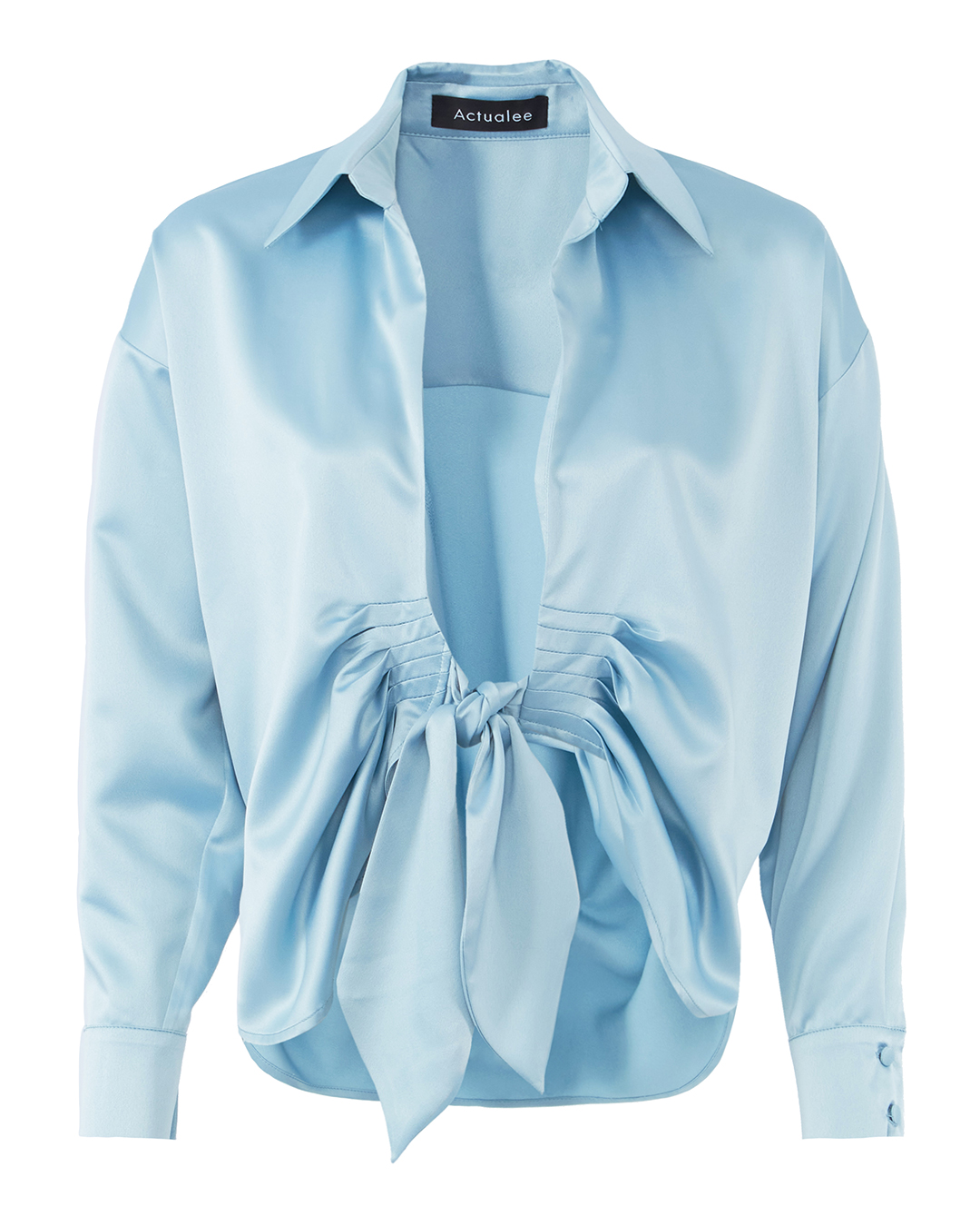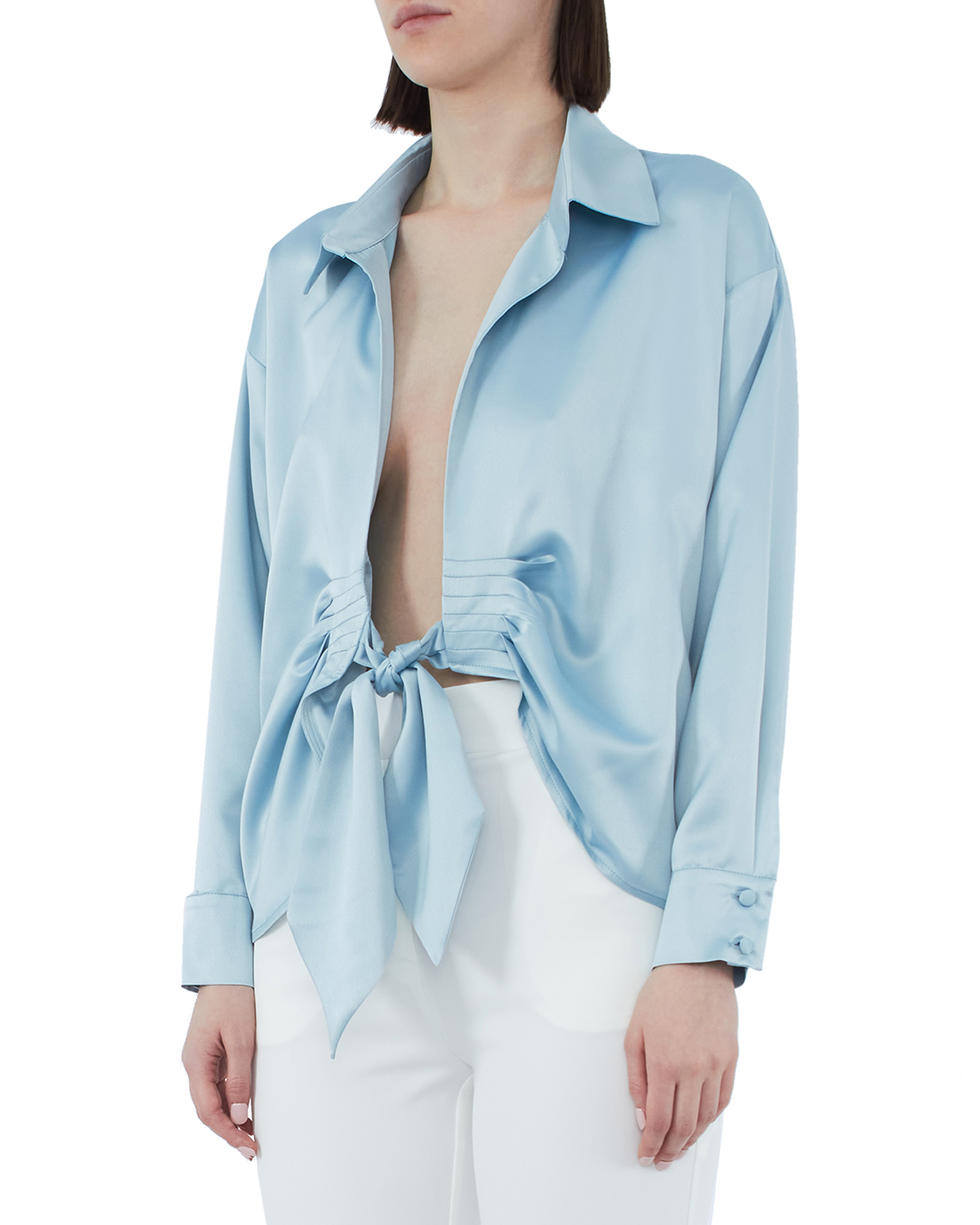 Блуза из атласного материала. Изделие расслабленного свободного силуэта с завязками с лицевой стороны. Блуза дополнена отложным воротником.