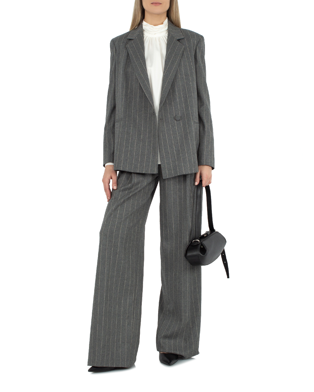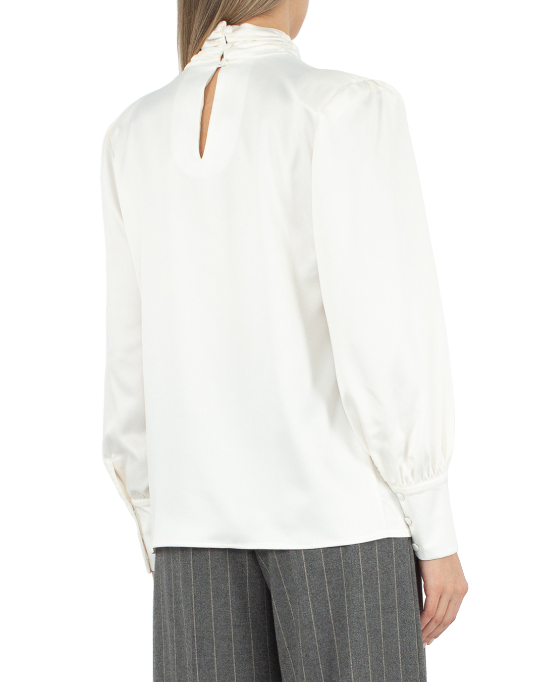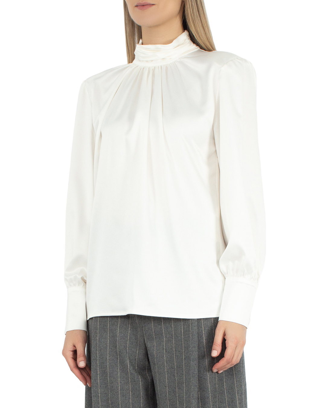 Блуза ACTUALEE из атласного материала. Модель прямого силуэта со сборкой материала, длинными рукавами и воротником-стойкой.