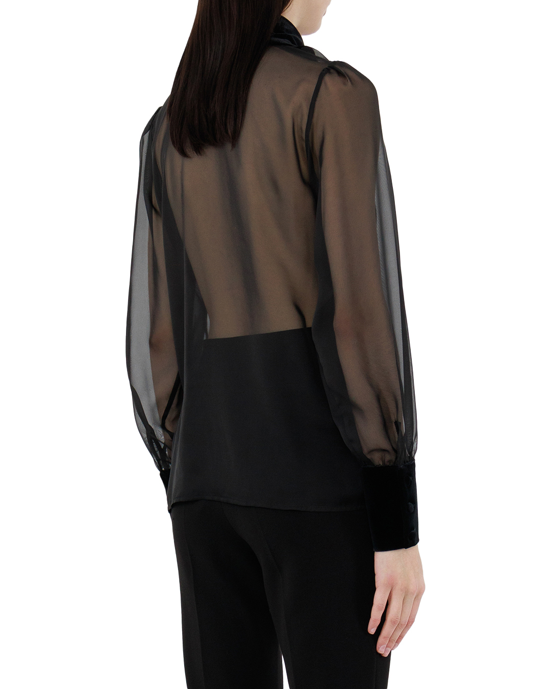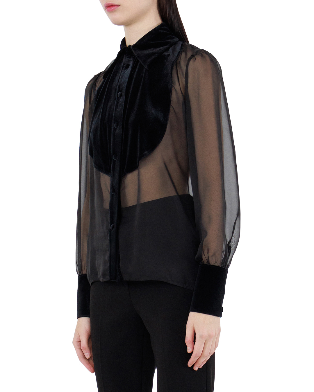 Эта блуза представляет собой воплощение утонченной элегантности и современного стиля. Выполненная из прозрачного шифона, она излучает непринужденную изящность и добавляет интригующую легкость в образ. Главное внимание на эффектную отделку центральной планки и воротника, выполненных из бархата, который придает модели роскошную текстуру и выразительность. Бархатные пуговицы аккуратно акцентируют линию застежки, добавляя гармонию и завершенность. Слегка приталенный крой и прямые линии швов создают сбалансированный силуэт, который подчеркивает фигуру, не ограничивая движений. Манжеты из бархата обеспечивают контраст и акцентируют внимание на изяществе рук, придавая классический и аккуратный вид. Эта изысканная блуза идеально подойдет для создания вечернего или делового образа, являясь прекрасным компаньоном как для строгих юбок, так и для стильных брюк.