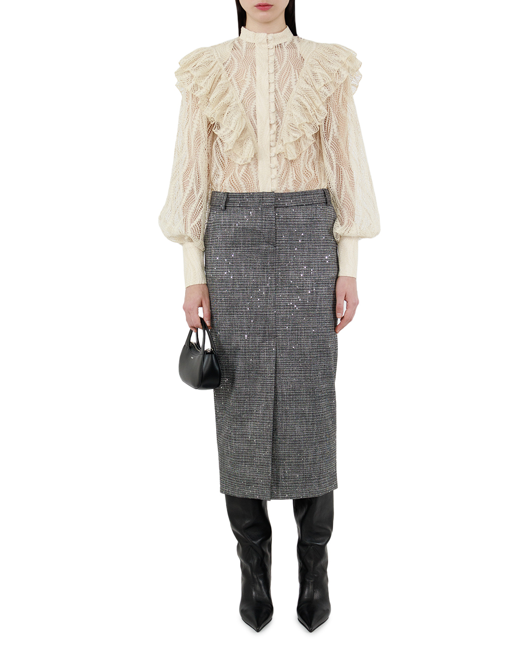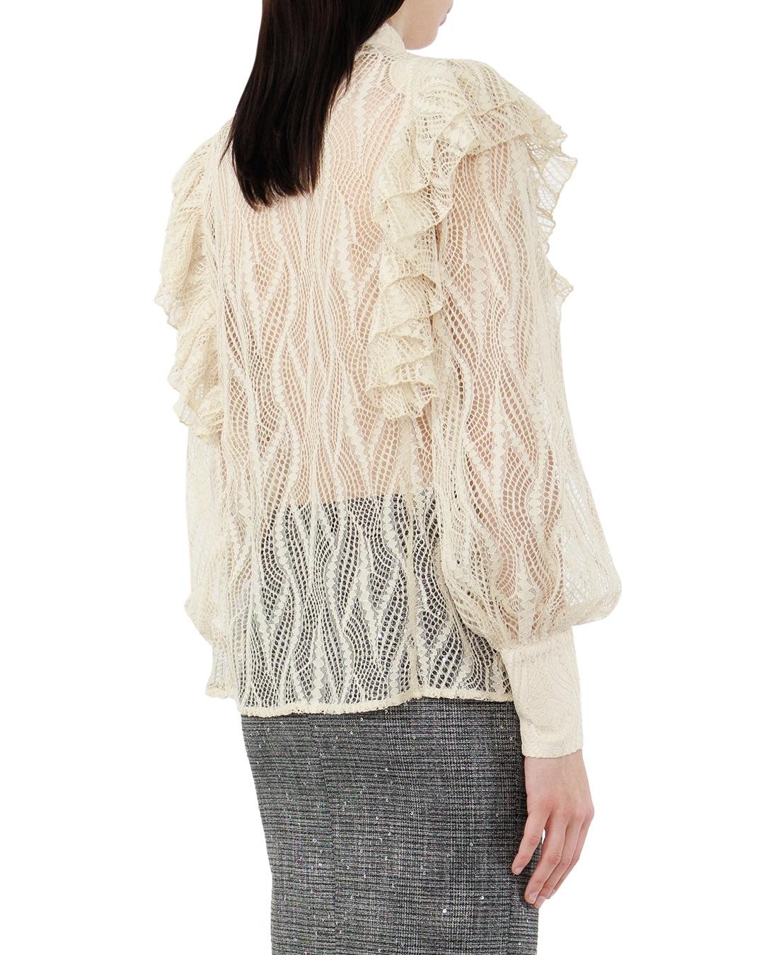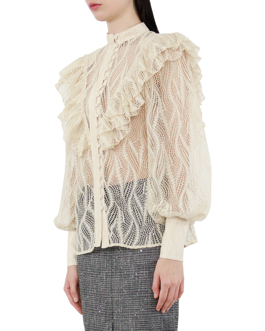Эта блуза — настоящий шедевр в мире моды. Выполненная из деликатного кружева, она создает впечатление романтичной легкости и утонченности. Полупрозрачная структура ткани придаёт модели загадочность и элегантность, играя на грани чувственности. Элегантные воланы, акцентирующие плечи и переднюю часть, создают мягкий объем и динамику, добавляя в образ выразительность и театральность. Высокая стойка-воротник добавляет строгость и классический шик, обеспечивая идеальный баланс между роскошью и сдержанностью. Застежка с обтянутыми пуговицами гармонично вписывается в общий дизайн, придавая блузе законченный вид и подчеркивая внимание к деталям. Плотные манжеты на рукавах делают акцент на утонченности и изяществе рук, добавляя структуру и контраст. Эта блуза станет ярким акцентом гардероба, превосходно дополняя как вечерний, так и повседневный look, и подчеркивая безупречный вкус ее обладательницы.