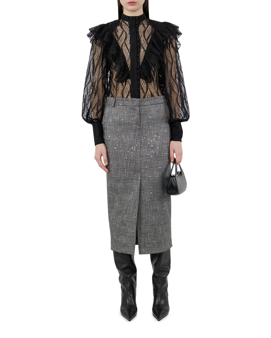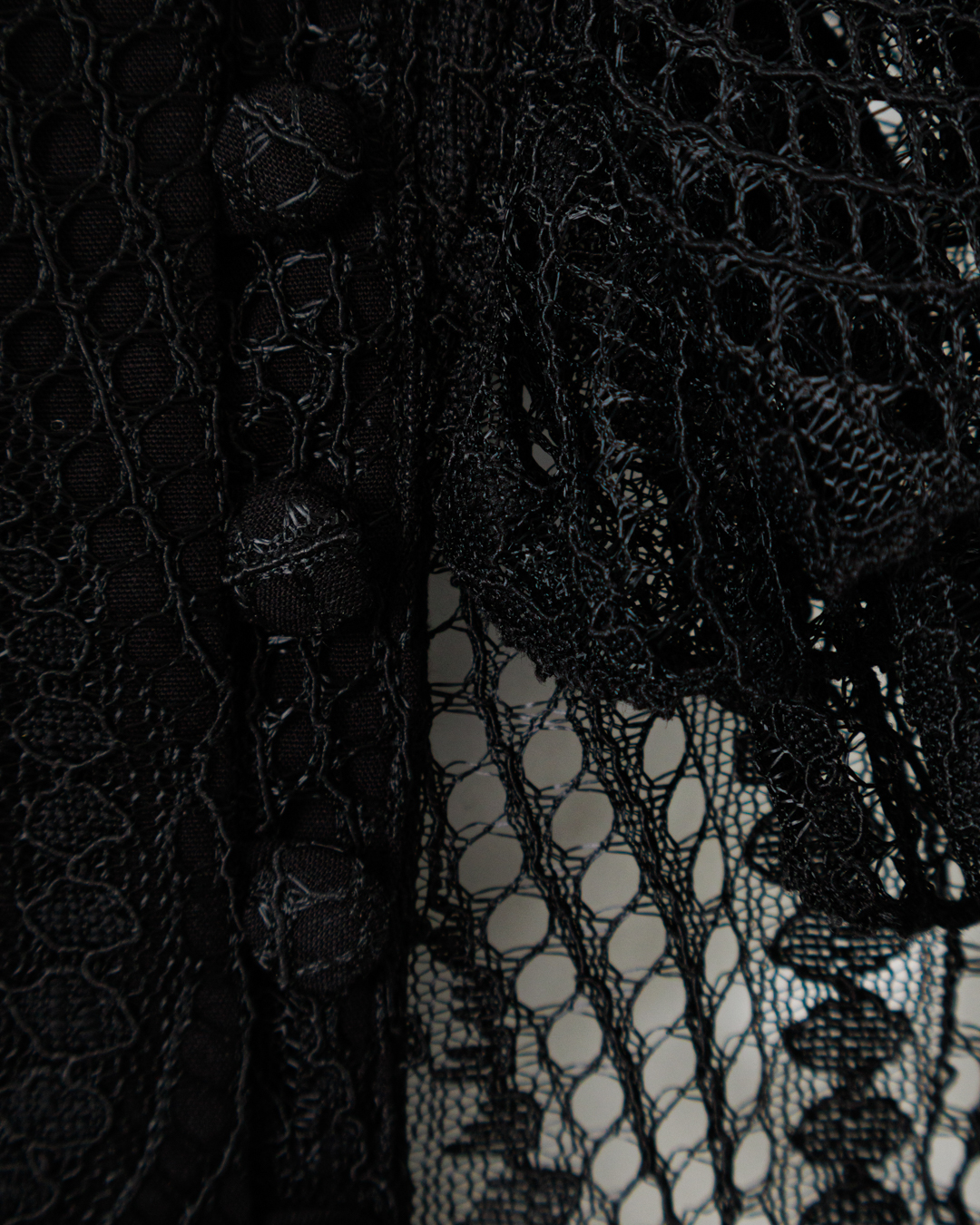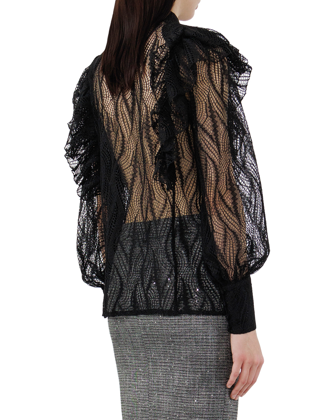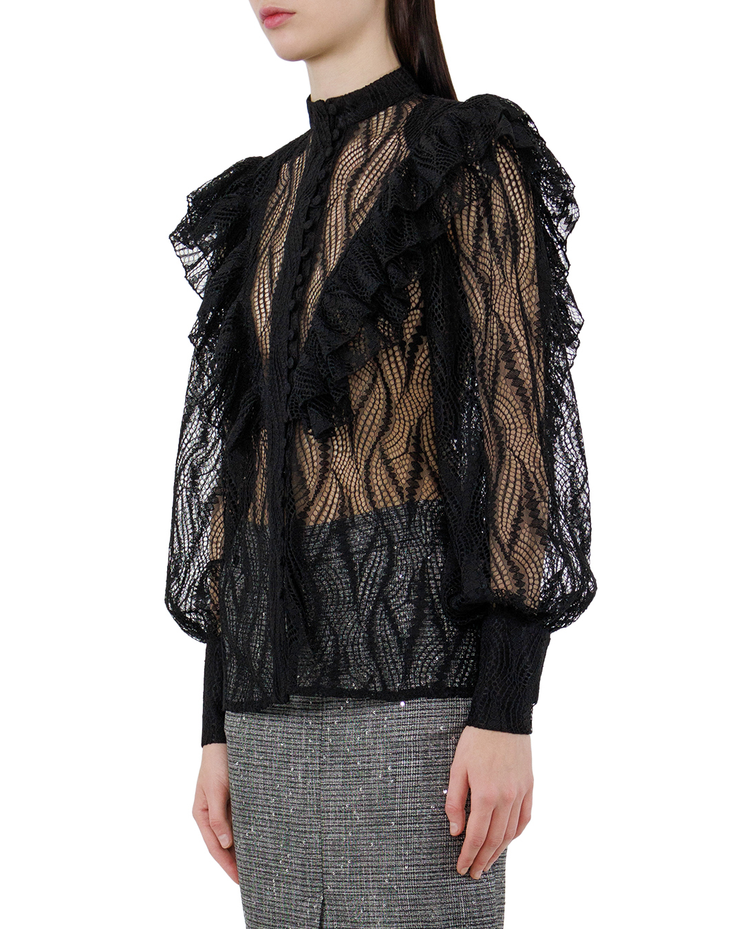 Эта блуза — настоящий шедевр в мире моды. Выполненная из деликатного кружева, она создает впечатление романтичной легкости и утонченности. Полупрозрачная структура ткани придаёт модели загадочность и элегантность, играя на грани чувственности. Элегантные воланы, акцентирующие плечи и переднюю часть, создают мягкий объем и динамику, добавляя в образ выразительность и театральность. Высокая стойка-воротник добавляет строгость и классический шик, обеспечивая идеальный баланс между роскошью и сдержанностью. Застежка с обтянутыми пуговицами гармонично вписывается в общий дизайн, придавая блузе законченный вид и подчеркивая внимание к деталям. Плотные манжеты на рукавах делают акцент на утонченности и изяществе рук, добавляя структуру и контраст. Эта блуза станет ярким акцентом гардероба, превосходно дополняя как вечерний, так и повседневный look, и подчеркивая безупречный вкус ее обладательницы.