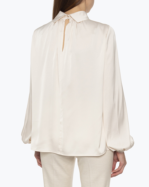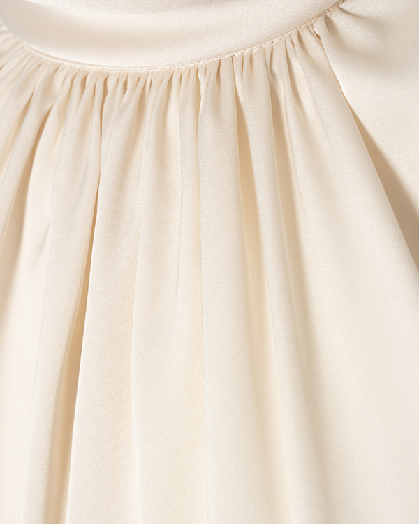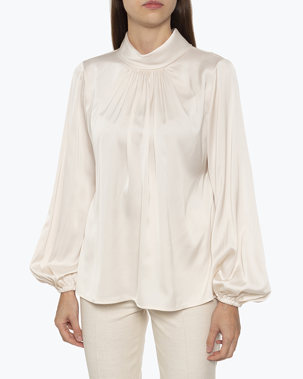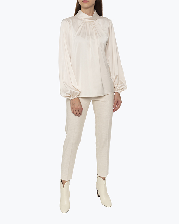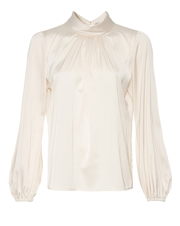 Блуза из атласного материала кремового оттенка. Свободный крой с акцентом на сборку материала по линии выреза и воротником-стойкой. Блуза дополнена воздушными рукавами-буф и застежкой на спине на пуговицы.