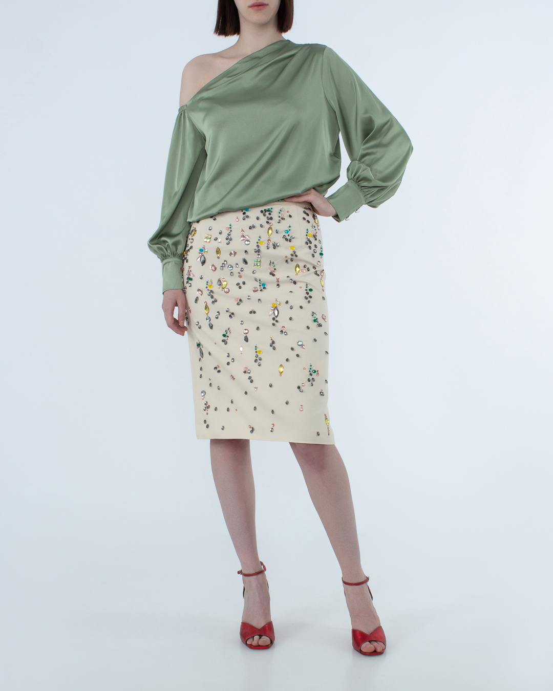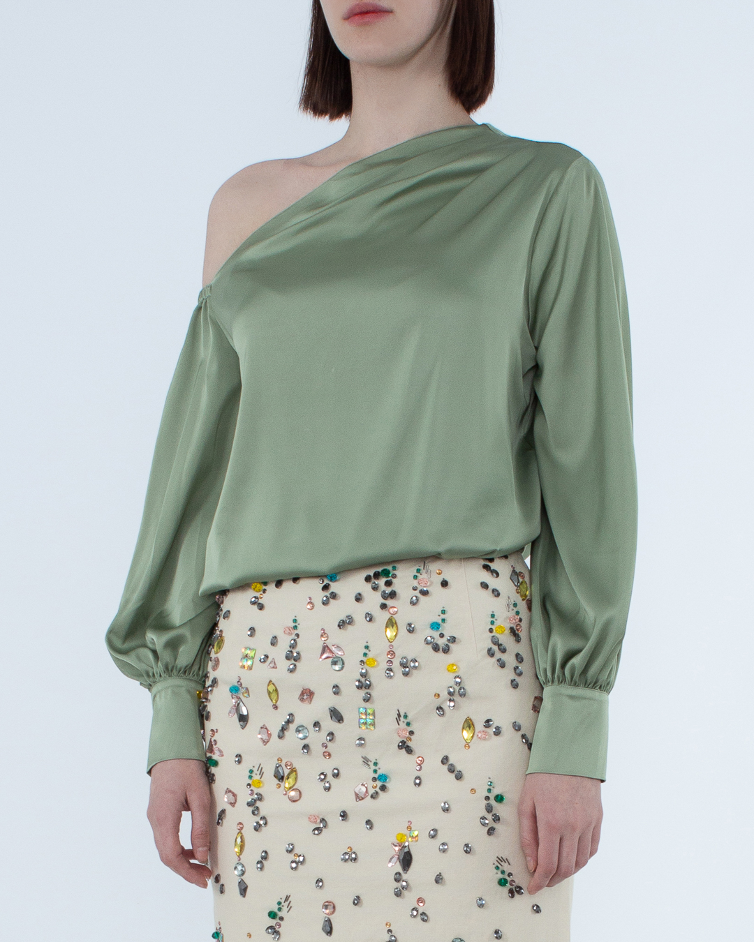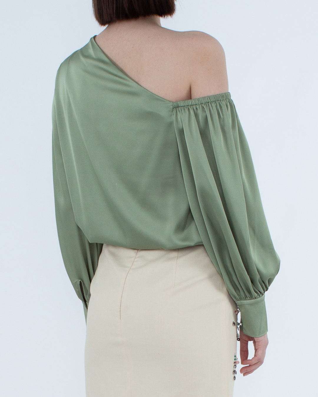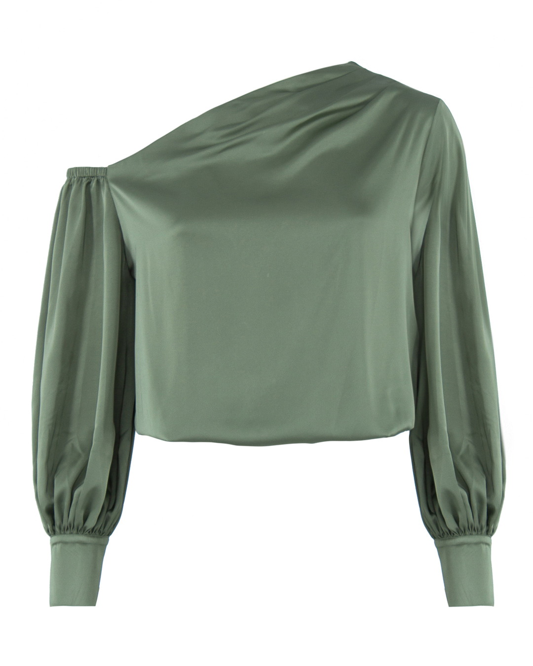 Блуза D.EXTERIOR выполнена из атласного материала зеленого оттенка. Модель с одним открытым плечом дополнено двумя объемными карманами со сборкой материала.