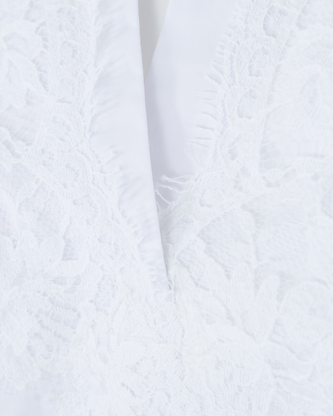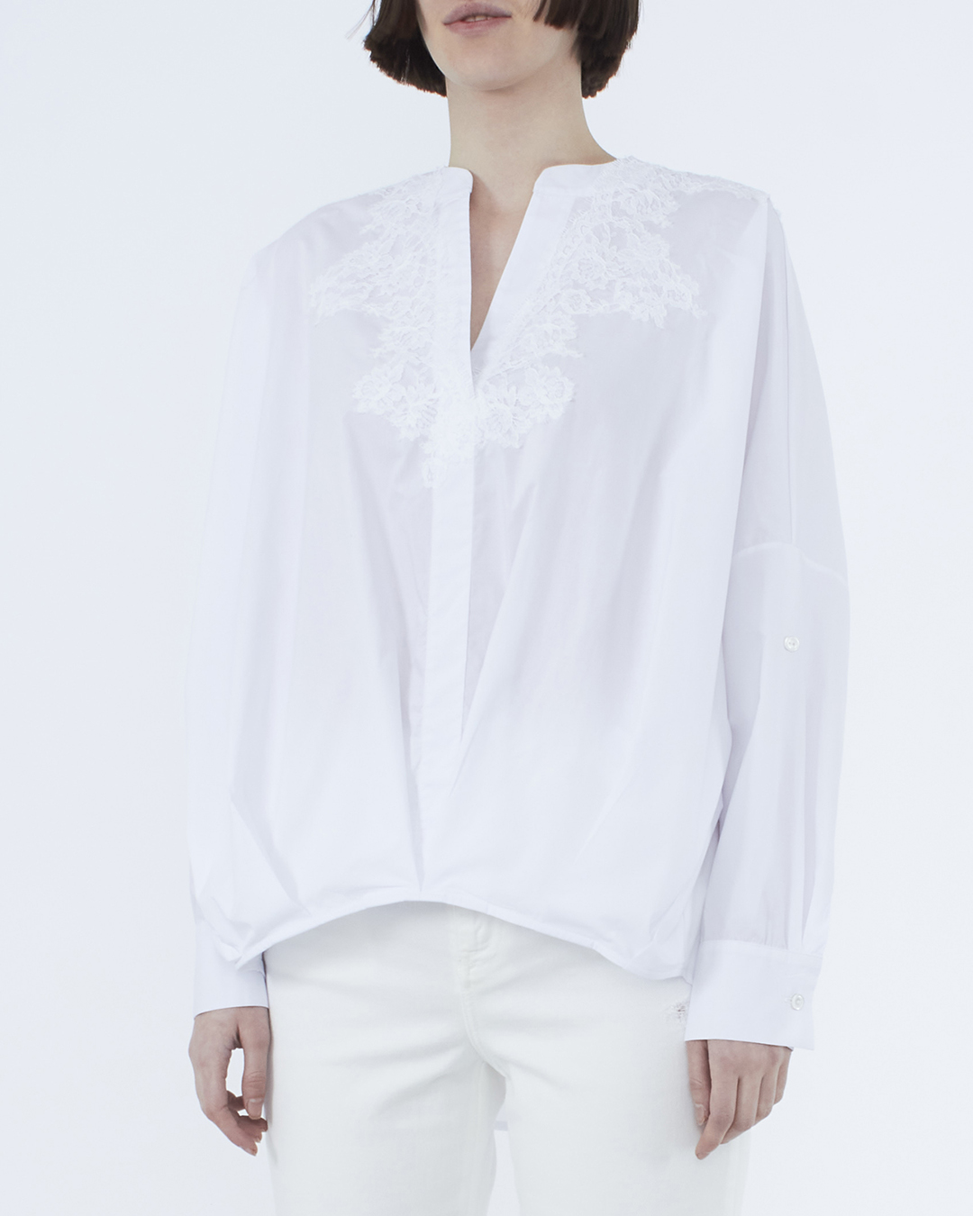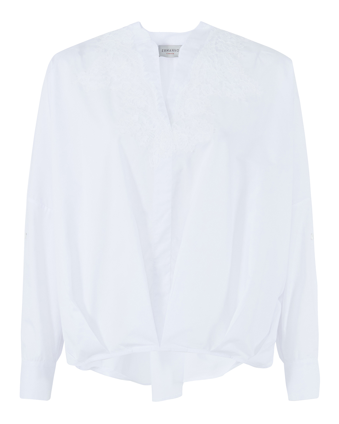 Блуза ERMANNO FIRENZE сшита из хлопка белого цвета. Блуза свободного графичного силуэта с ажурно отделкой.