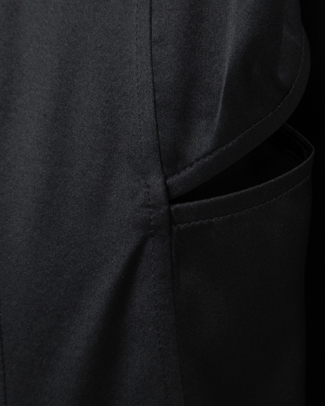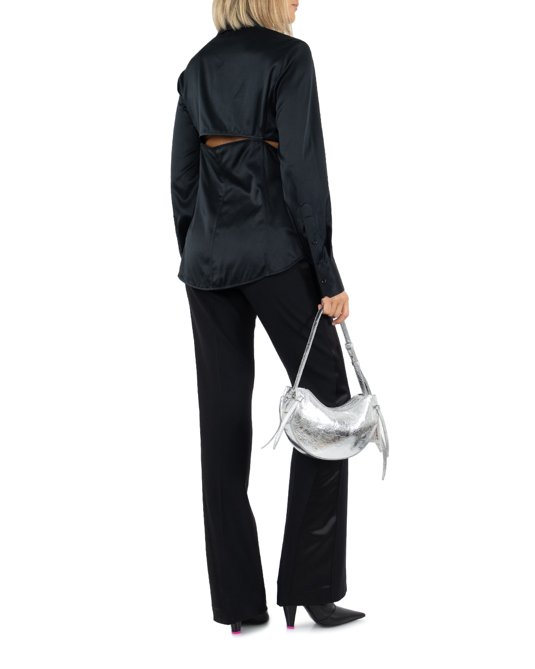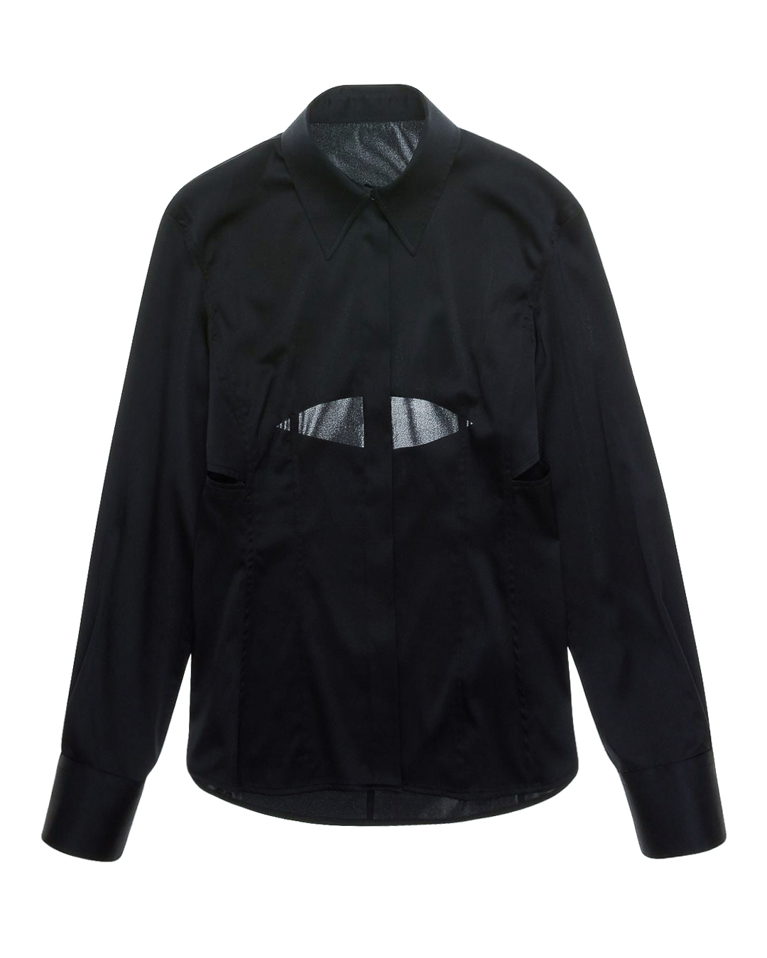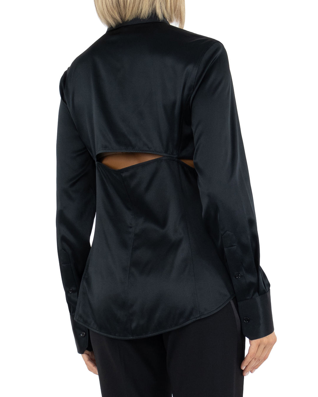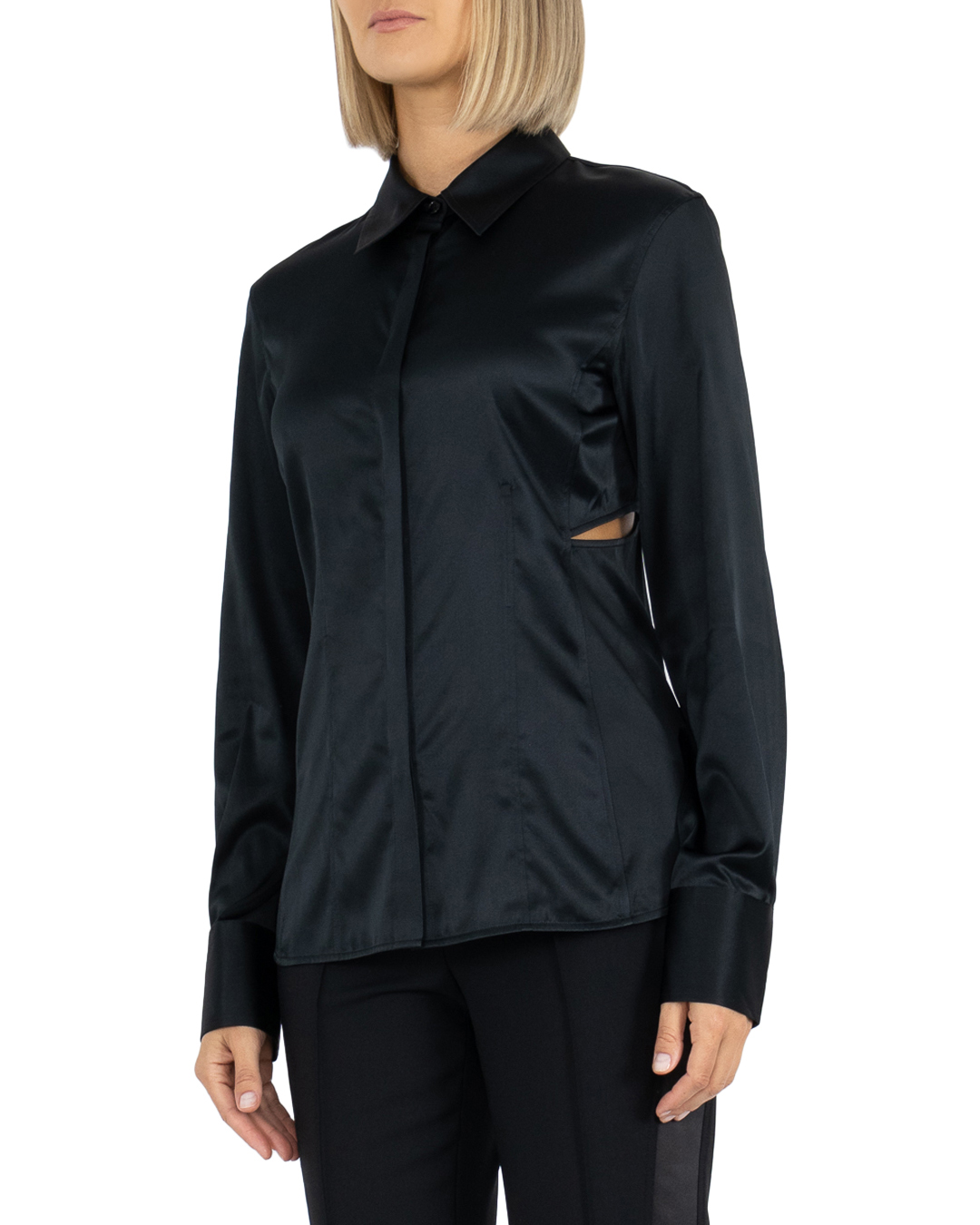 Блуза HELMUT LANG сшита из атласного шелка черного цвета. Модель приталенного силуэта с застежкой на пуговицы и планку. Изделие дополнено разрезами.