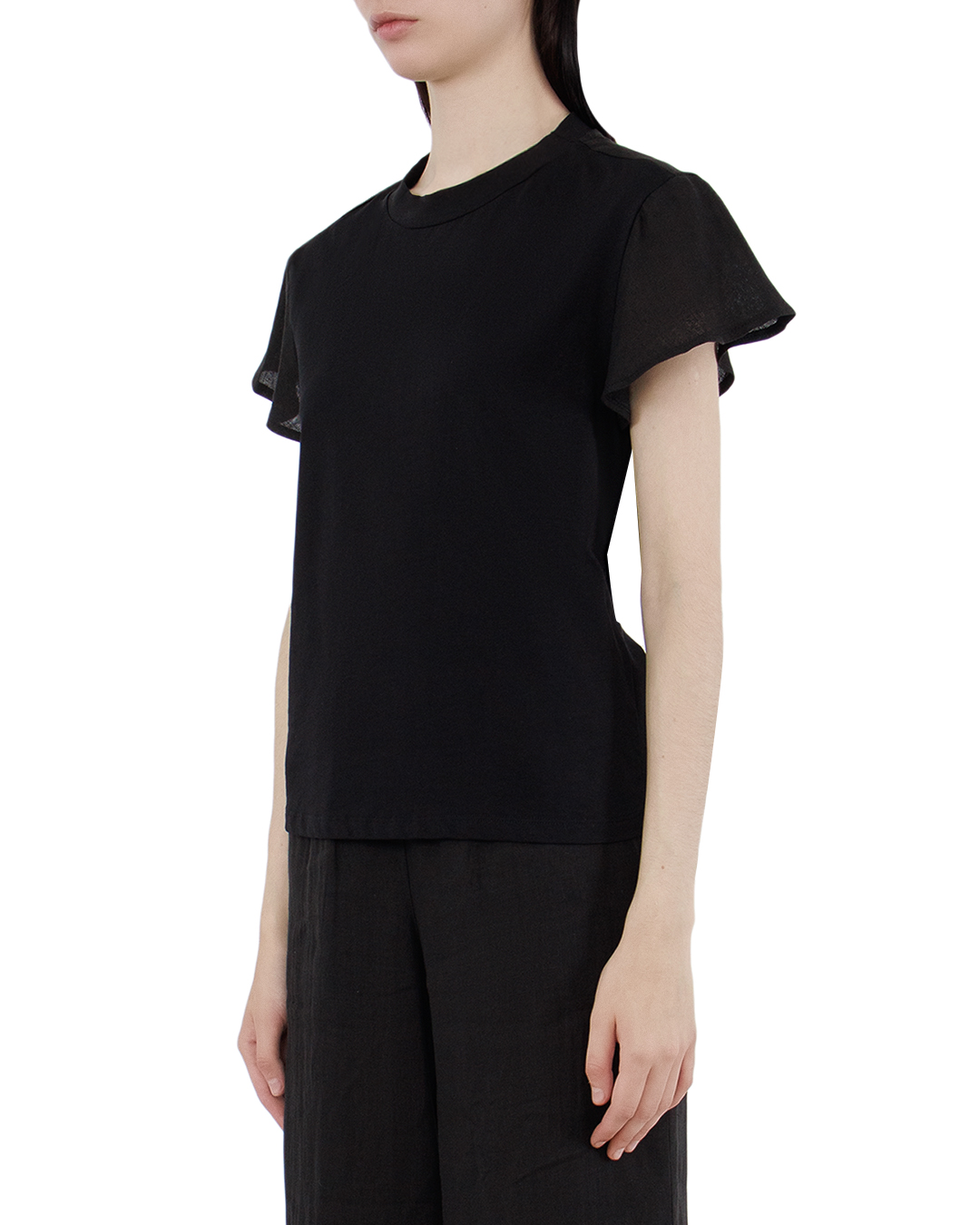 Эта блуза является олицетворением утончённого минимализма и изысканности. Выполненная в классическом черном цвете, она станет незаменимой частью любого гардероба, вписываясь в самые разнообразные стилистические направления. Фасон блузы акцентирован лаконичным силуэтом с деликатно подчеркнутыми плечами и свободным кроем, обеспечивающим комфорт и элегантность. Круглый вырез горловины подчеркивает линию шеи, добавляя образу аристократичности. Рукава — особая деталь этого изделия. Легкий волнистый край рукавов, выполненный из тонкой полупрозрачной ткани, придаёт образу легкость и женственность, добавляя нотки романтичности. Качественная ткань и аккуратная отделка швов говорят о высоком уровне исполнения. Эта блуза прекрасно комбинируется как с классическими юбками и брюками, так и с более повседневными джинсами, гарантируя стильный и современный вид в любой ситуации.