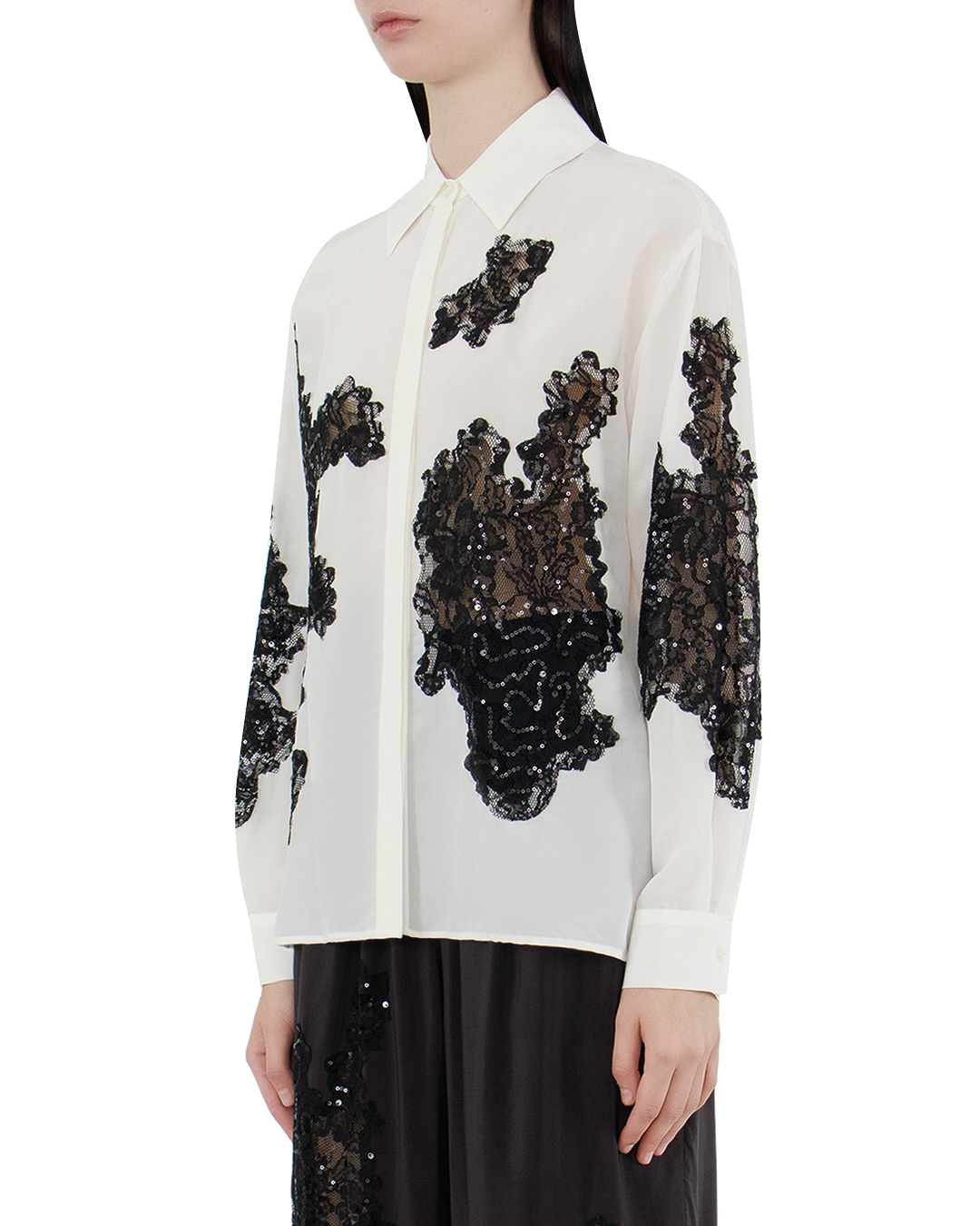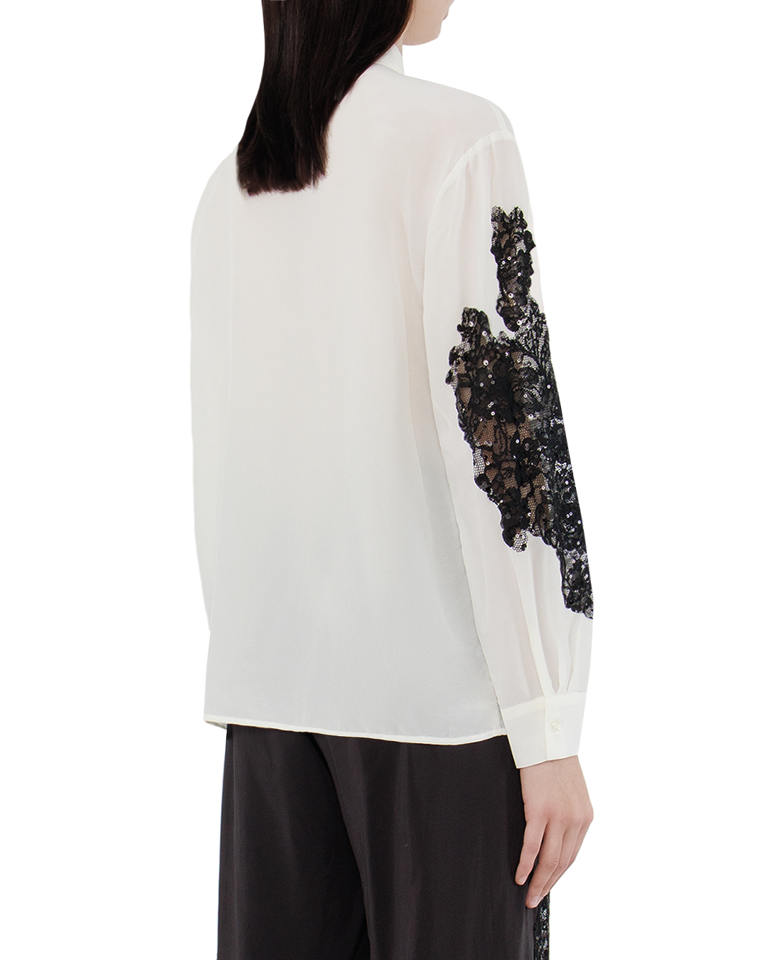 Эта блуза — истинное произведение искусства, воплощающее гармонию контрастов и изысканности. Она выполнена из мягкой и струящейся ткани нежного кремового оттенка, который служит идеальным фоном для роскошных черных кружевных аппликаций. Детали отделки поражают своим мастерством: кружевные вставки асимметрично расположены по поверхности блузы, придавая ей неповторимый шарм и драматичность. Эти аппликации создают объемный эффект, добавляя текстурности и игривости всему изделию. Классический отложной воротник и скрытая застежка на пуговицах поддерживают идею лаконичности, позволяя кружеву быть главным акцентом в дизайне. Длинные рукава завершаются манжетами на пуговицах, подчеркивающими элегантную линию рук. Продуманные швы и высококачественные материалы гарантируют непревзойденный комфорт и долговечность изделия. Эта блуза станет центральным элементом вашего вечернего гардероба, создавая образы, сочетающие в себе элегантность и изысканную смелость.