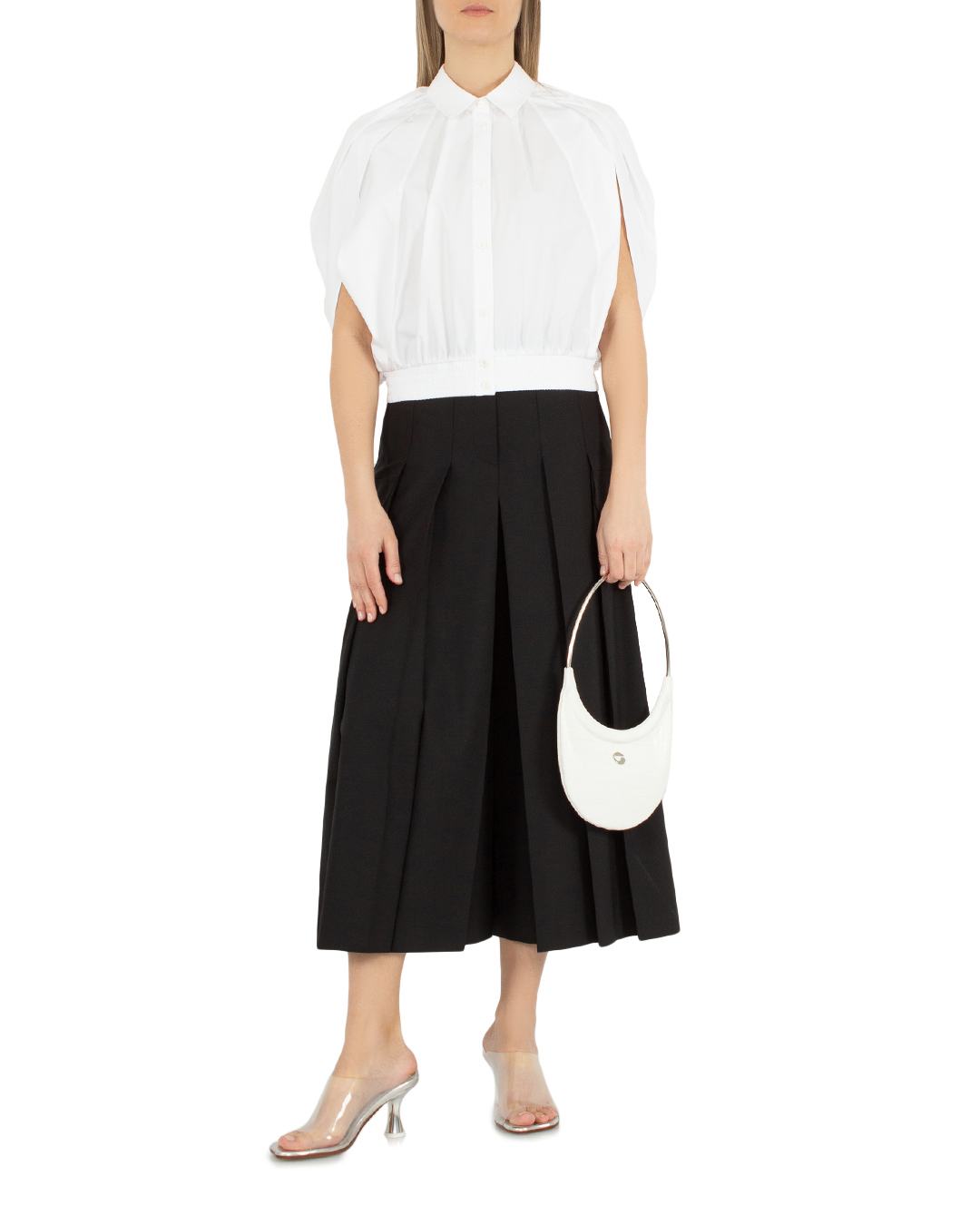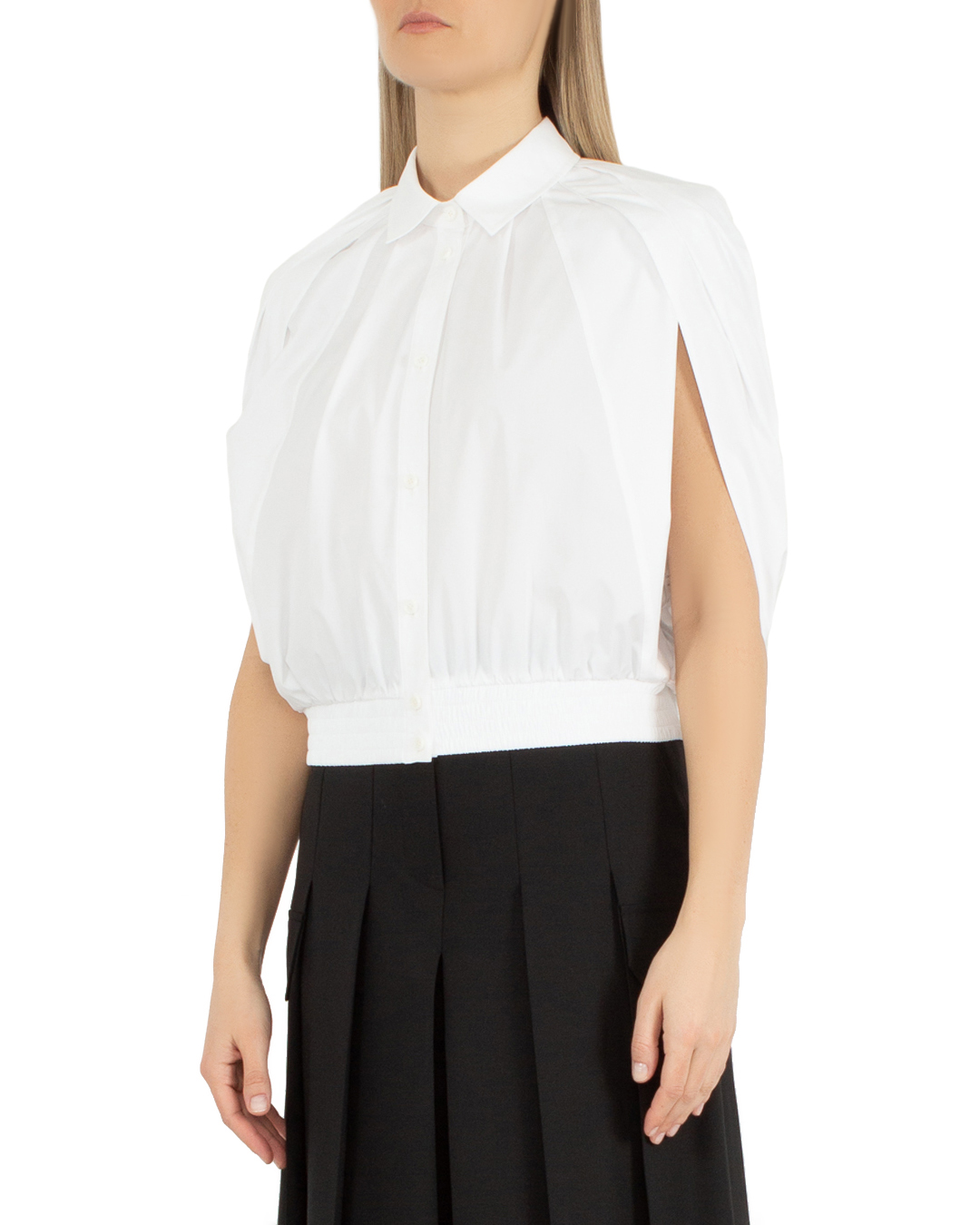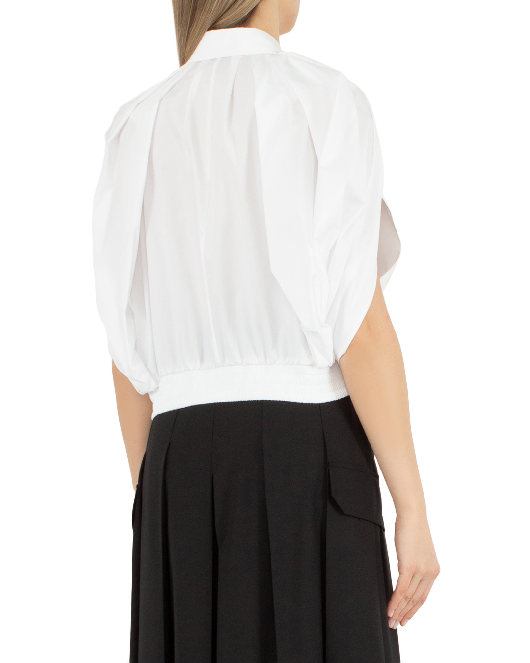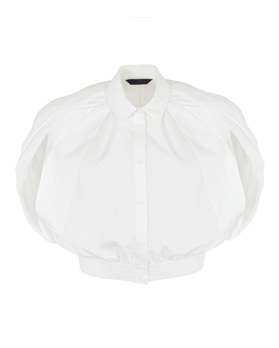 Блуза Juun.J из хлопка молочного оттенка. Модель объемного укороченного силуэта с застежкой на пуговицы и отложным воротником.